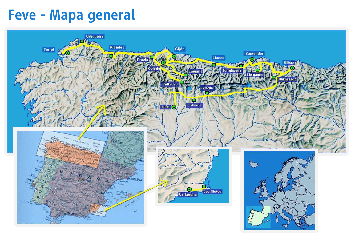 Este tren se llama FEVE, por sus siglas en español, Ferrocarril de Via Estrecha. Es una empresa pública que depende de RENFE, la empresa de trenes a nivel nacional. Fue creada el 23 de septiembre de 1965 y su función fue la de conectar tramos cortos a nivel nacional, en los que la red nacionalde trenes no podía llegar. El 31 de diciembre de 2012, FEVE se integró en la empresa RENFE para unificar a nivel nacional el transporte ferroviario.
