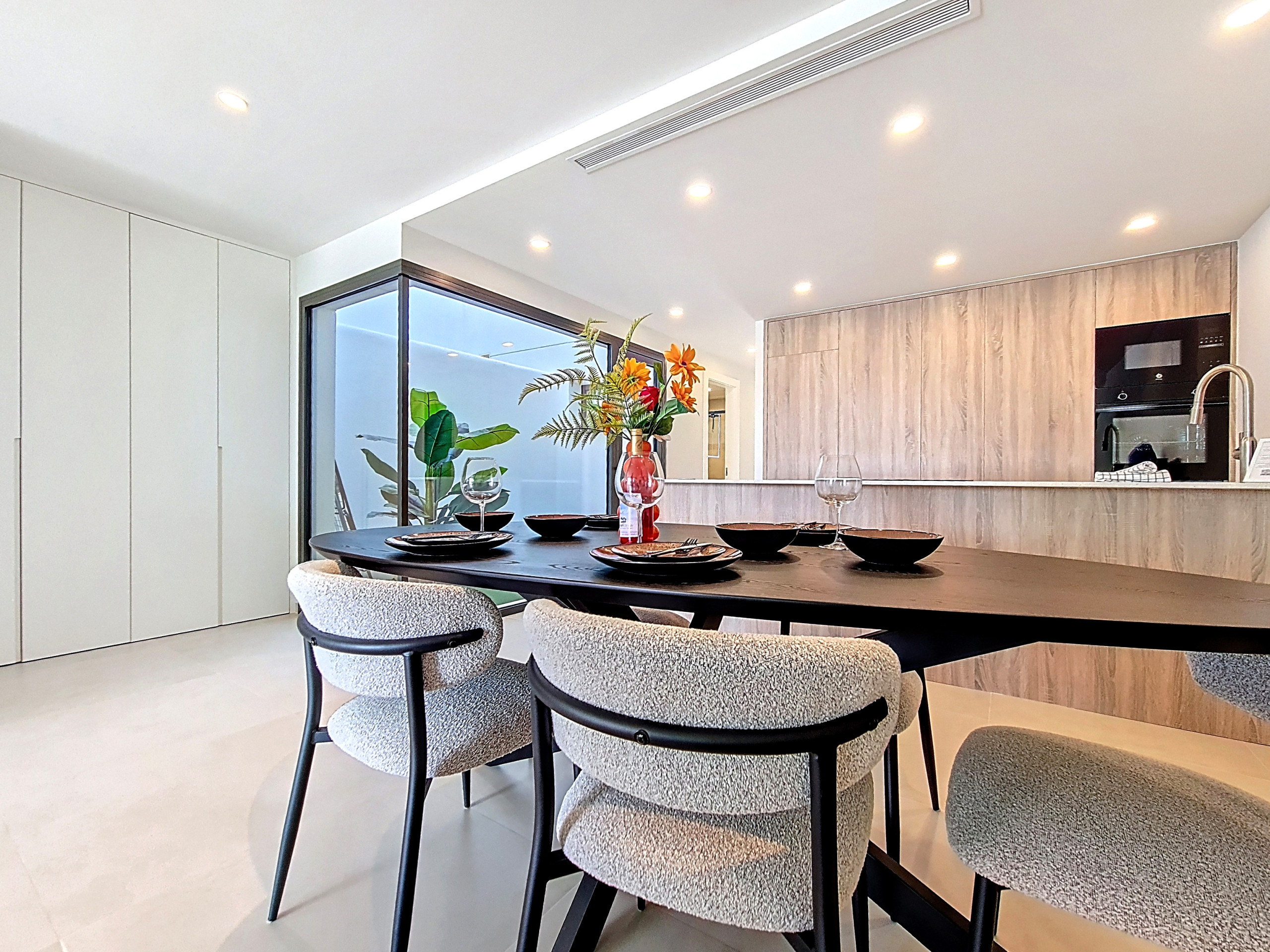 Die Küche ist komplett ausgestattet mit allem, was Sie für einen Selbstversorgerurlaub benötigen. Egal, ob Sie ein schnelles Frühstück oder ein komplettes Abendessen zubereiten, Sie finden alle Geräte und Utensilien, die Sie brauchen, darunter Kochfeld, Backofen, Mikrowelle, großen Kühl-/Gefrierschrank und Waschmaschine. Der Essbereich direkt neben der Küche ist perfekt, um gemeinsam Mahlzeiten zu genießen, mit einem stilvollen Tisch, an dem bequem vier Personen Platz finden.