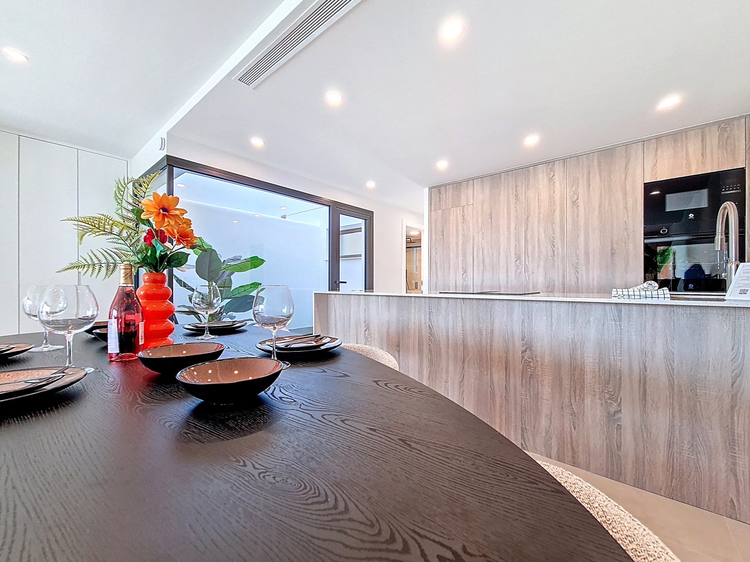 Große Glasschiebetüren lassen viel Licht herein und öffnen sich zu einem großen Balkon mit herrlichem Blick auf die Gemeinschaftsgärten und den Pool – perfekt zum Essen im Freien oder einfach zum Sonnenbaden.