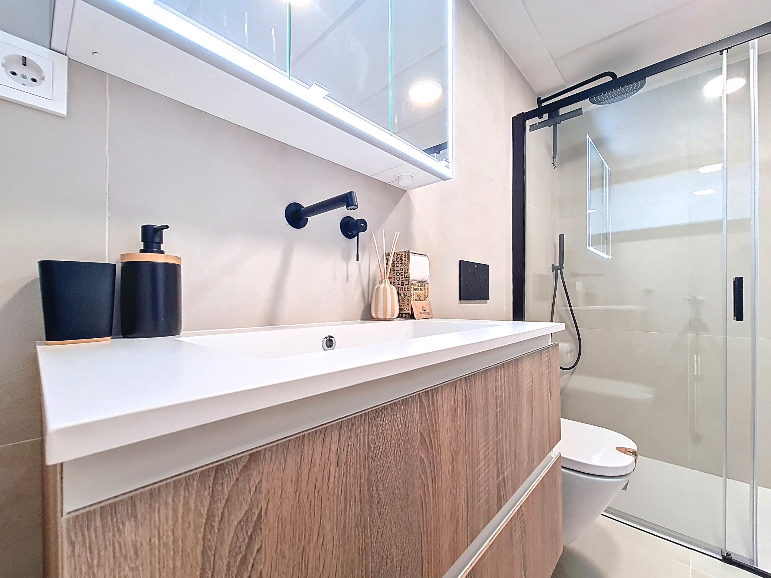Auf derselben Etage befindet sich ein großes Schlafzimmer mit eigenem Balkon, ausgestattet mit zwei bequemen Sesseln und einem kleinen Tisch. Ein separates, modernes Badezimmer mit ebenerdiger Dusche rundet das Raumangebot im ersten Stock ab. Im zweiten Stock befinden sich zwei weitere geräumige Schlafzimmer, eines davon mit eigenem Bad. Jedes Schlafzimmer verfügt über einen privaten Balkon mit Tisch und Stühlen – ideal für den morgendlichen Kaffee oder einen abendlichen Drink. Alle drei Schlafzimmer sind mit großen Kleiderschränken ausgestattet, und die hochwertige Einrichtung verleiht dem Apartment eine luxuriöse und einladende Atmosphäre.