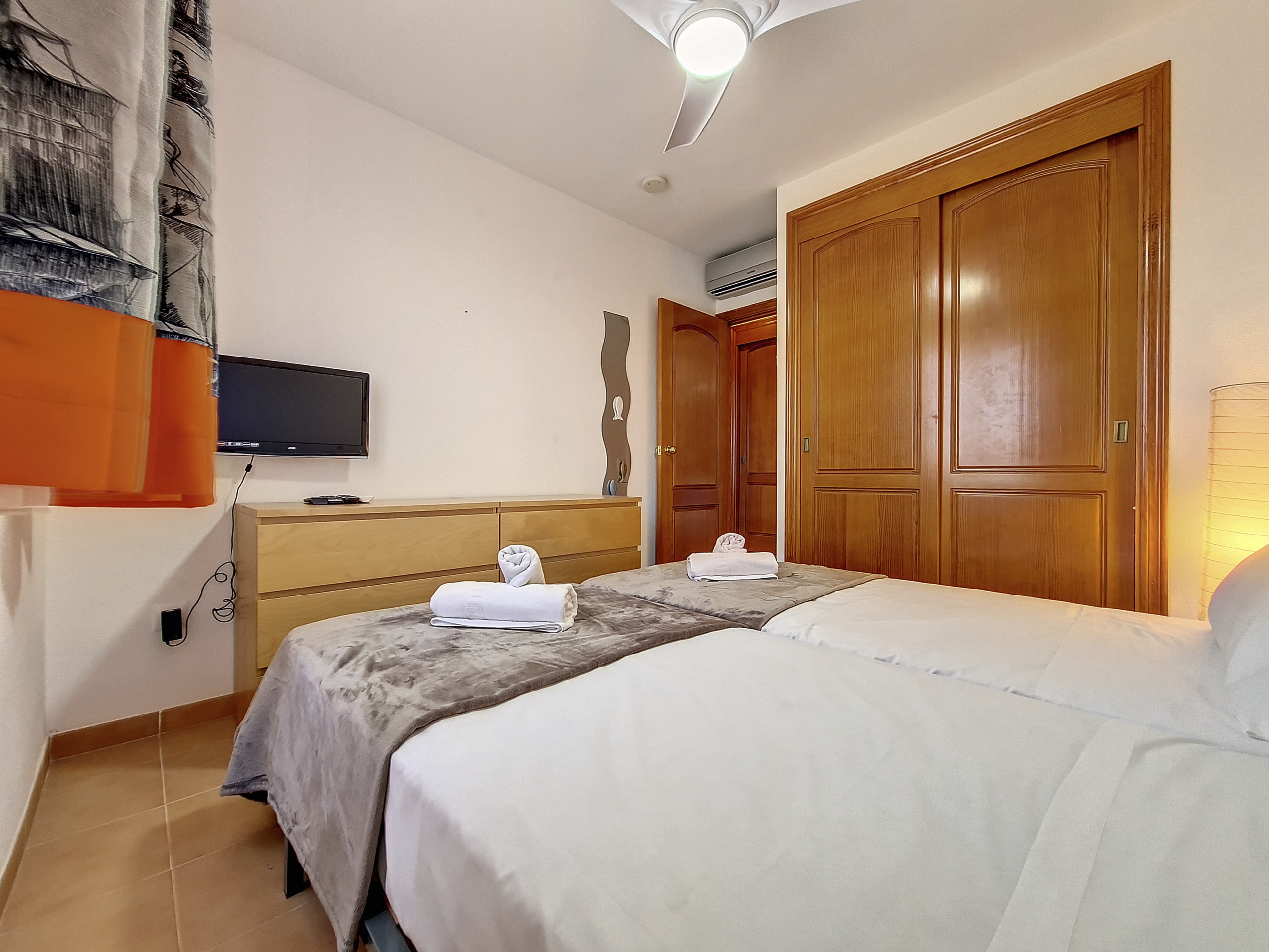 Dieses moderne Apartment befindet sich im Erdgeschoß der Anlage Ribera Beach in Mar de Cristal. Das Apartment besteht aus 2 Schlafzimmern, Badezimmer, voll ausgestatteter Küche, Wohn-/Speisezimmer und einen Balkon auf die Parkseite. Das Apartment verfügt über ein ausziehbares Sofa im Wohnzimmer und kann 6 Personen insgesamt beherbergen. Der Fernseher verfügt über spanische und englische Sender. Die Anlage verfügt über einen Gemeinschaftspool im Zentrum und befindet sich etwa 5 Minuten zu Fuß vom Strand.