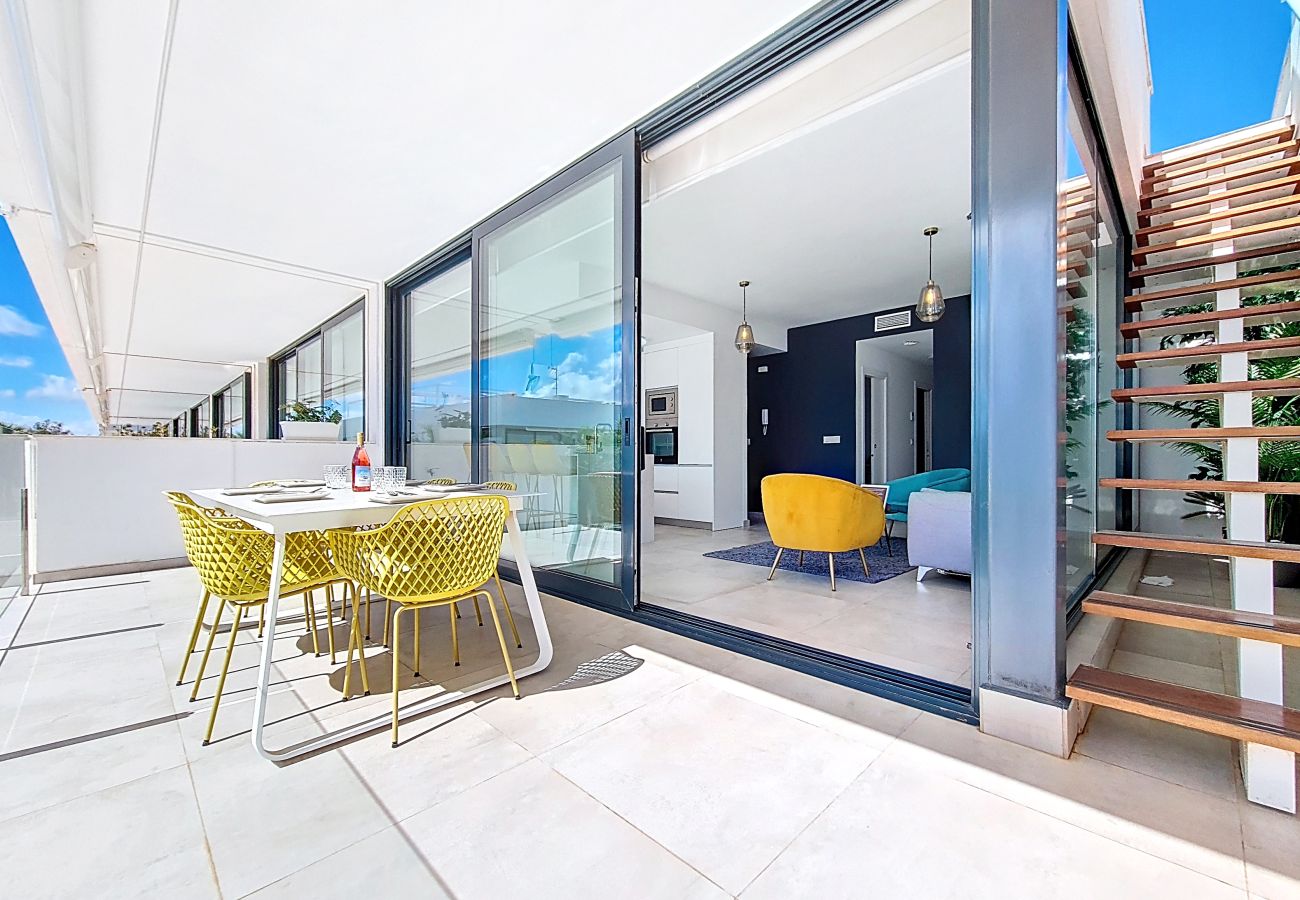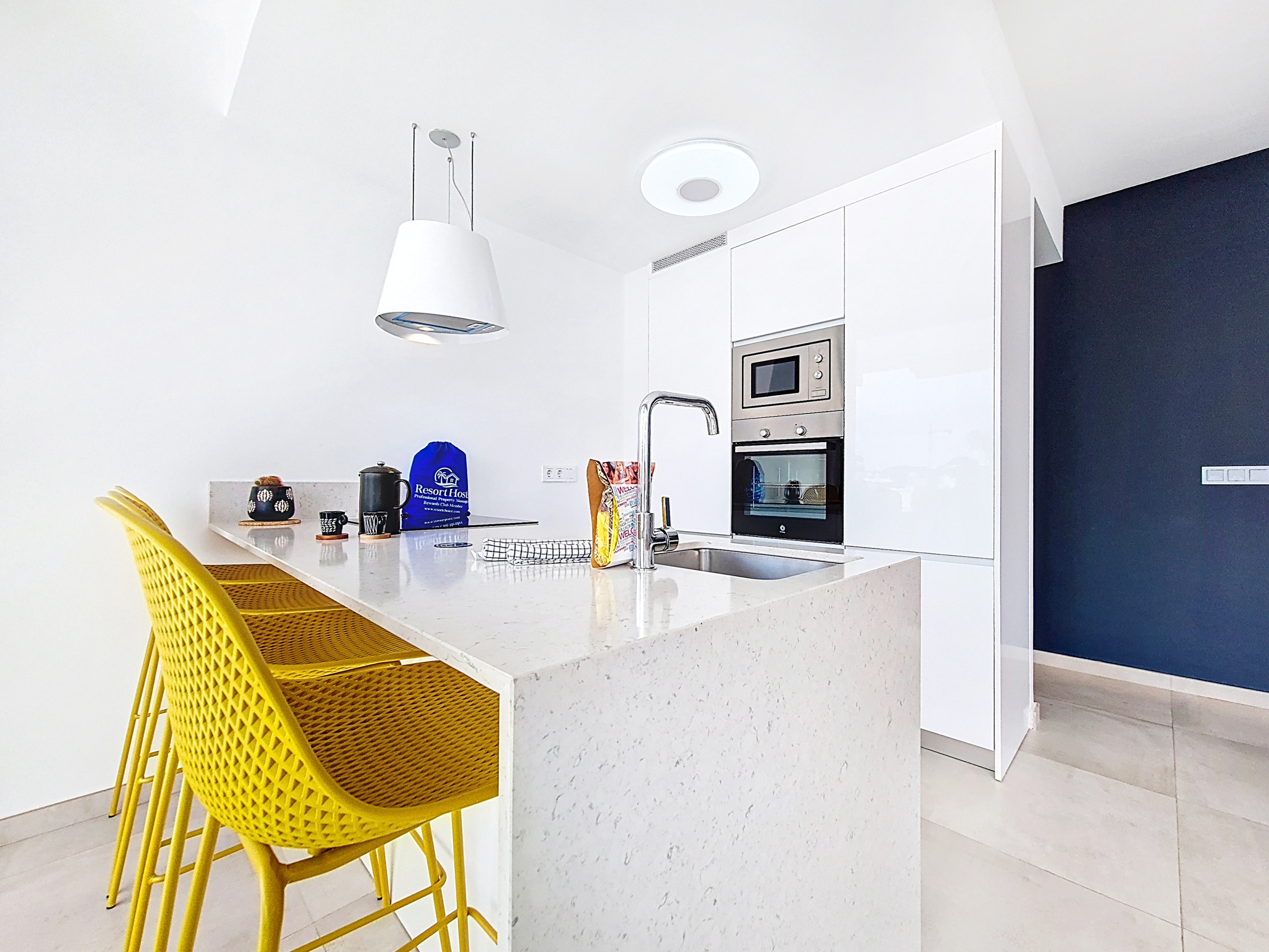 Dieses Penthouse-Apartment im modernen Stil verfügt über offene Räume mit Terrasse und Solarium. Das Apartment bietet Blick auf den Poolbereich und vom Solarium aus haben Sie Meer- und Bergblick. Es gibt ein großes offenes Wohnzimmer und eine voll ausgestattete Küche mit Kochinsel. Das Hauptschlafzimmer verfügt über einen begehbaren Kleiderschrank und ein eigenes Badezimmer, es gibt ein zweites Schlafzimmer und ein Familienbadezimmer. Die Wohnung verfügt außerdem über einen privaten Gemeinschaftseingang und einen Tiefgaragenstellplatz. Sie können zu Fuß zum Strand gehen, der nur 5 Minuten entfernt ist .