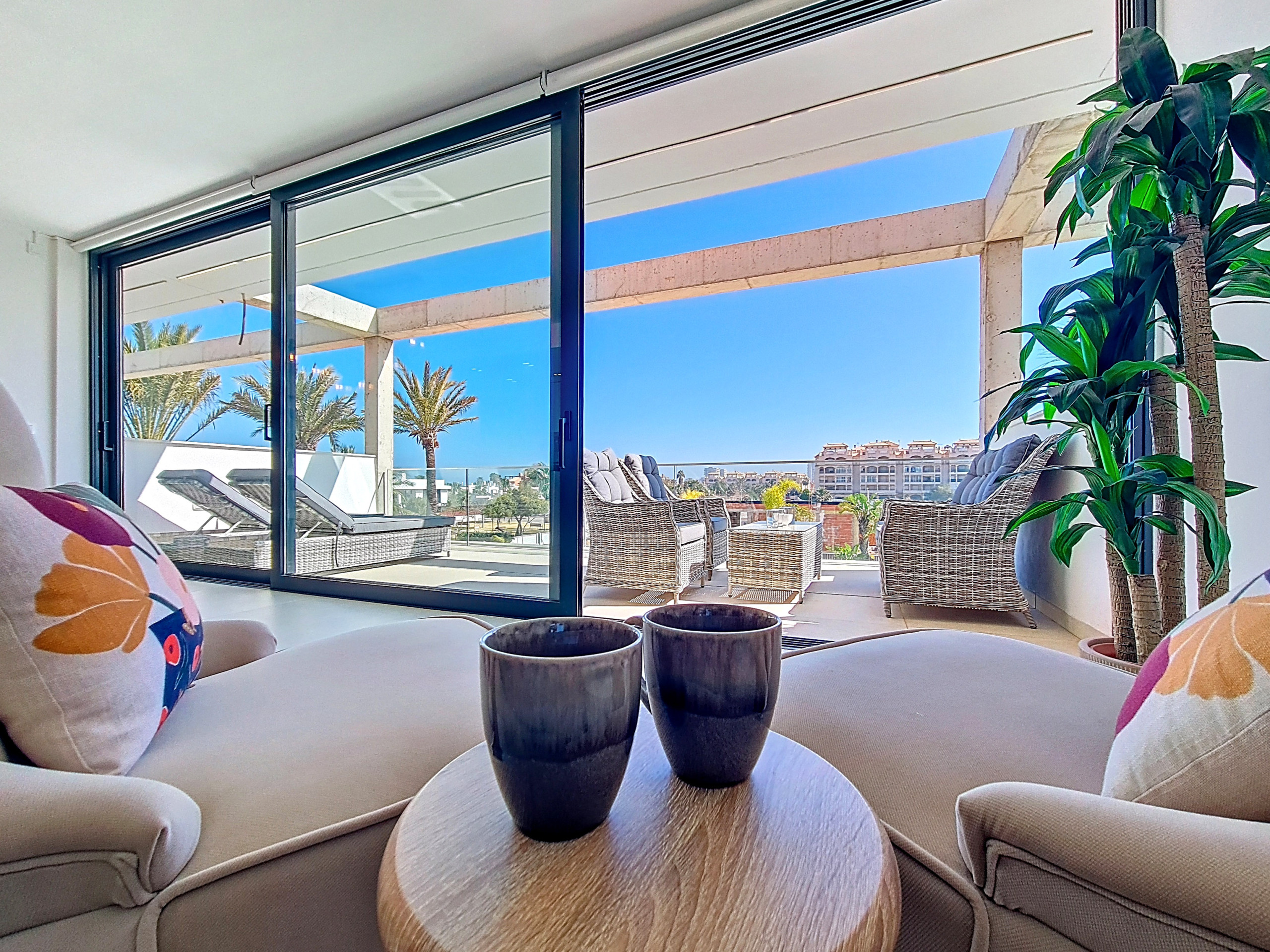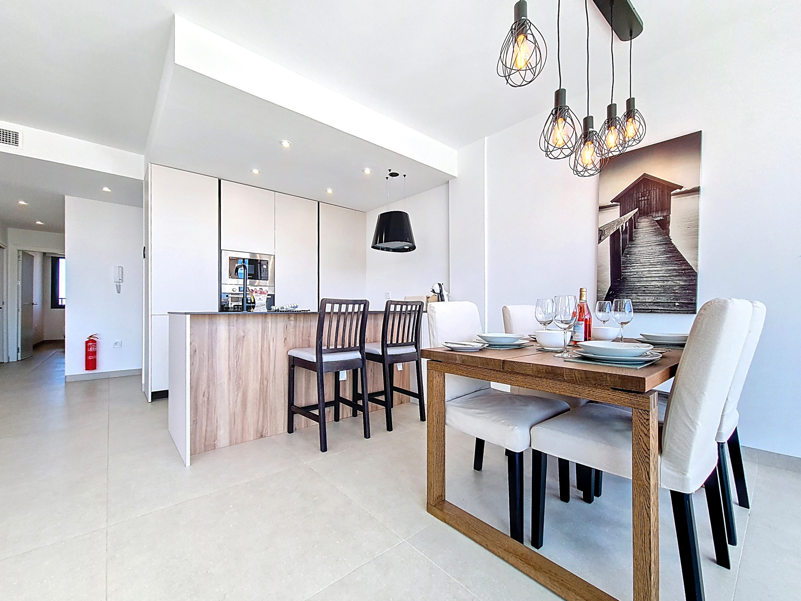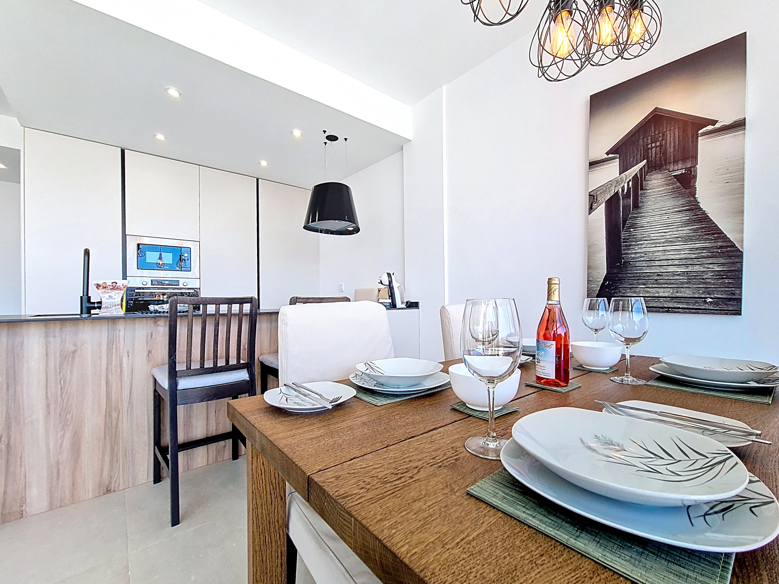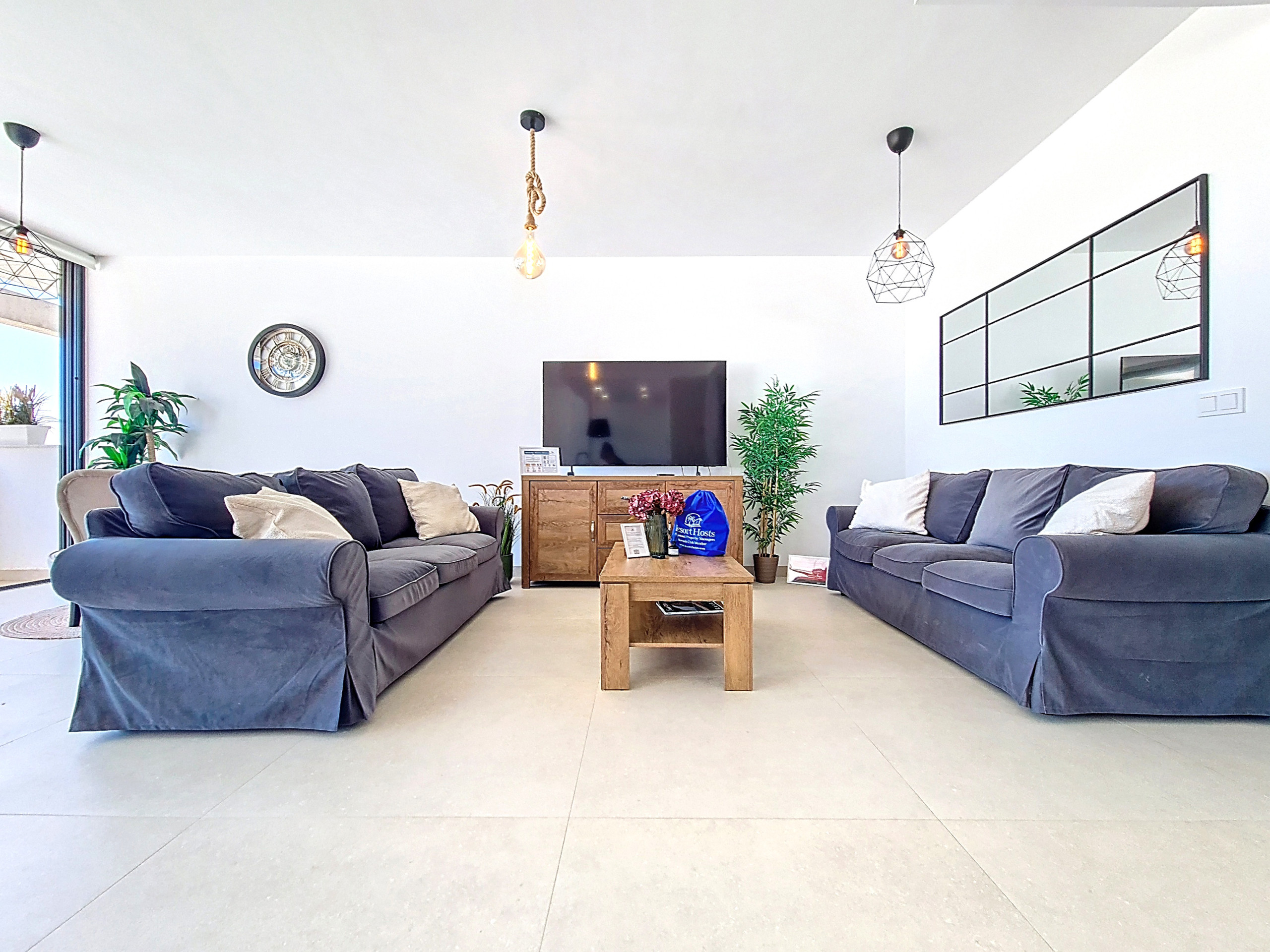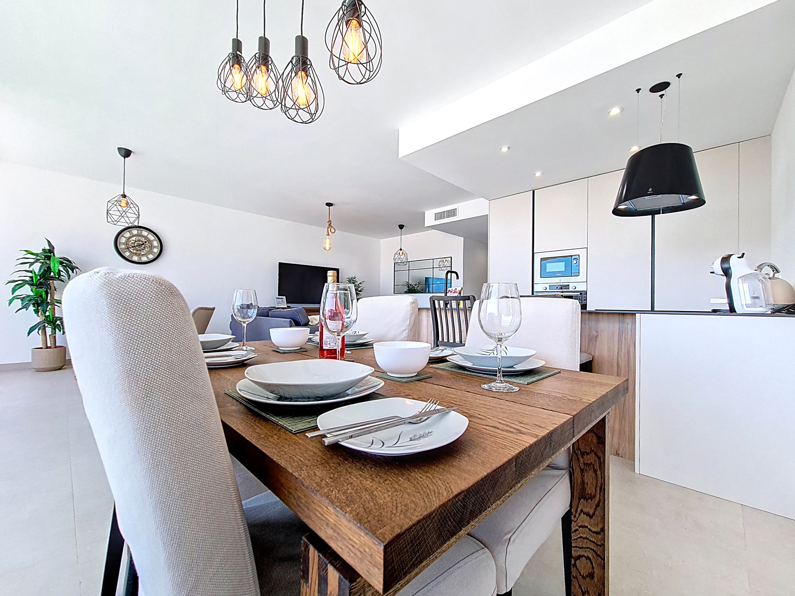 Der großzügige offene Wohnbereich verbindet Küche, Essbereich und Lounge zu einem hellen und geselligen Raum, der durch wunderschöne Beleuchtung noch aufgewertet wird. Die vollständig ausgestattete Küche verfügt über hochwertige Geräte und reichlich Stauraum, während der Esstisch und der Loungebereich gemütliche Räume für Mahlzeiten und Entspannung bieten. Die Lounge verfügt zudem über einen Smart-TV und kostenloses WLAN. Schiebetüren zum Patio öffnen sich zur geräumigen Terrasse, die mit Outdoor-Sitzgelegenheiten und Sonnenliegen ausgestattet ist und einen perfekten Platz zum Genießen der Sonne bietet.