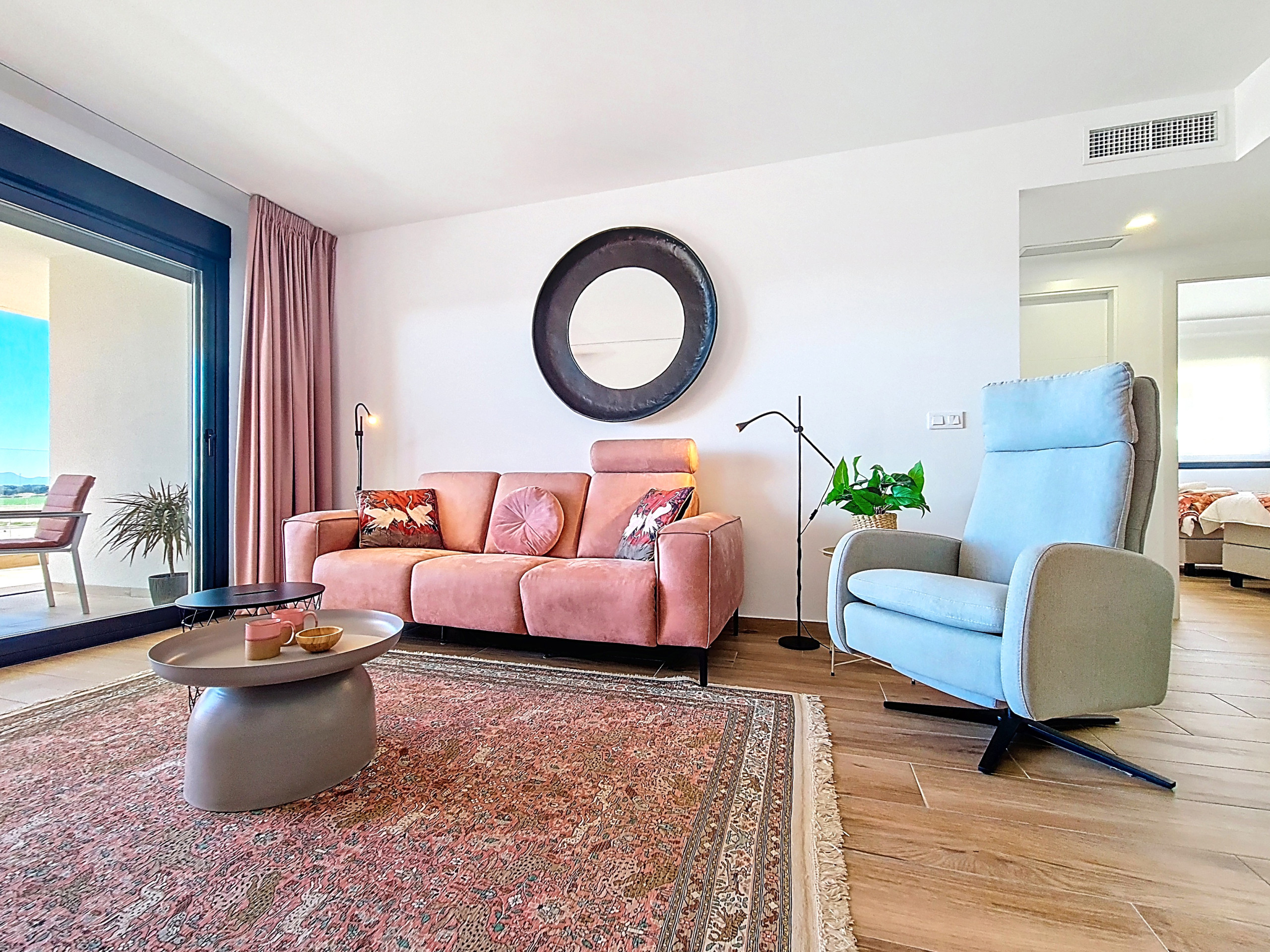 Das moderne und einladende Wohnzimmer ist mit einem bequemen Sofa und stilvollen Möbeln eingerichtet und schafft eine warme und einladende Atmosphäre. Ein großer Smart-TV sorgt für Unterhaltung, während breite Schiebetüren den Raum mit natürlichem Licht durchfluten und auf einen L-förmigen Balkon führen.