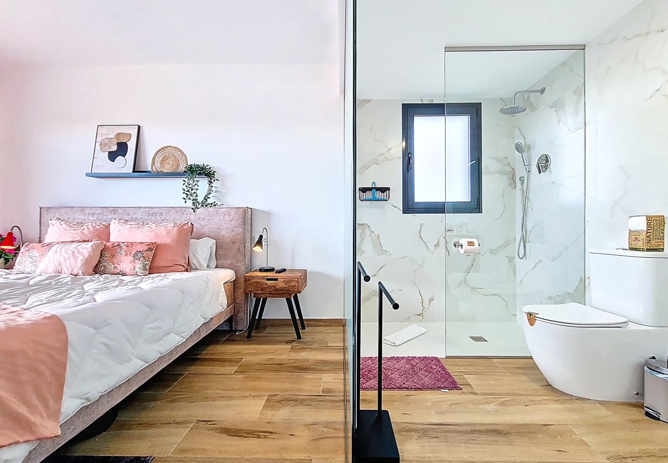 Das wunderschön eingerichtete Hauptschlafzimmer bietet mit seinem eigenen Bad und der geräumigen ebenerdigen Dusche eine Oase der Ruhe und des Stils. Die beiden anderen Schlafzimmer sind ebenso gut gestaltet und verfügen über elegante Möbel und viel Stauraum. Ein zweites modernes Badezimmer, ebenfalls mit ebenerdiger Dusche, befindet sich in idealer Lage.