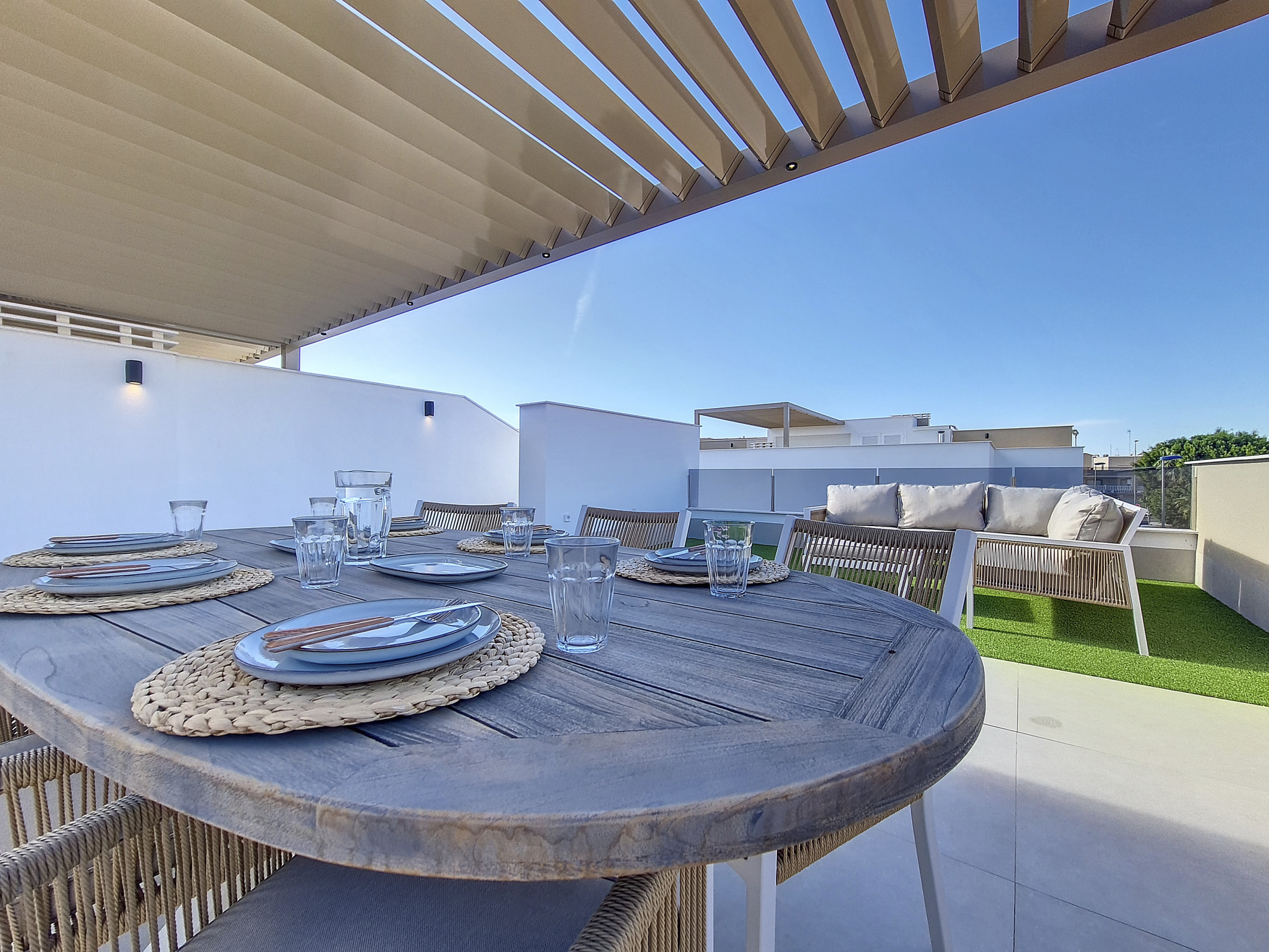 Erleben Sie den ultimativen Urlaub in diesem modernen Penthouse mit drei Schlafzimmern und zwei Badezimmern. Genießen Sie den geräumigen Wohnbereich und die beeindruckende private Dachterrasse von 78m2. Diese helle und moderne Wohnung bietet eine offene Grundrissgestaltung, eine voll ausgestattete Küche mit Geschirrspüler und Kaffeemaschine sowie ein komfortables Wohn- und Esszimmer mit einem großen Smart-TV. Schiebetüren führen zu einer gemütlichen Terrasse mit Treppen zur wunderschönen Dachterrasse, ideal zum Entspannen oder zum BewirgDiero-en verberasse verfügt über einen komfortablen Sitzbereich, einen großen Esstisch und eine Außenküche mit Kühlschrank, Kochfeld und Spüle, die hinter elektrischen Rollläden verborgen ist.