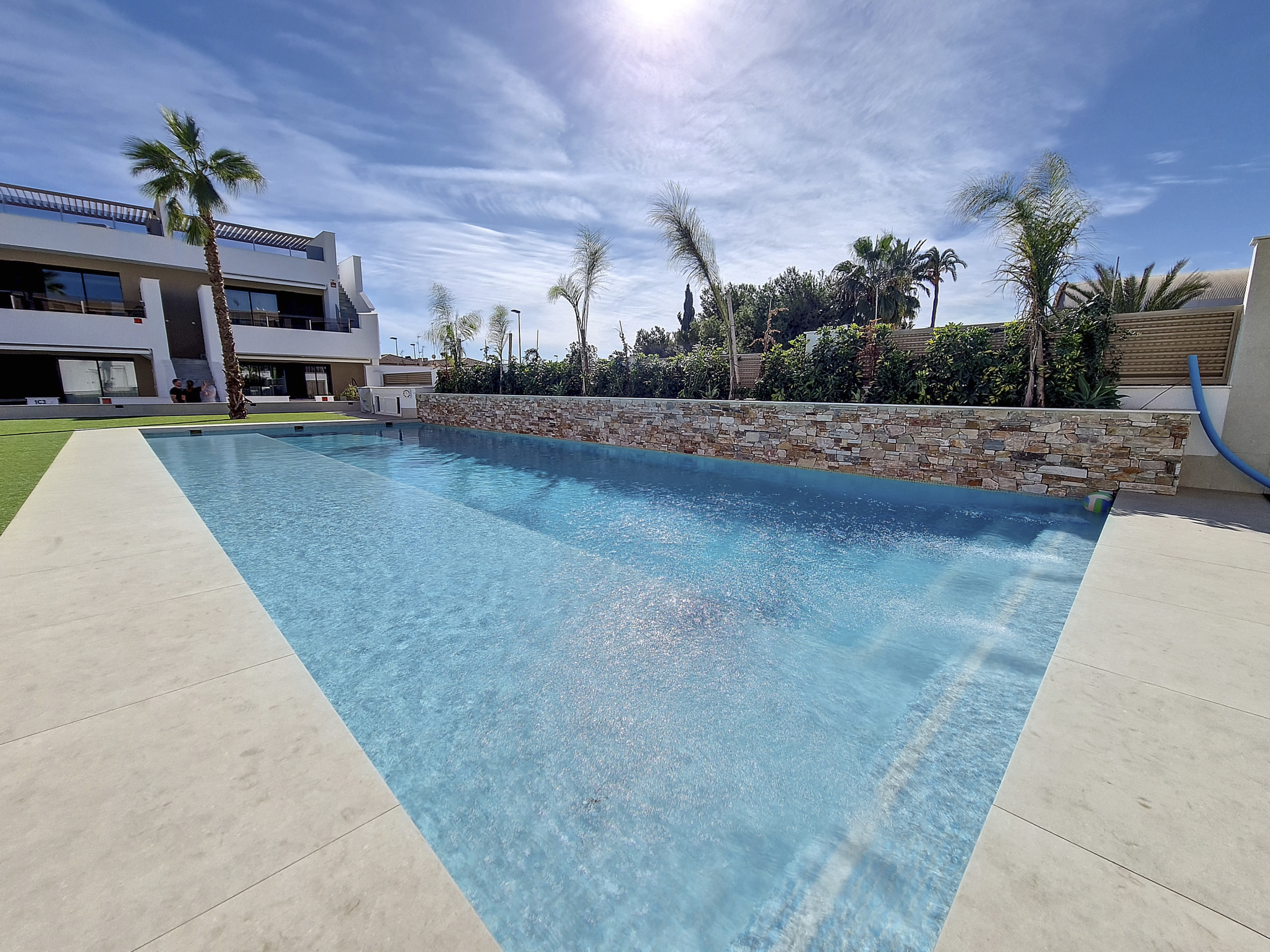 Das Hauptschlafzimmer mit direktem Zugang zur Terrasse verfügt über ein eigenes Badezimmer mit einer begehbaren Dusche und viel Stauraum. Das zweite und dritte Schlafzimmer sind geräumig und hell, mit ausreichend Stauraum. Ein zweites modernes Badezimmer bietet zusätzliche Annehmlichkeiten. Der Gemeinschaftspool im Herzen des Komplexes ist perfekt zum Abkühlen und Sonnenbaden. Ideal für Familien, Freunde oder Paare, die nach einem stilvollen und gut ausgestatteten Ferienhaus suchen.