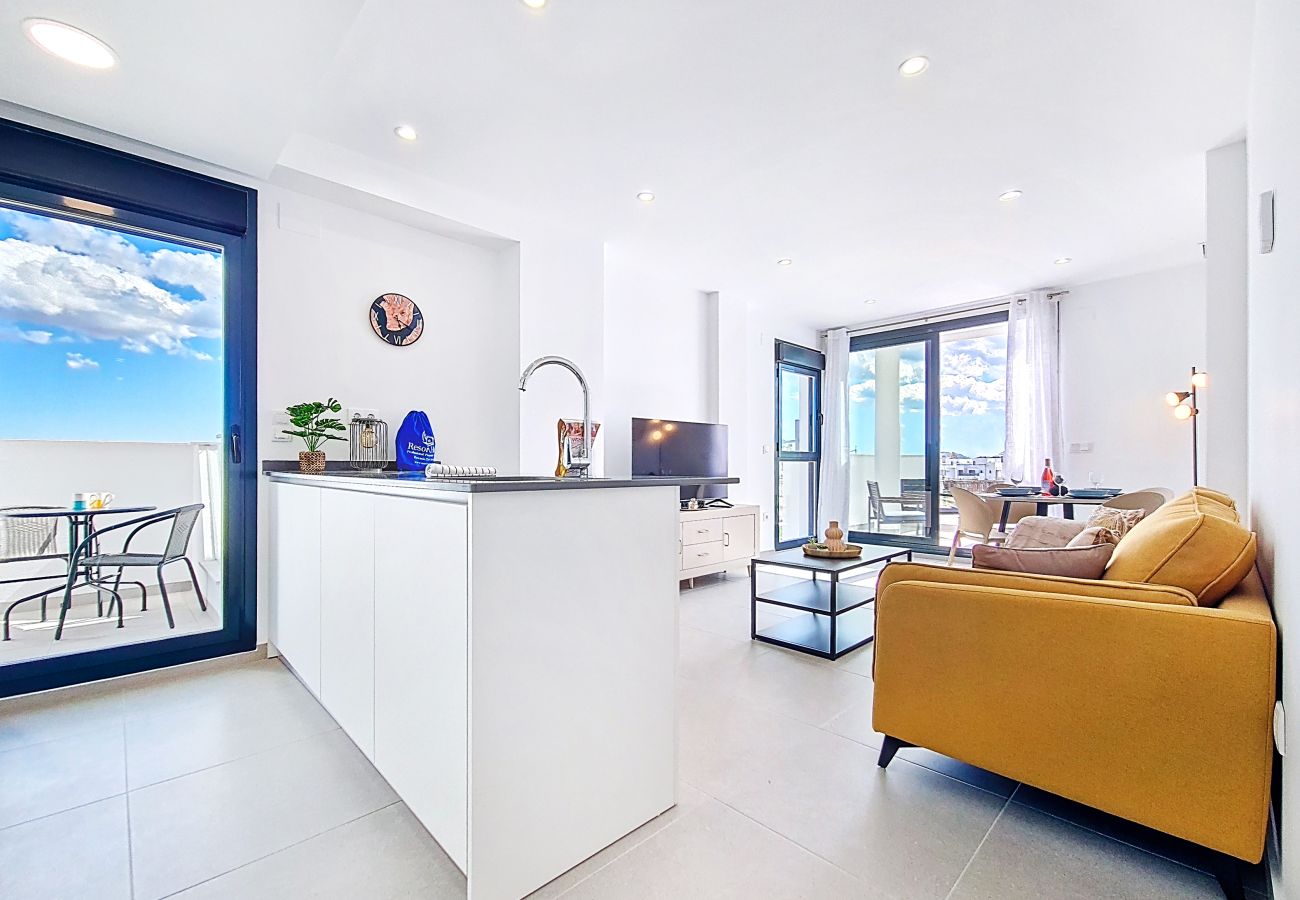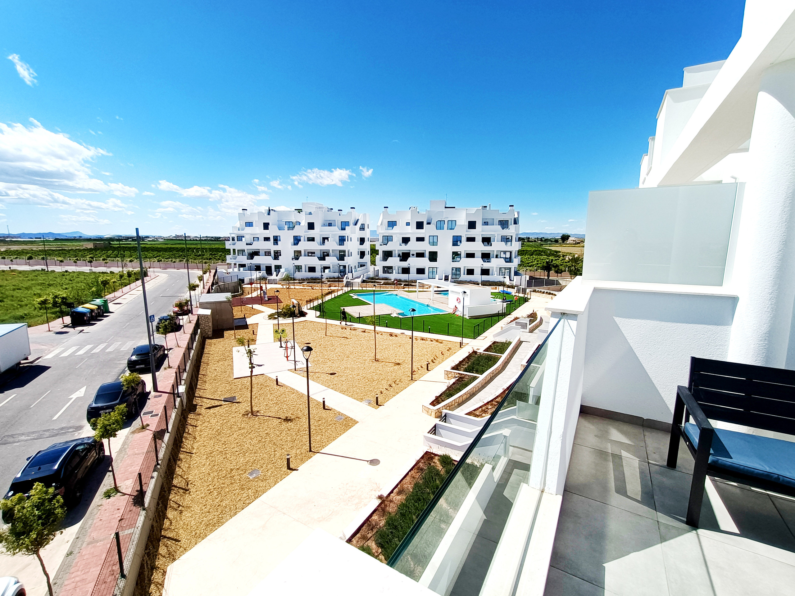 Im Inneren erwartet Sie ein geräumiger und heller, offener Wohn-, Ess- und Küchenbereich mit eleganten, modernen Oberflächen. Schiebetüren öffnen sich zu einem privaten Balkon mit gemütlicher Sitzecke. Dieser entspannende Raum eignet sich perfekt für einen Morgenkaffee oder zum Entspannen mit Blick auf die Anlage, die umliegende Landschaft und den Gemeinschaftspool.