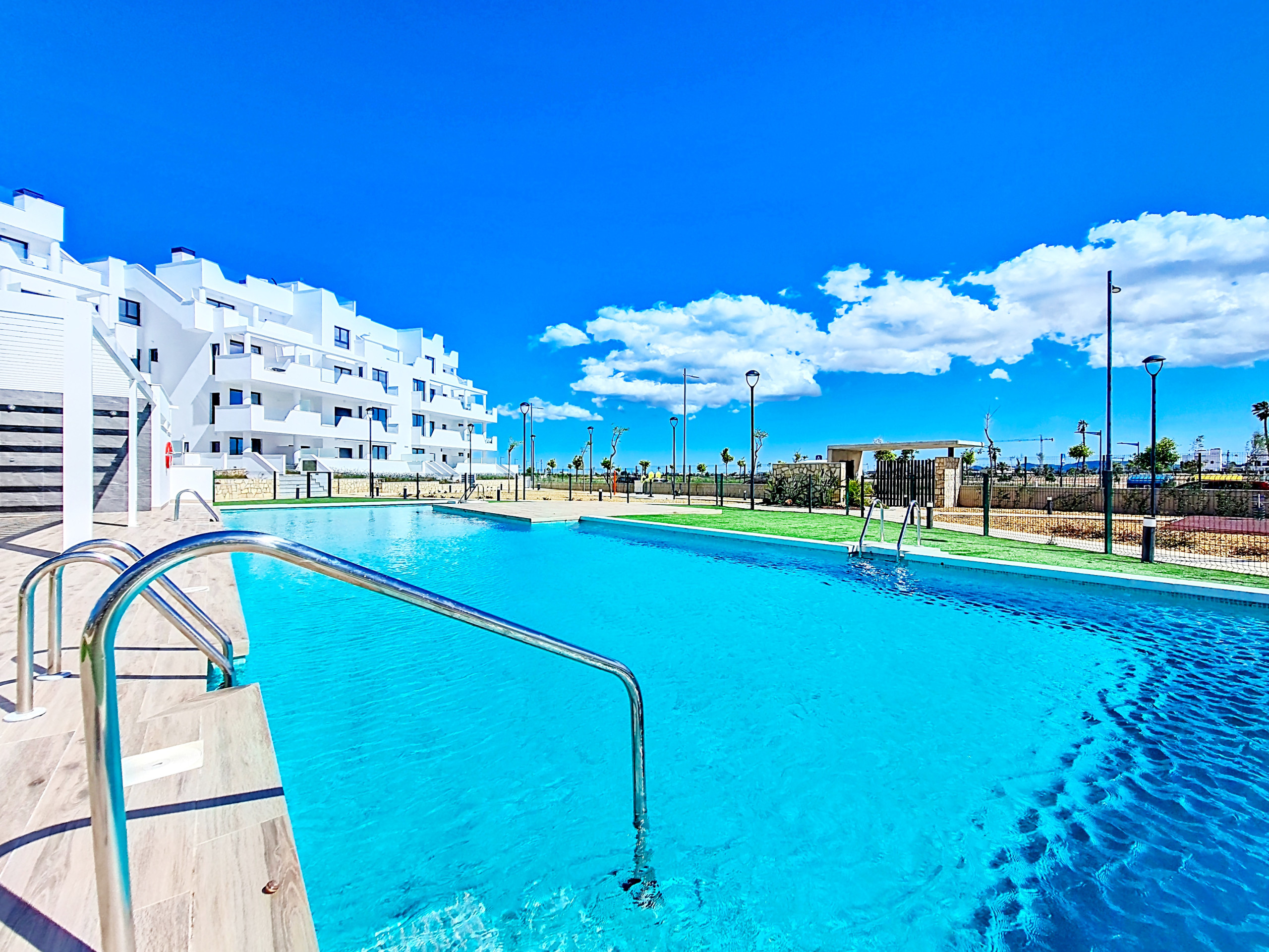 Das helle und geschmackvoll eingerichtete Hauptschlafzimmer verfügt über ein eigenes Bad mit ebenerdiger Dusche und Zugang zum zweiten Balkon. Das zweite Schlafzimmer, ebenso hell und einladend, ist ideal für Kinder oder Gäste. Ein elegantes Gästebad, ebenfalls mit ebenerdiger Dusche, befindet sich zwischen den beiden Schlafzimmern und bietet zusätzlichen Komfort. Dieses stilvolle Apartment bietet moderne Annehmlichkeiten wie Klimaanlage, Smart-TV und Highspeed-WLAN, damit Sie während Ihres Aufenthalts angenehm kühl und verbunden bleiben. Das Apartment bietet Zugang zu einem gepflegten Gemeinschaftspool mit Whirlpool und Kinderbecken. Außerdem gibt es einen kleinen Fitnessraum im Freien und einen Kinderspielplatz. Es ist der perfekte Ort, um sich abzukühlen oder mit Familie oder Freunden unter der mediterranen Sonne zu entspannen.