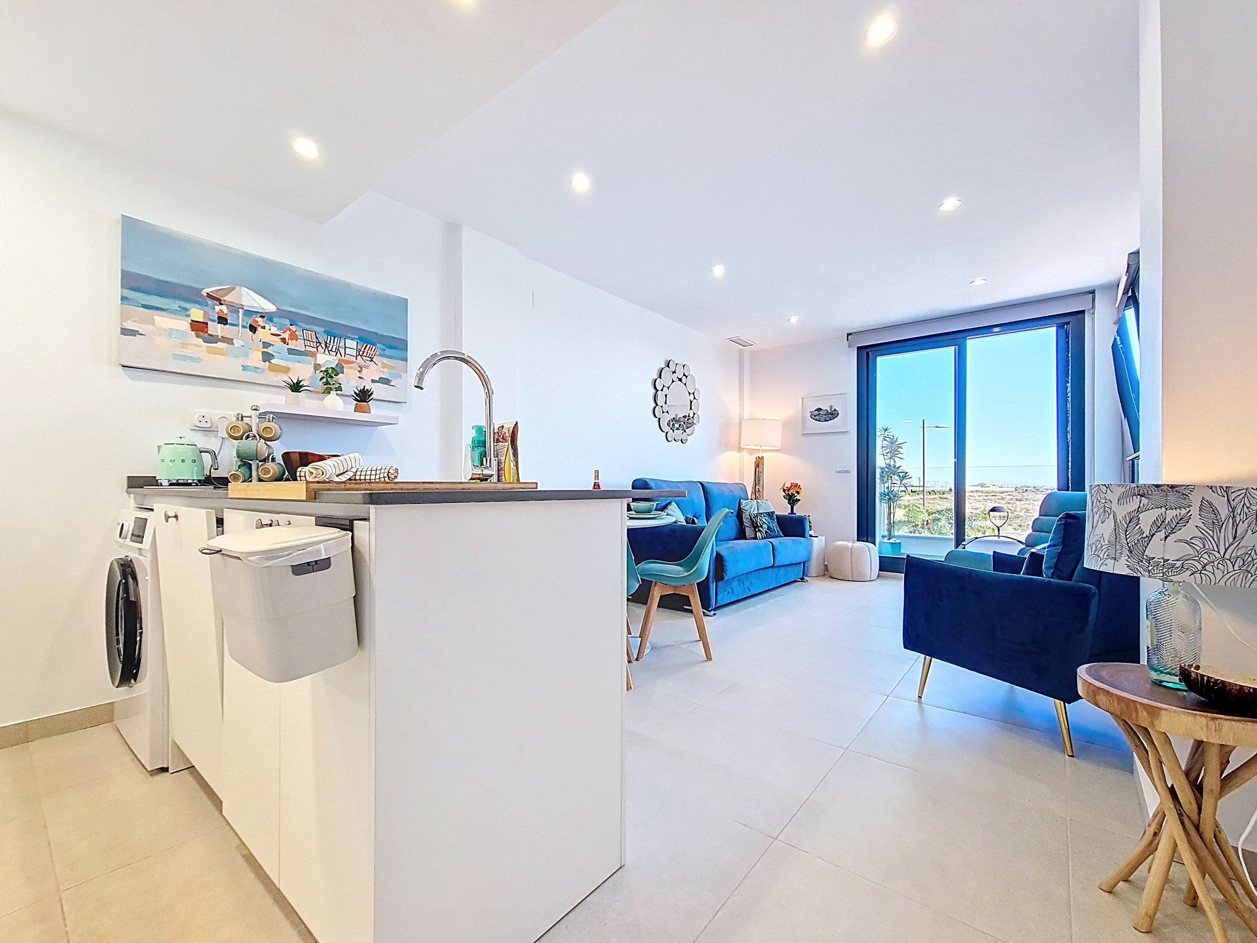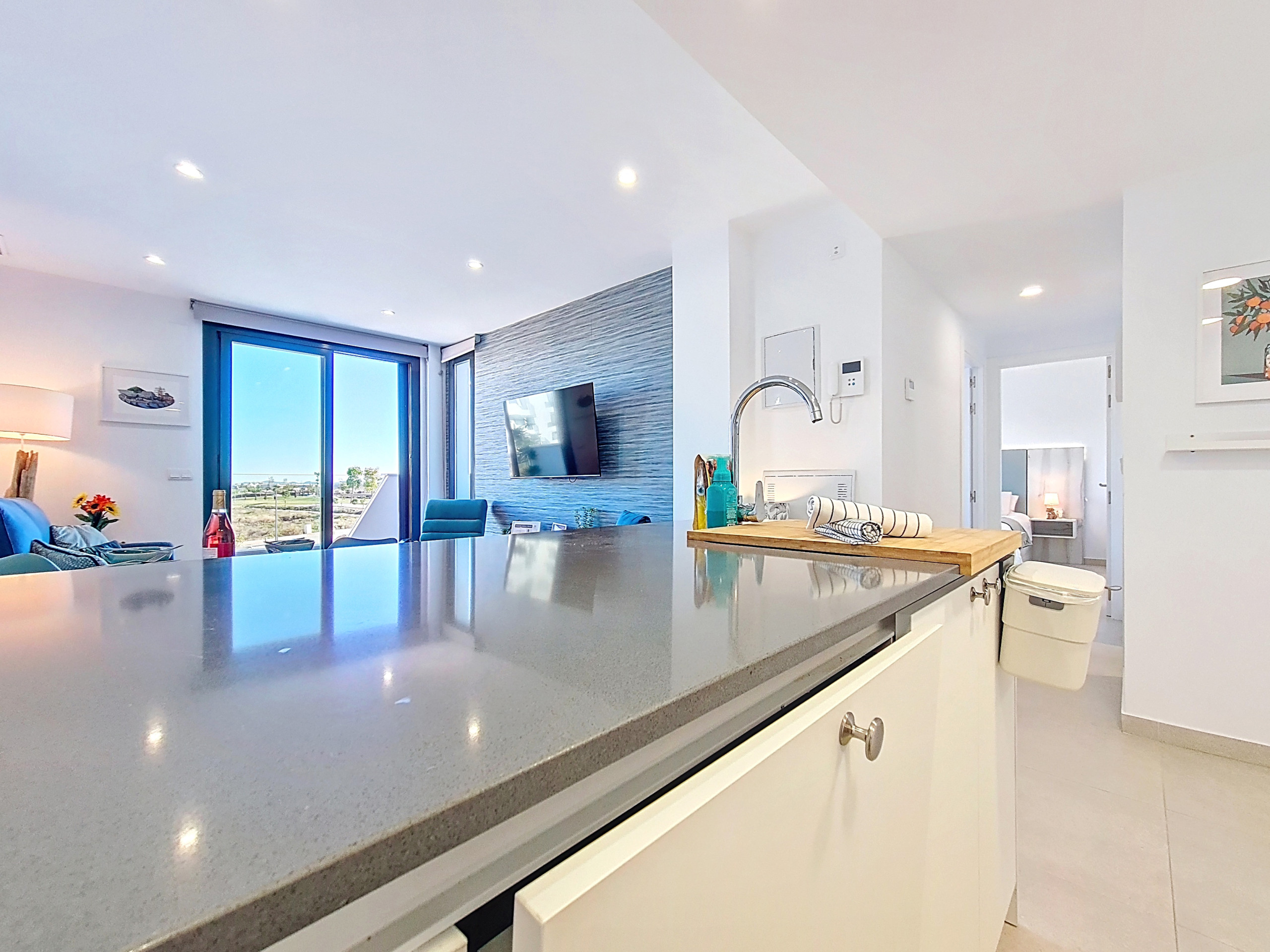 Im Inneren erwartet Sie ein geräumiger und heller, offener Wohn-, Ess- und Küchenbereich mit eleganten, modernen Oberflächen. Schiebetüren öffnen sich zu einem privaten Balkon mit gemütlicher Sitzecke. Dieser entspannende Raum eignet sich perfekt für einen Morgenkaffee oder zum Entspannen mit Blick auf die Anlage, die umliegende Landschaft und den Gemeinschaftspool.
