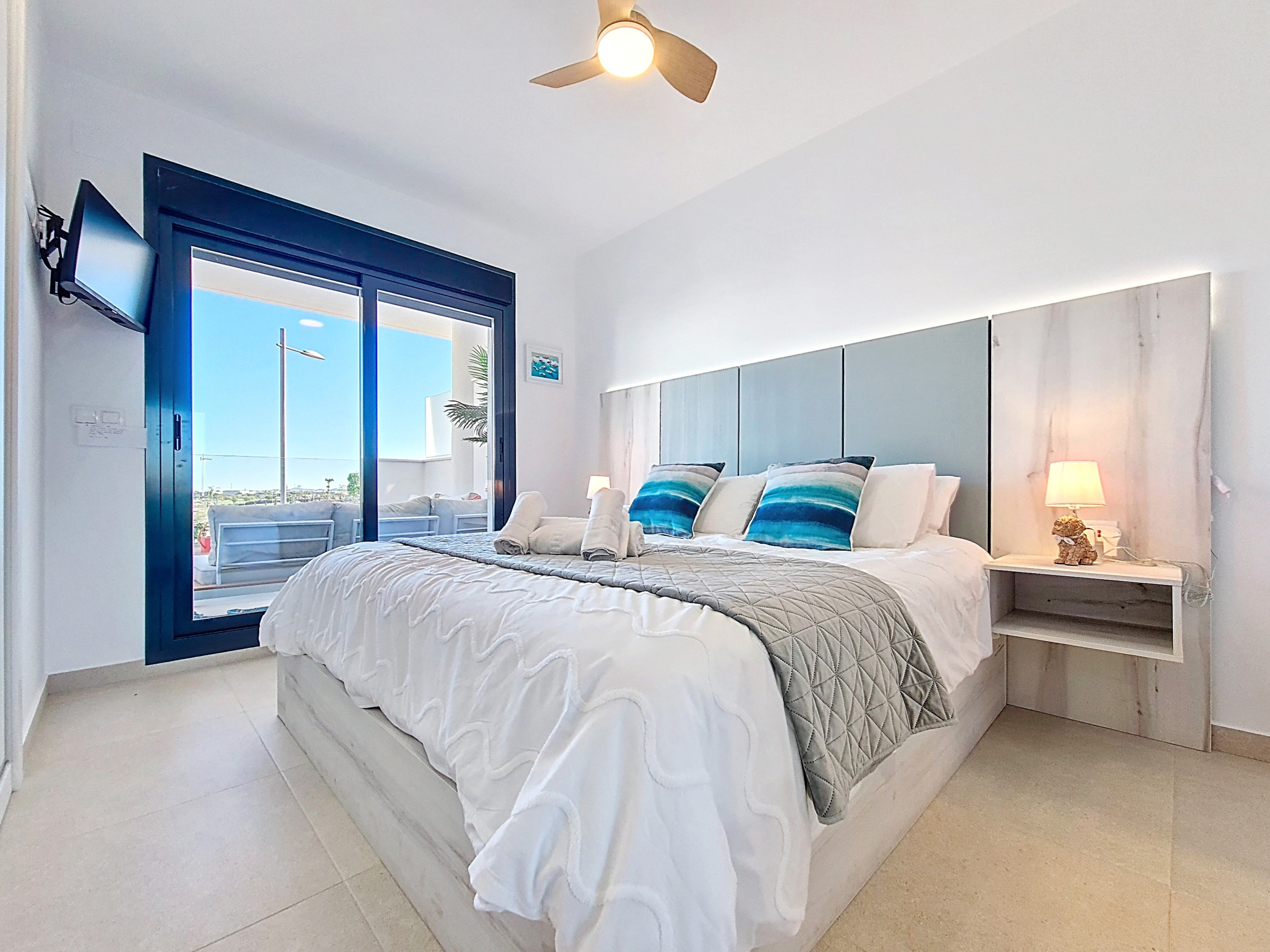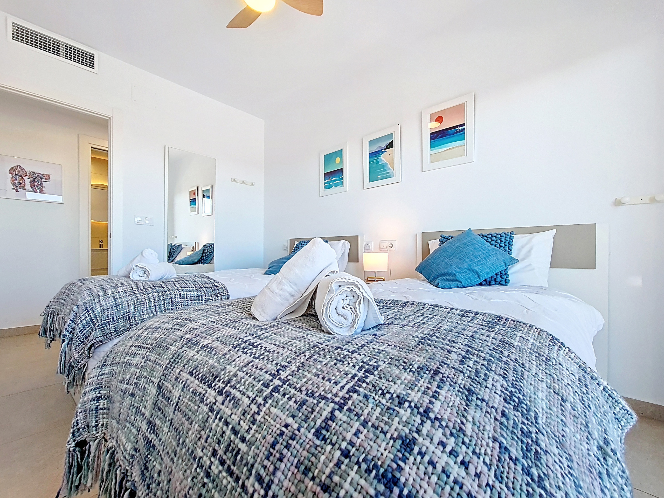 Das helle und geschmackvoll eingerichtete Hauptschlafzimmer verfügt über ein eigenes Bad mit ebenerdiger Dusche und Zugang zum zweiten Balkon. Das zweite Schlafzimmer, ebenso hell und einladend, ist ideal für Kinder oder Gäste. Ein elegantes Gästebad, ebenfalls mit ebenerdiger Dusche, befindet sich zwischen den beiden Schlafzimmern und bietet zusätzlichen Komfort. Dieses stilvolle Apartment bietet moderne Annehmlichkeiten wie Klimaanlage, Smart-TV und Highspeed-WLAN, damit Sie während Ihres Aufenthalts angenehm kühl und verbunden bleiben. Das Apartment bietet Zugang zu einem gepflegten Gemeinschaftspool mit Whirlpool und Kinderbecken. Außerdem gibt es einen kleinen Fitnessraum im Freien und einen Kinderspielplatz. Es ist der perfekte Ort, um sich abzukühlen oder mit Familie oder Freunden unter der mediterranen Sonne zu entspannen.