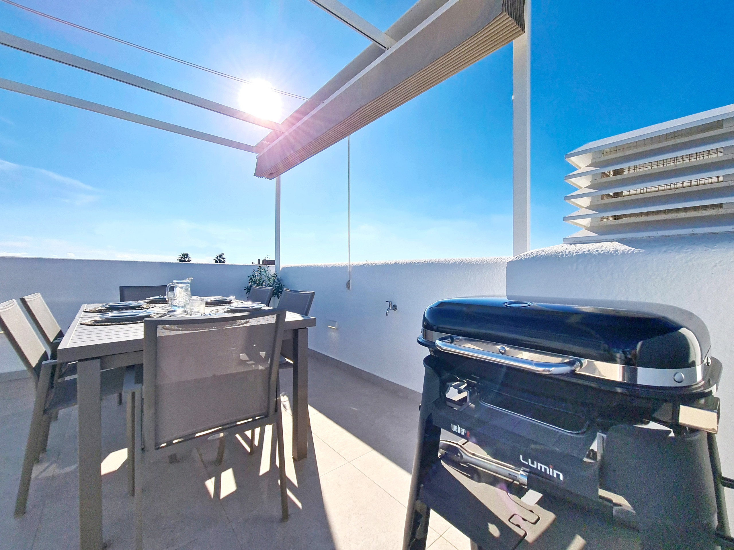 Eines der größten Pluspunkte der Villa ist ihre private Dachterrasse mit einer komfortablen Sitzecke, einem großen Esstisch und einem Grill: ein idealer Ort zum Entspannen, um Gäste zu empfangen oder lange, ruhige Nachmittage unter der spanischen Sonne zu genießen.