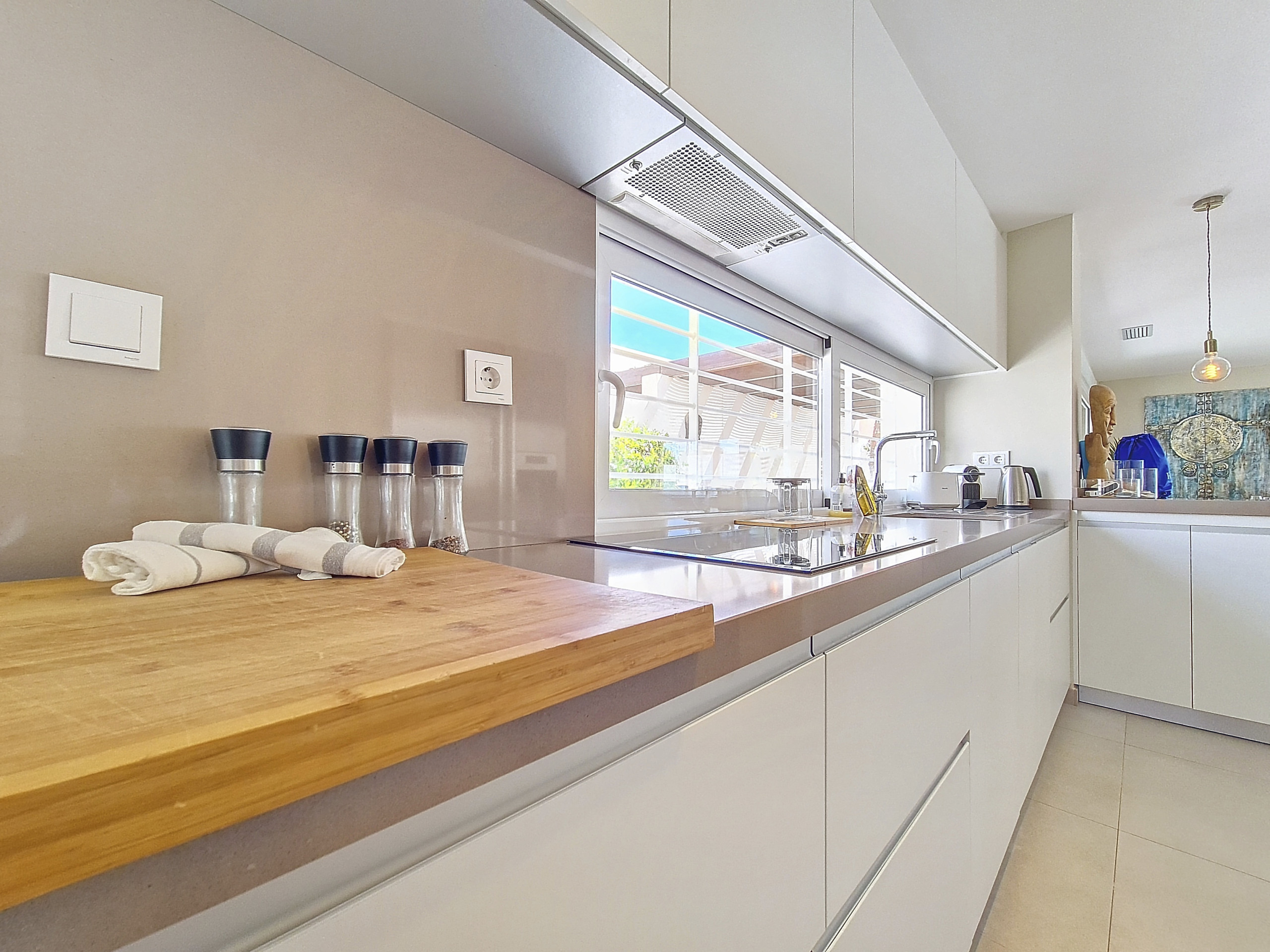 Die voll ausgestattete Küche ist modern und elegant. Durch eine Schiebetür entsteht ein separater Wohnraum, der alles bietet, was Sie für Ihren Urlaubsaufenthalt benötigen.