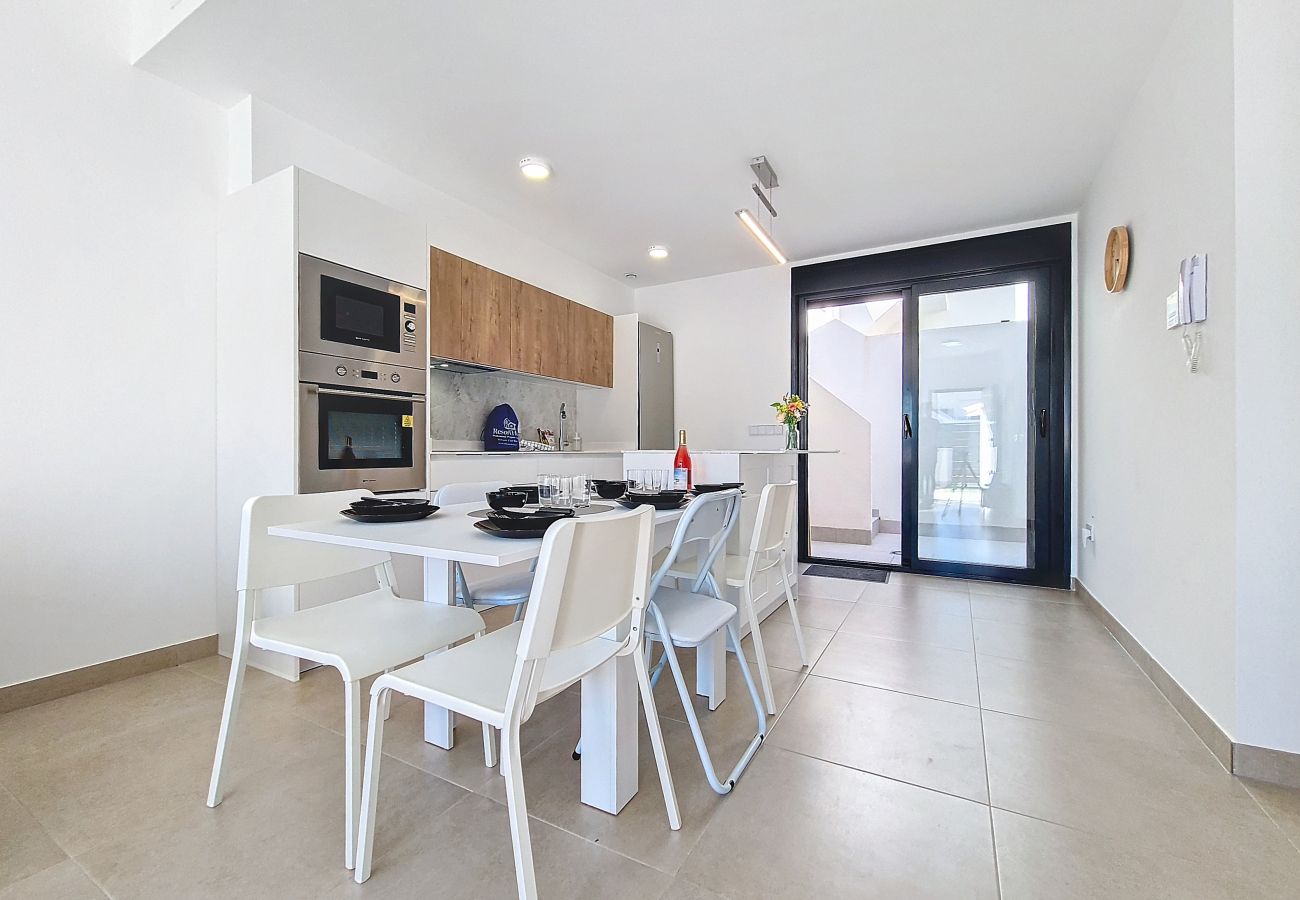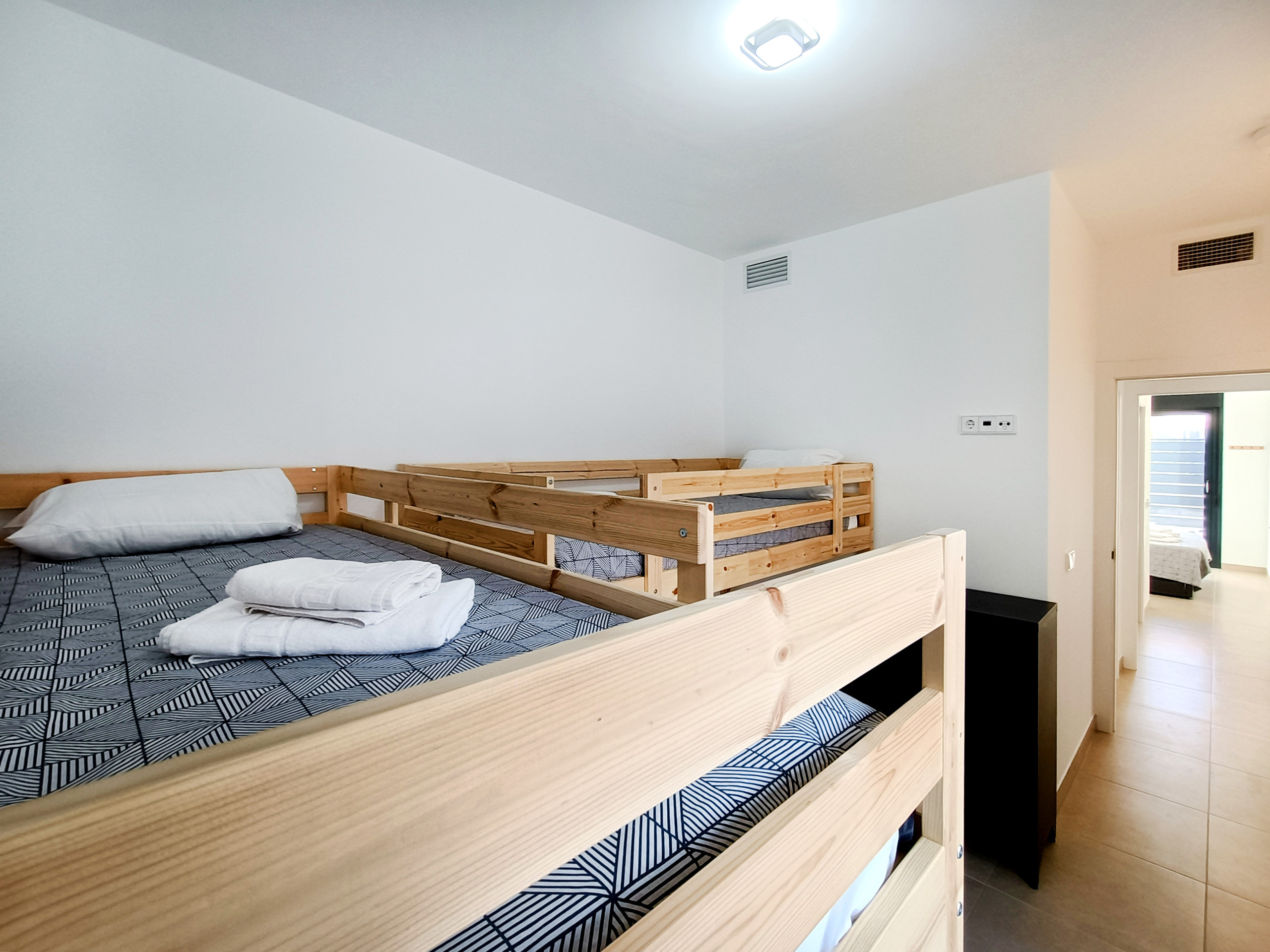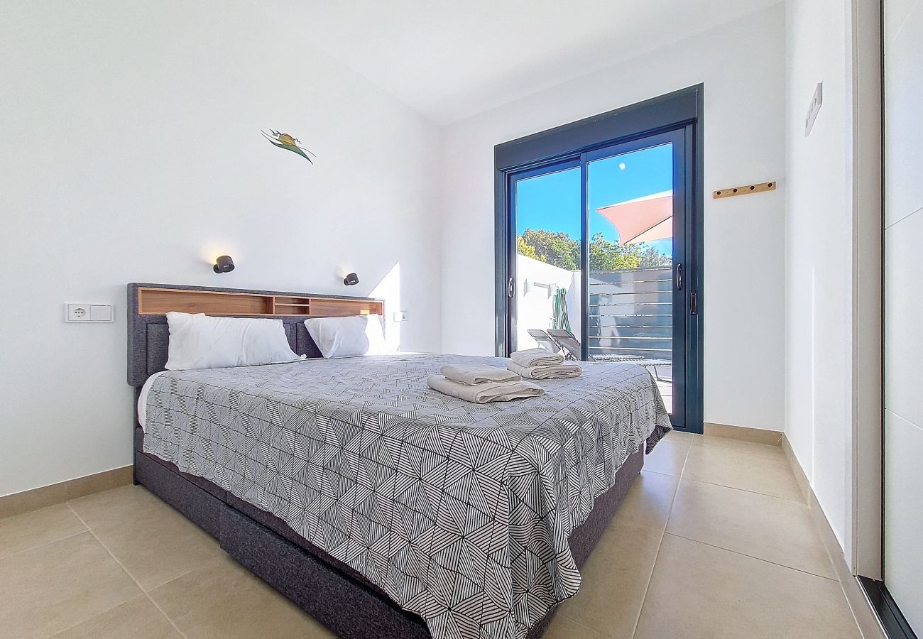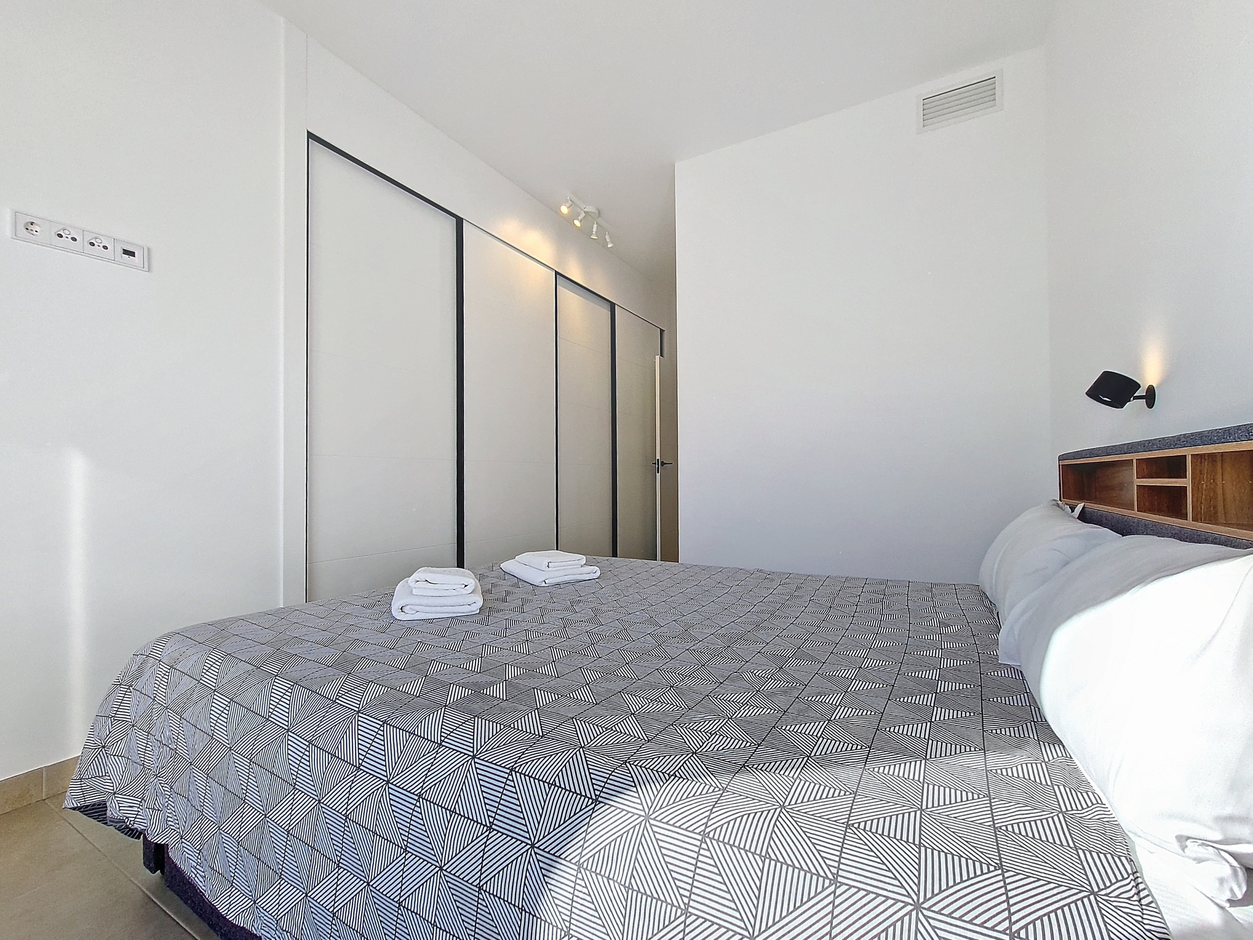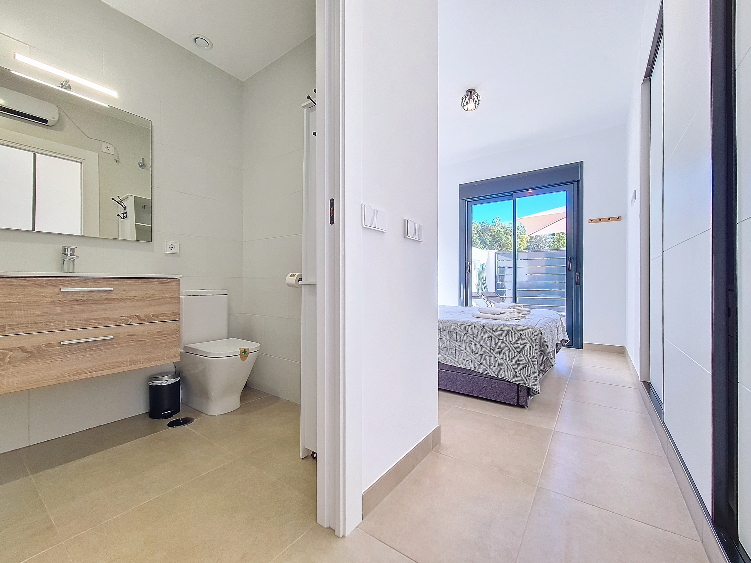 Die Immobilie verfügt über zwei geräumige Schlafzimmer, eines davon mit einem privaten Badezimmer en-suite. Beide Schlafzimmer sind hell und luftig, mit ausreichend Stauraum, der durch moderne, eingebaute Kleiderschränke bereitgestellt wird, die das zeitgenössische Design der Villa ergänzen.