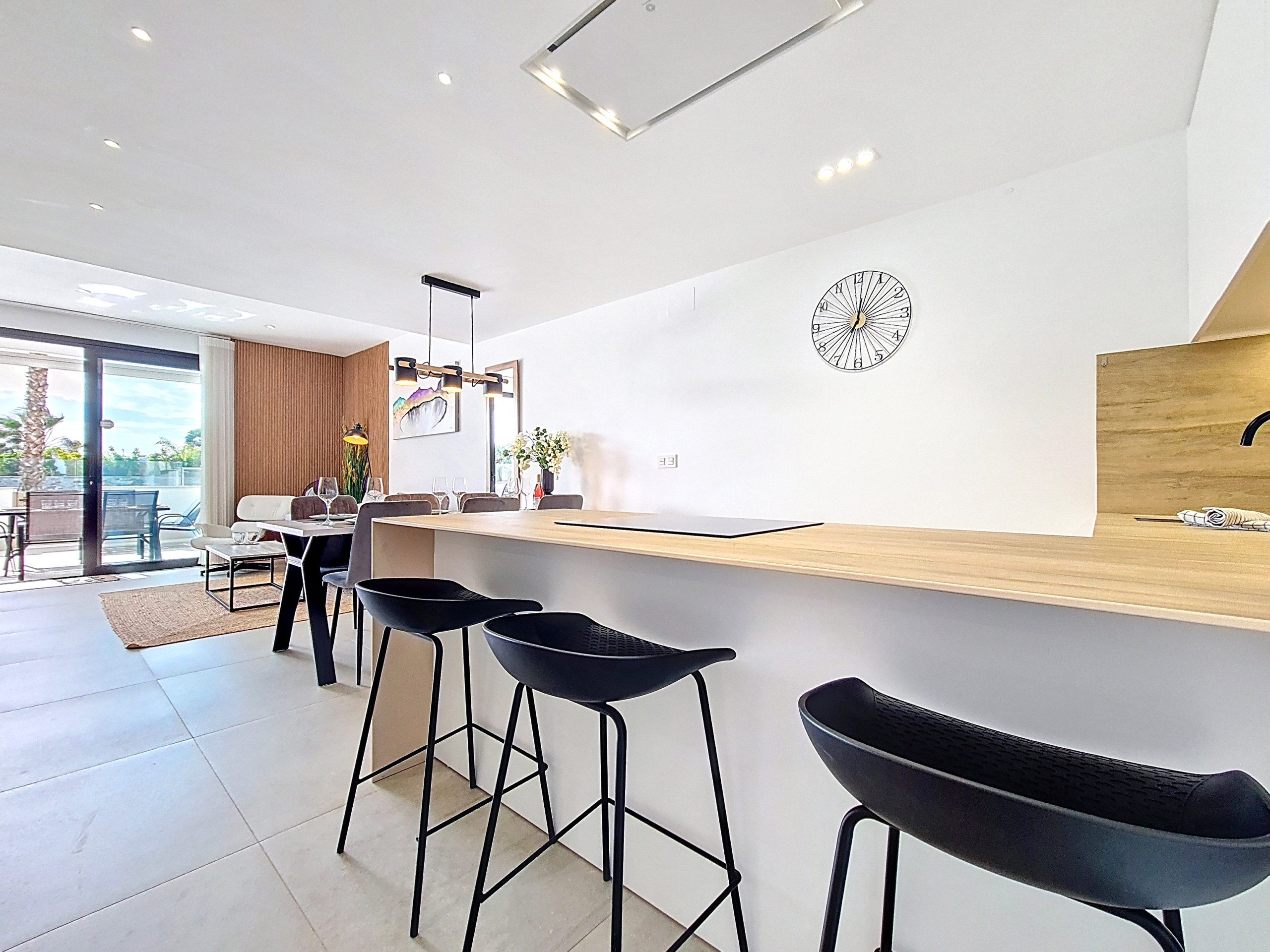 La sala de estar, el comedor y la cocina, de planta abierta, son luminosos y acogedores, y se abren directamente al patio privado y al comedor exterior. Desde aquí, podrá disfrutar de vistas directas a la piscina comunitaria, rodeada de un hermoso jardín, ideal tanto para nadar como para relajarse. El patio está bien equipado con mesa y sillas de comedor, tumbonas y una cómoda zona de estar, lo que lo hace ideal para disfrutar del aire libre.