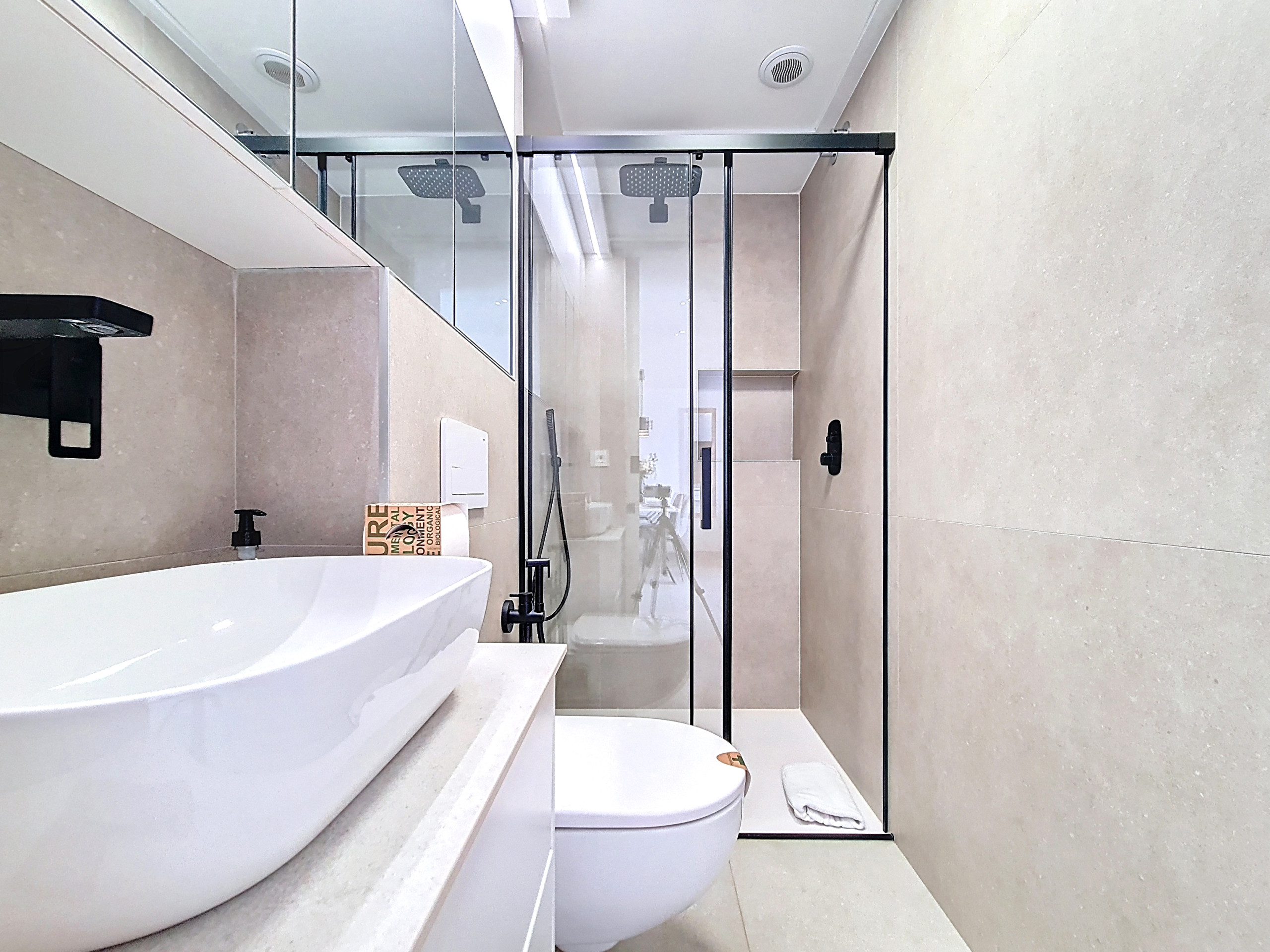 El dormitorio principal es moderno y elegante, con un baño en suite completamente oculto, perfectamente integrado en el diseño del armario. El baño incluye una ducha a ras de suelo, creando un espacio limpio y despejado. El segundo dormitorio está igualmente bien presentado y ofrece amplio espacio de almacenamiento, y ambos incluyen televisores.