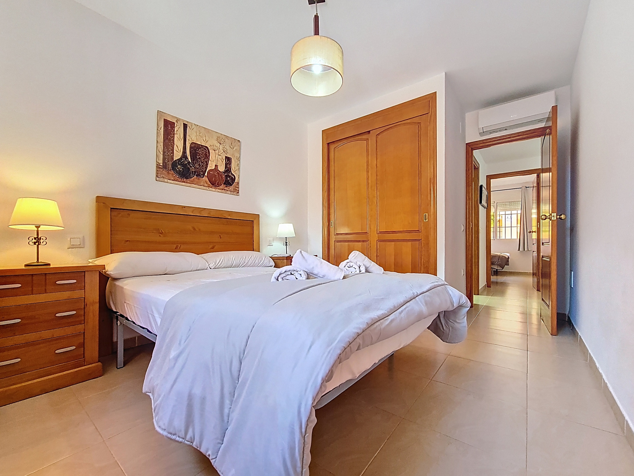 Tiene 2 dormitorios de buen tamaño; ambos tienen dos camas individuales, amplio espacio de guardarropas y aire acondicionado. Entre ambos dormitorios, hay un moderno baño familiar con ducha a ras de suelo.