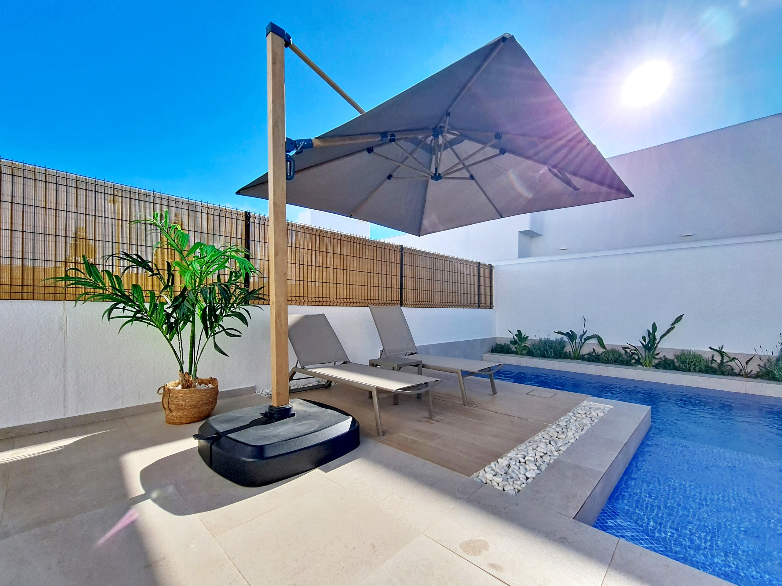 • Piscina privada en forma de L con tumbonas y sombrilla