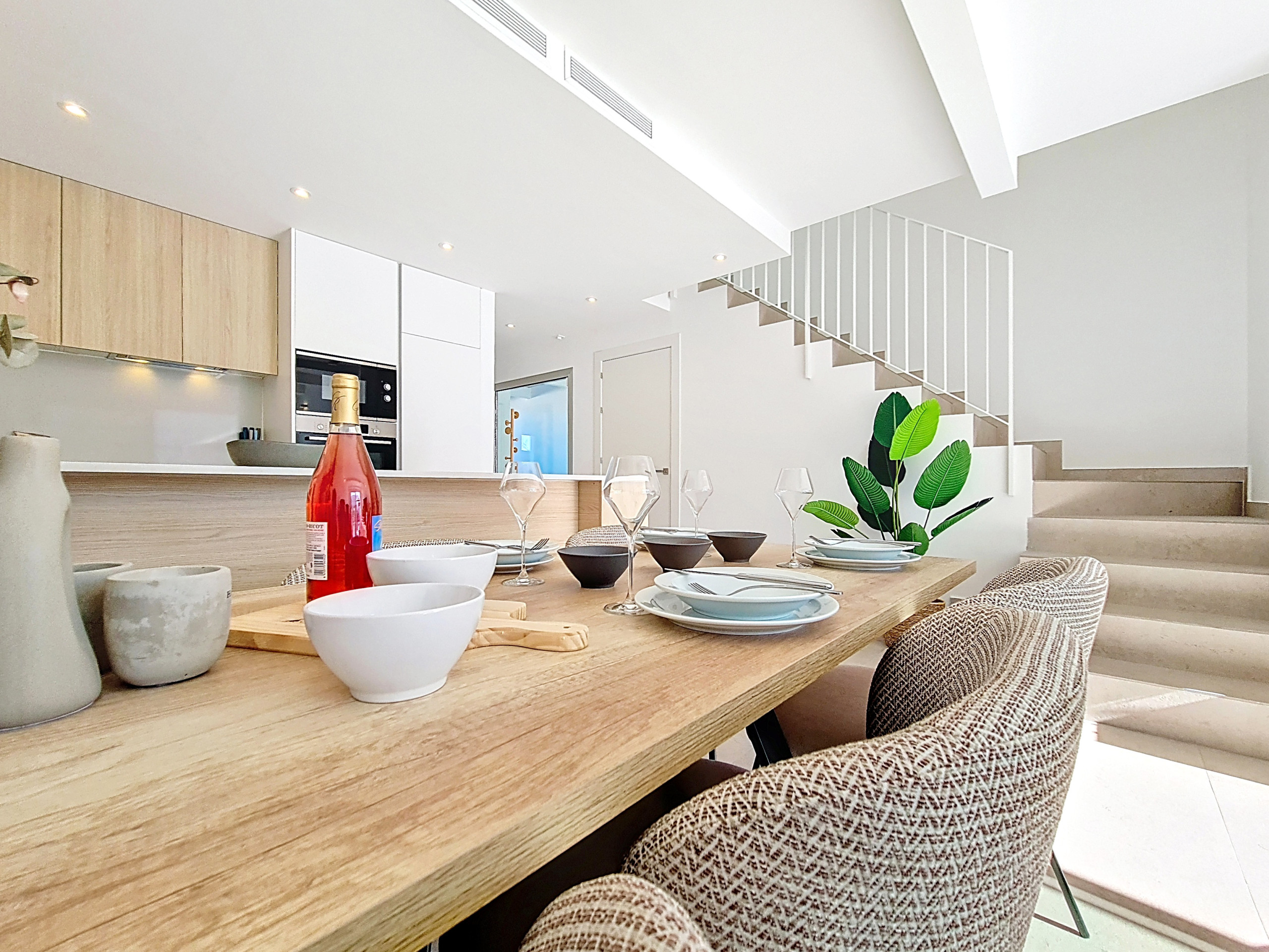 La planta baja cuenta con un diseño diáfano y luminoso, con una cocina elegante y totalmente equipada que se abre hacia la zona de comedor y salón. Un espacio de servicio bajo la escalera alberga una lavadora, mientras que la acogedora zona de estar con asientos cómodos y un Smart TV es perfecta para relajarse después de un día al sol.