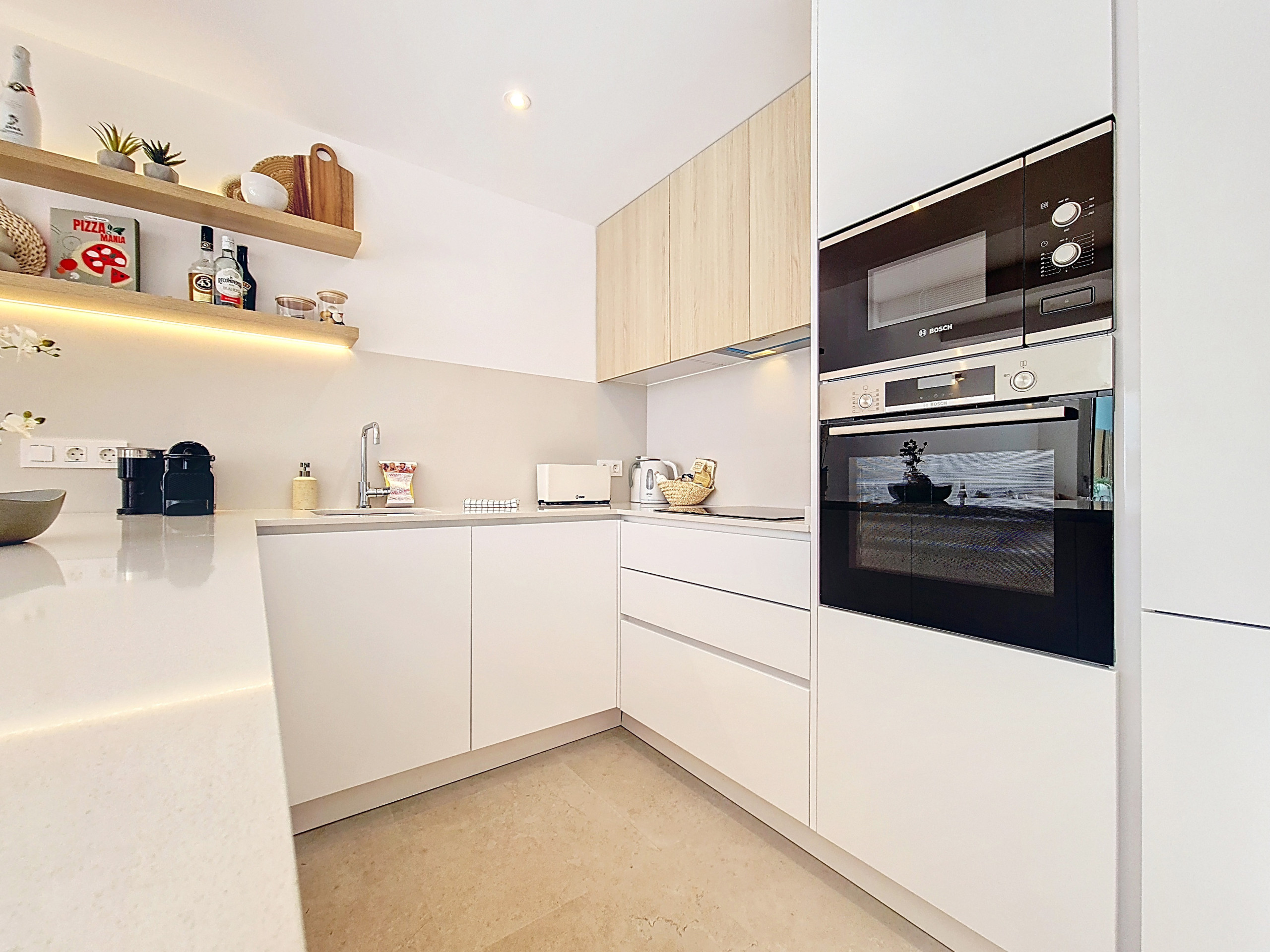 La sala de estar de planta abierta es luminosa y espaciosa, con una cocina totalmente equipada, un comedor y un acogedor salón con Smart TV. Un lavadero independiente alberga una lavadora para mayor comodidad. La decoración interior es cálida y acogedora, con muebles suaves y tonos de madera natural que crean un ambiente acogedor y confortable. Grandes ventanales llenan el espacio de luz natural y se abren directamente a la piscina privada en forma de L, rodeada de tumbonas y una sombrilla, y un amplio comedor, ideal para relajarse o disfrutar de comidas al aire libre.