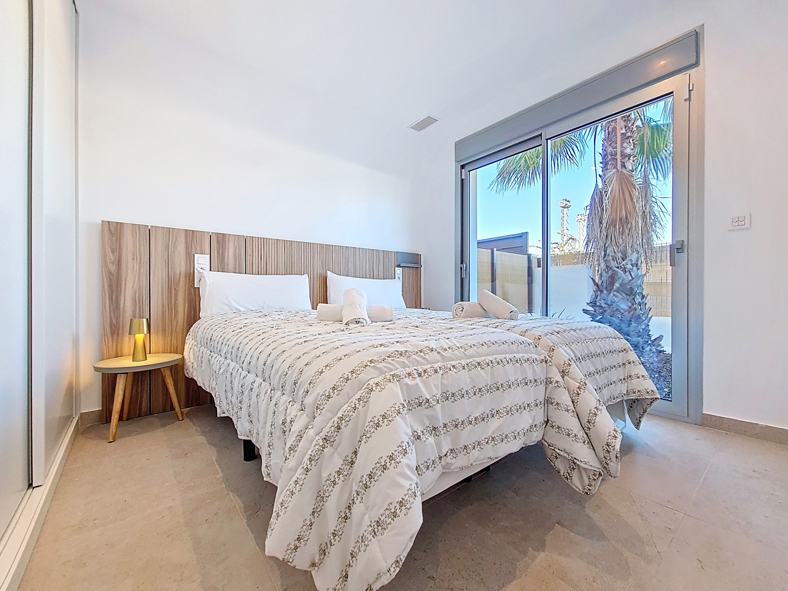 La villa tiene 3 dormitorios diseñados con mucho cuidado. En la planta baja, el dormitorio tiene acceso directo a un baño, que también tiene una entrada independiente desde el pasillo. Esta disposición inteligente permite que el baño sirva tanto como un baño en suite privado como el baño principal de la planta baja de la villa.