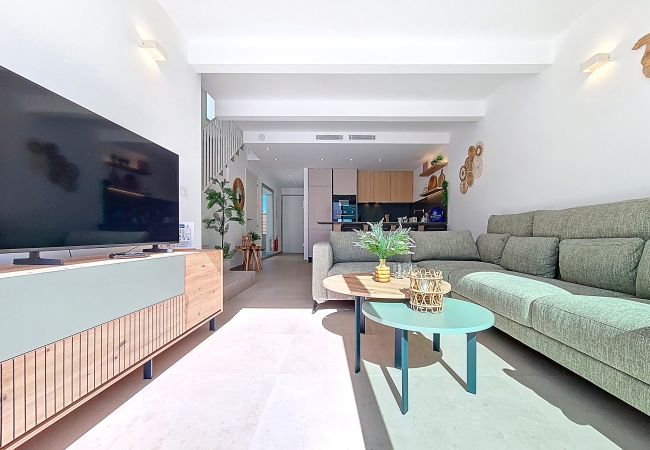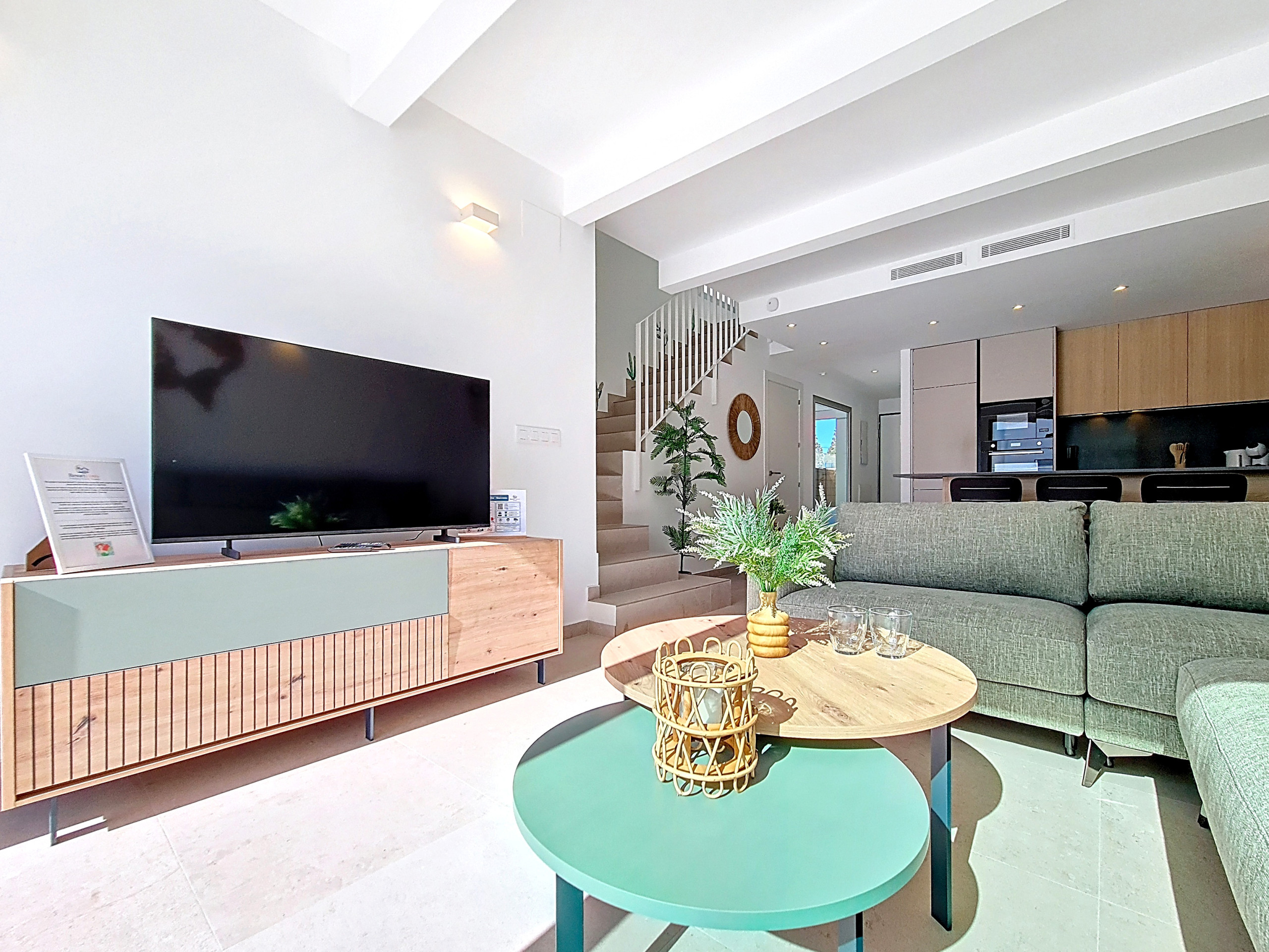La planta baja cuenta con un diseño diáfano y luminoso, con una cocina elegante y totalmente equipada que se abre hacia la zona de comedor y salón. Un espacio de servicio bajo la escalera alberga una lavadora, mientras que la acogedora zona de estar con asientos cómodos y un Smart TV es perfecta para relajarse después de un día al sol.