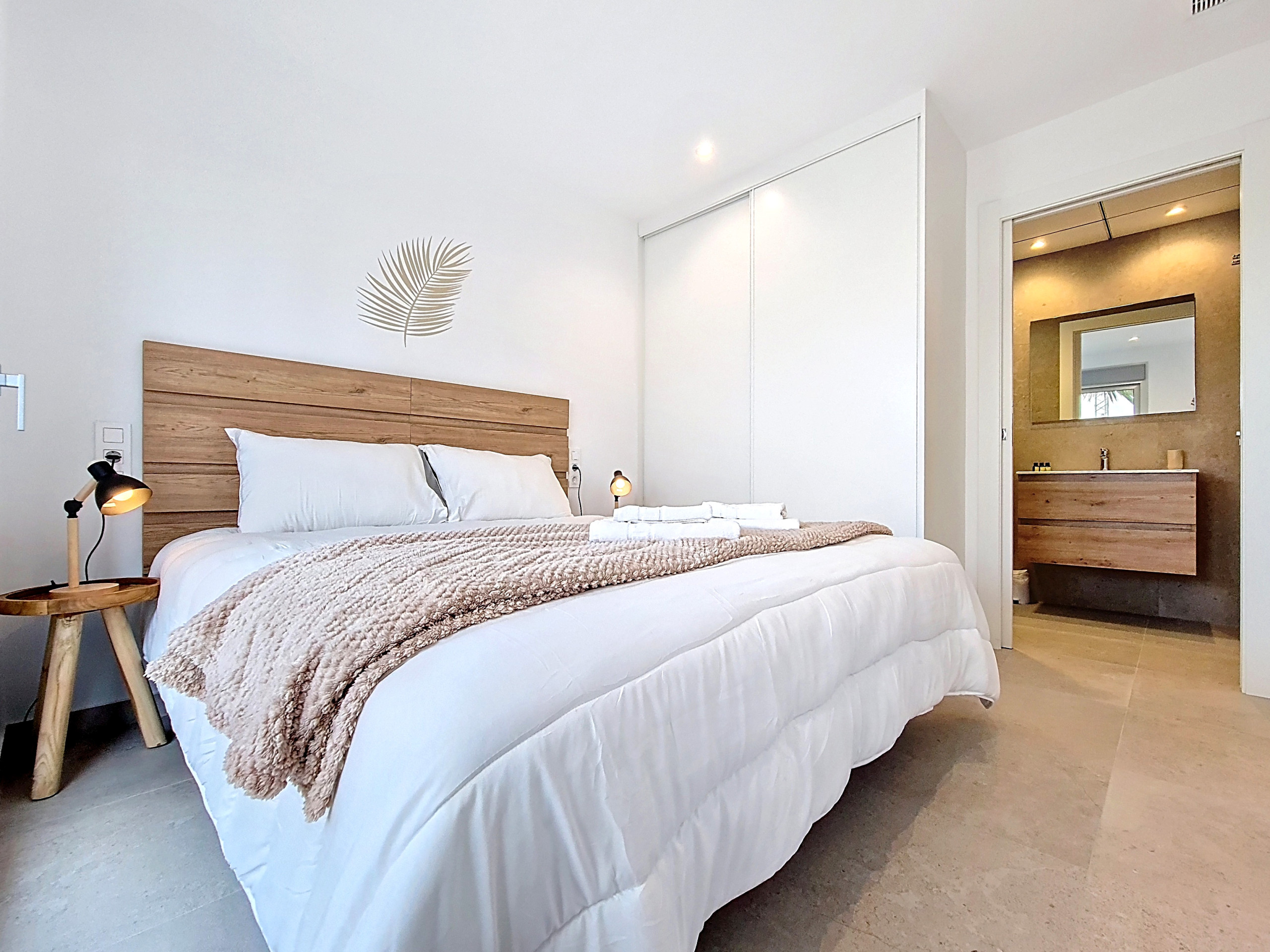 El luminoso espacio de vida diáfano está lleno de luz natural y diseñado con esmero para una vida fácil. La cocina totalmente equipada cuenta con acabados elegantes y una barra de desayuno, complementada por una amplia zona de estar con un gran Smart TV. En toda la villa, los tonos de madera natural y los acentos suaves y cálidos crean una atmósfera acogedora y elegante. Un área de servicio separada con lavadora proporciona una comodidad adicional. Las grandes puertas de patio se abren directamente al jardín y a la piscina, conectando sin problemas el interior y el exterior.