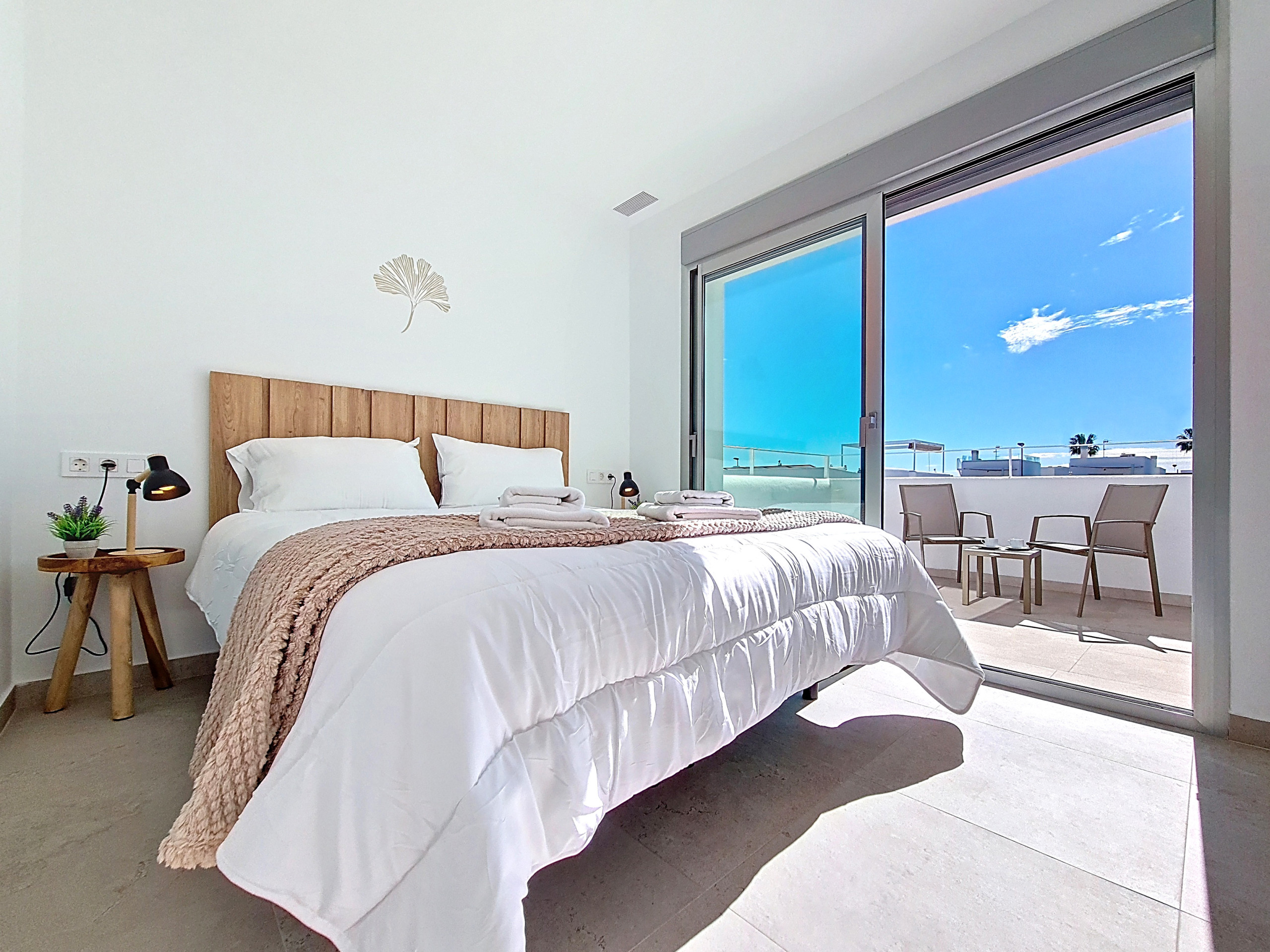 El dormitorio principal está ubicado en la planta baja y se encuentra junto a un cuarto de baño contemporáneo con una ducha de paseo, accesible tanto desde el dormitorio como desde el pasillo, ideal para huéspedes de todas las edades. En la planta superior, dos dormitorios más comparten un elegante cuarto de baño central con una ducha de paseo, al que se accede a través de puertas corredizas separadas desde cada dormitorio. Ambos dormitorios de la planta superior también se benefician de su propio balcón privado, cada uno amueblado con una mesita y sillas, perfecto para un café matutino o un momento tranquilo al aire libre.