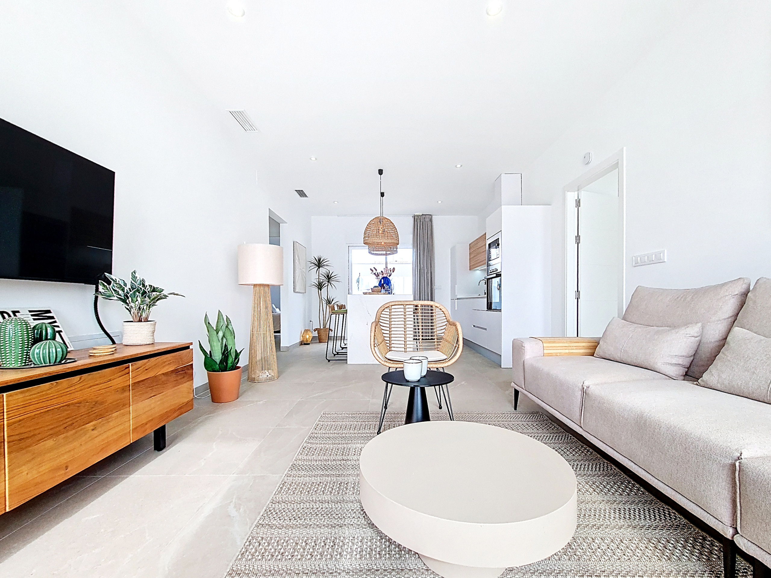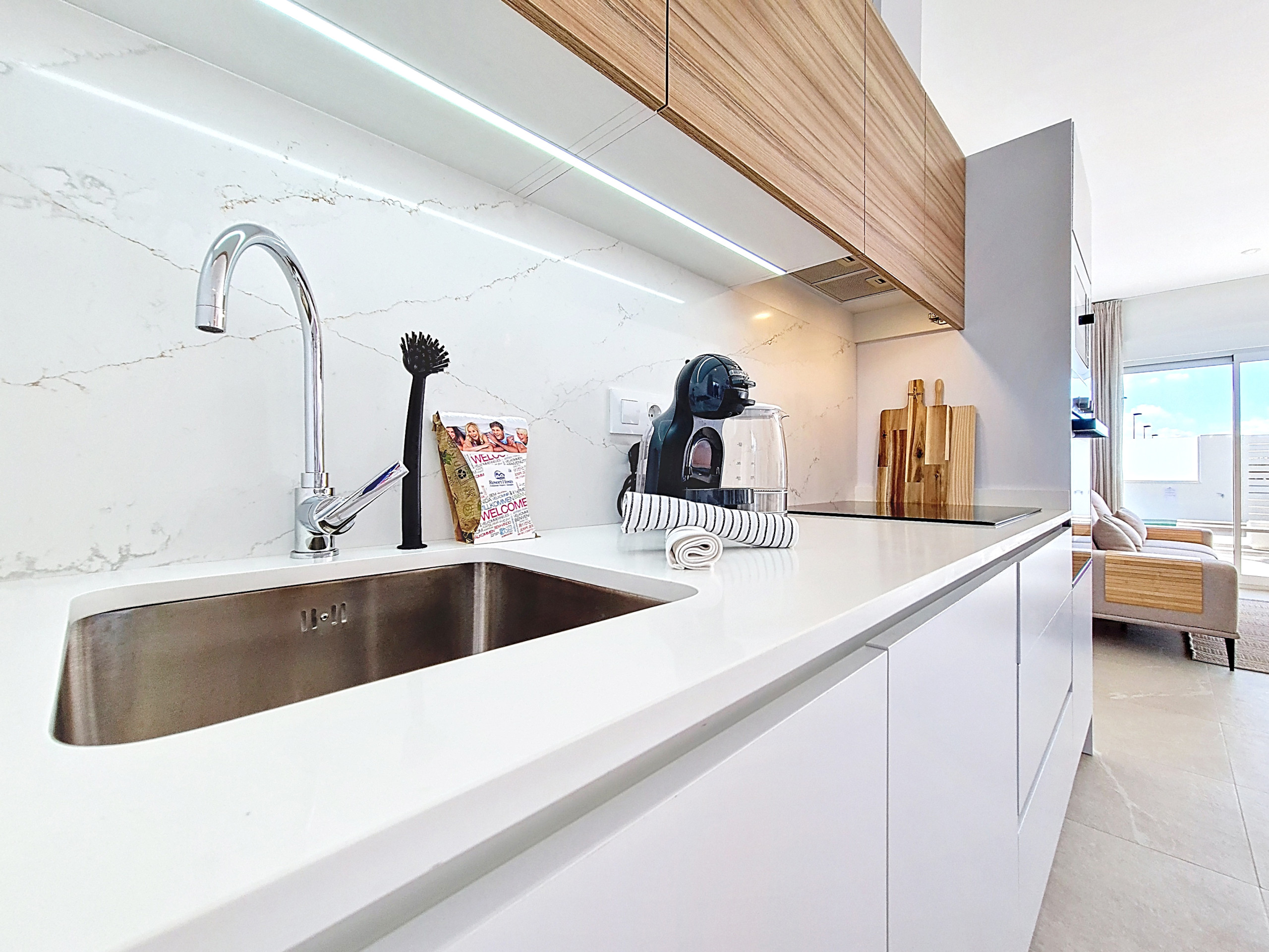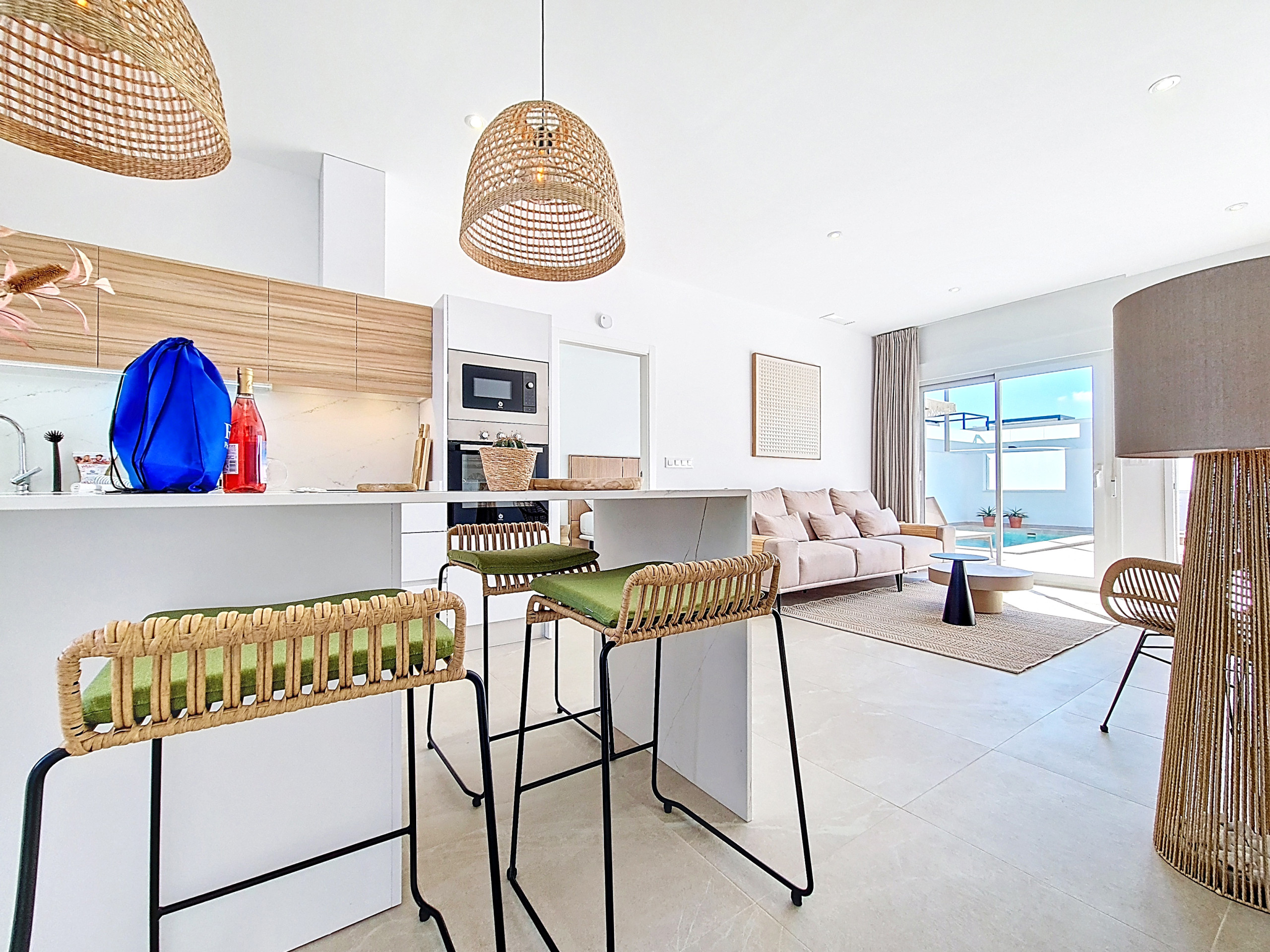 Esta villa tiene un diseño abierto que aumenta el espacio y la luz natural. La cocina está completamente equipada con electrodomésticos de alta gama, un gran espacio de almacenamiento y una encimera amplia, por lo que ofrece comodidad a la hora de cocinar. Justo al lado se encuentra el comedor, un espacio elegante y acogedor donde disfrutar de las comidas. El amplio salón tiene un diseño bonito, pero cómodo, cuenta con muebles modernos y puertas correderas de cristal que dan directamente a la terraza exterior.