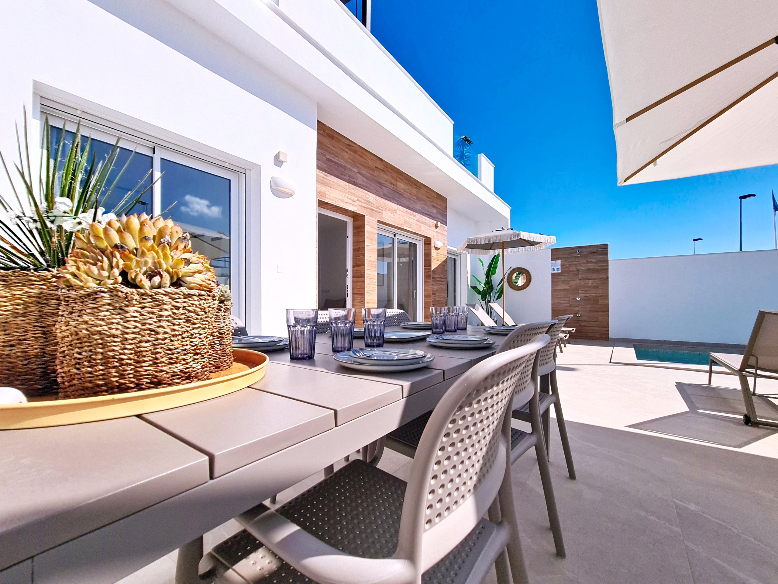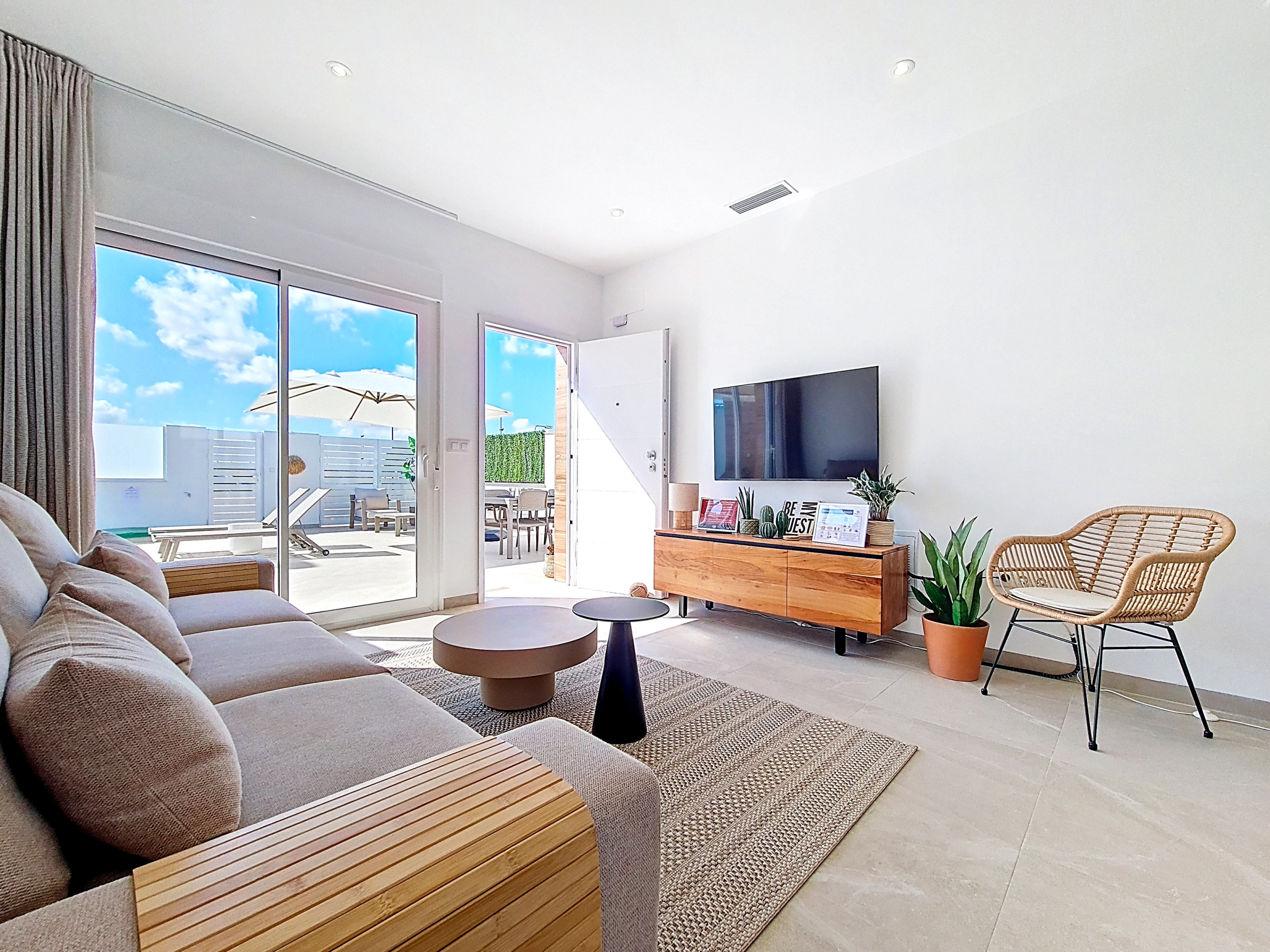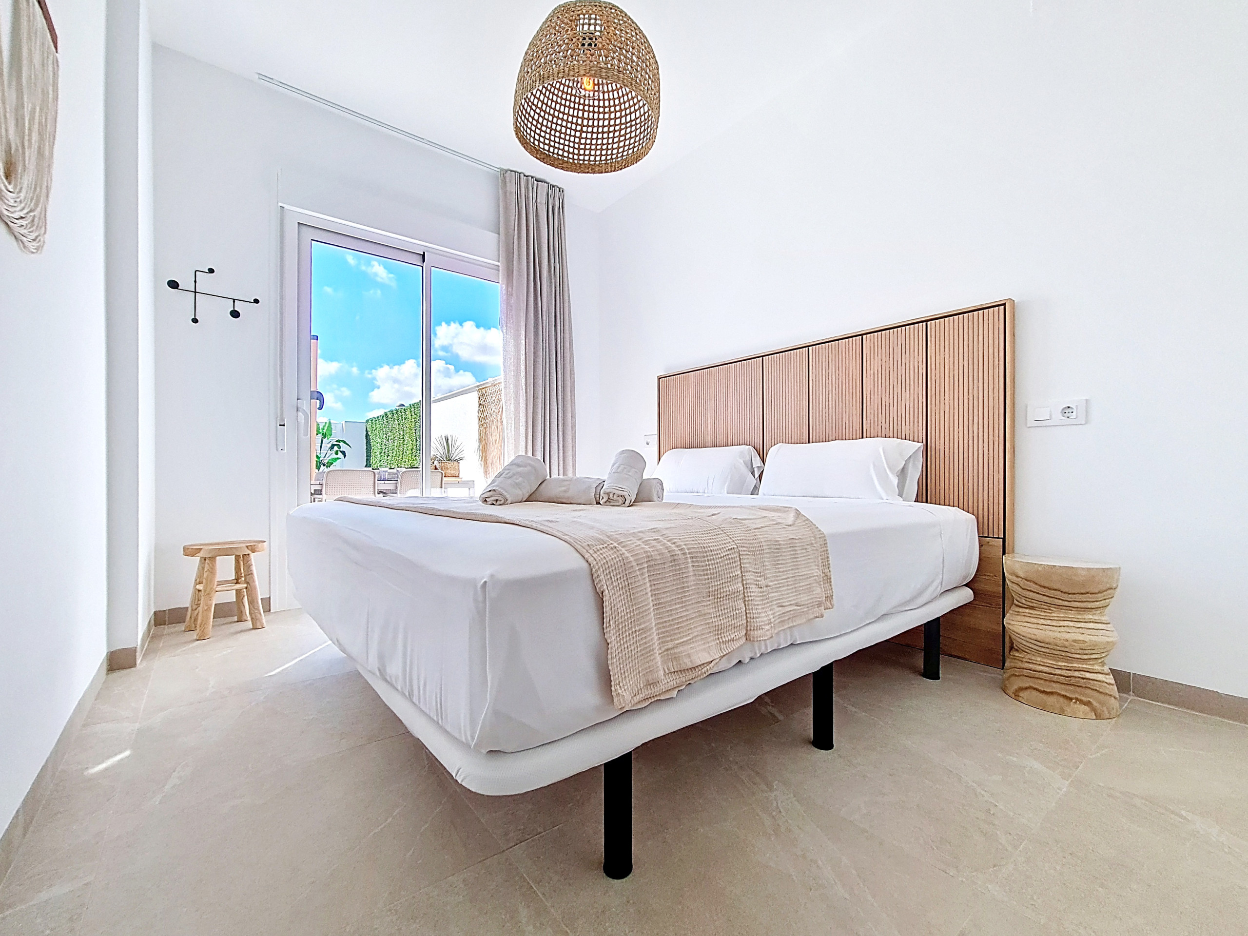 Esta villa de tres dormitorios en San Javier combina un diseño elegante con un ambiente cálido y acogedor, perfecto para familias, parejas o amigos que buscan una estancia relajante en un entorno agradable.