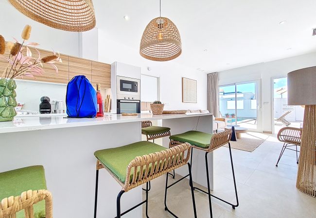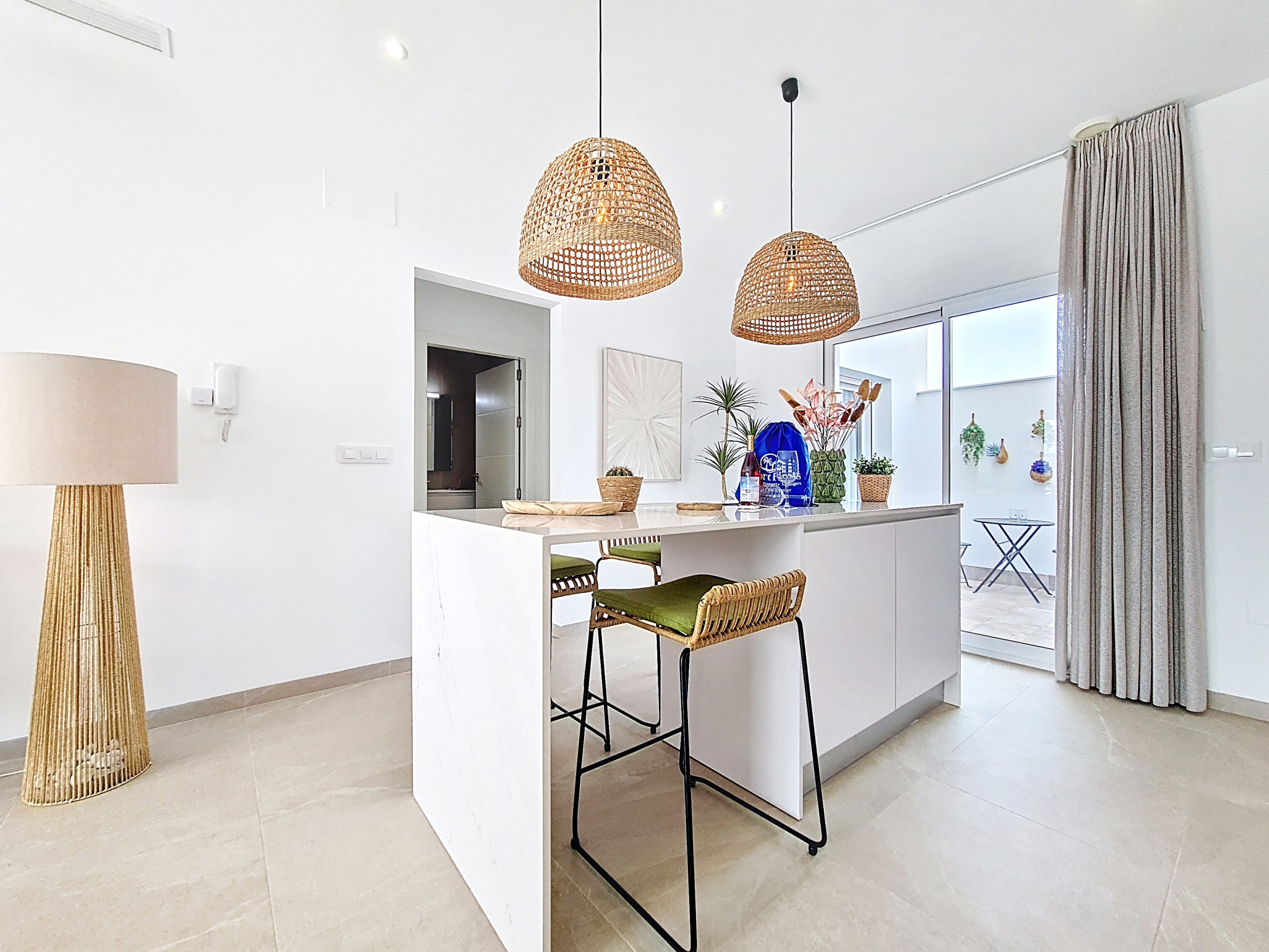 La distribución diáfana es luminosa y espaciosa, con una cocina moderna totalmente equipada que conecta con el amplio comedor y el salón. Las puertas correderas de cristal dan directamente a la terraza y a la piscina privada, creando un espacio perfecto para disfrutar del sol.
