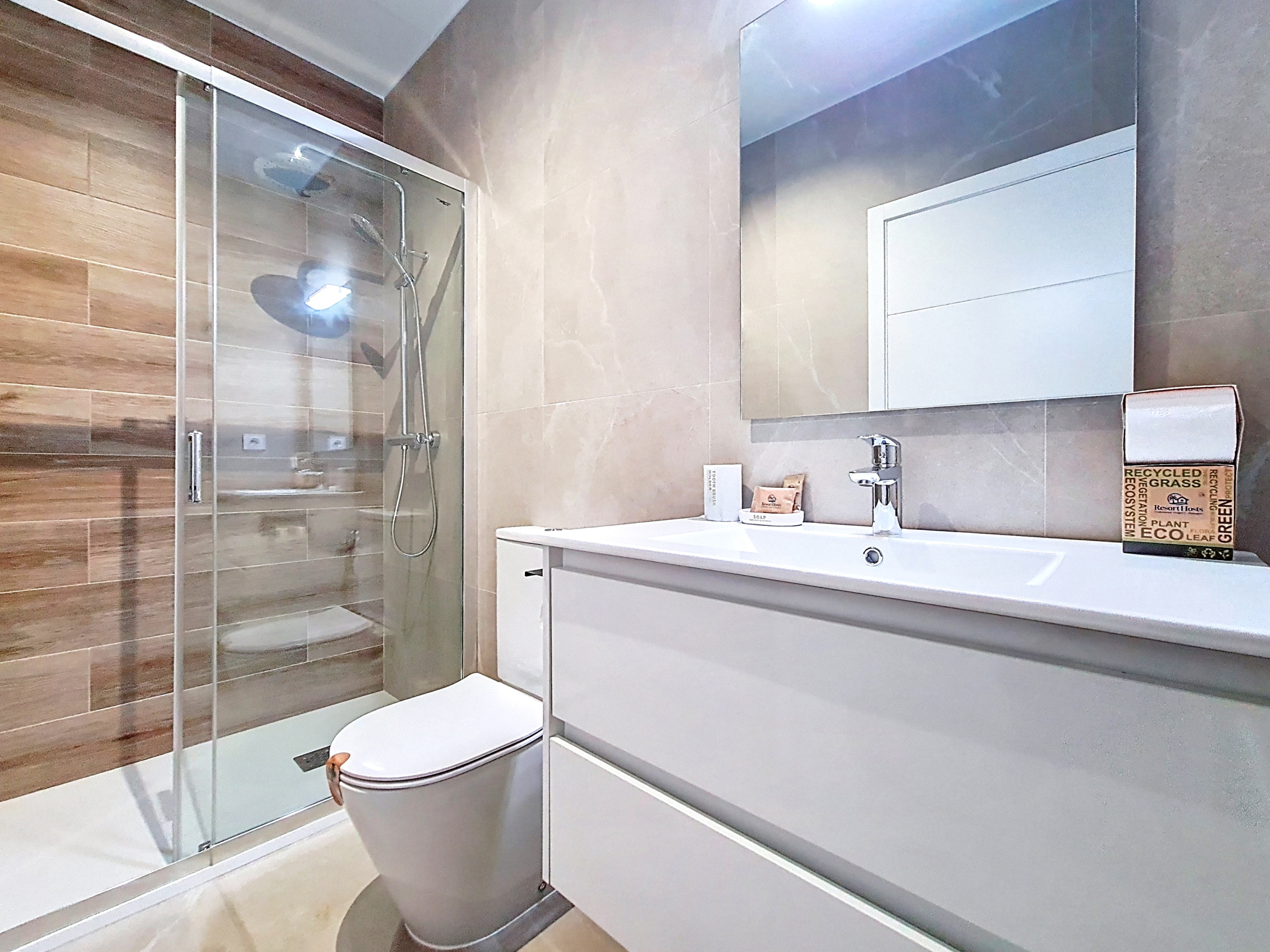 Los tres dormitorios están bien decorados y son acogedores, todos en la planta baja. El dormitorio principal tiene un cuarto de baño con ducha, mientras que el segundo y tercer dormitorio comparten un segundo cuarto de baño moderno, ambos con acabados de alta calidad.