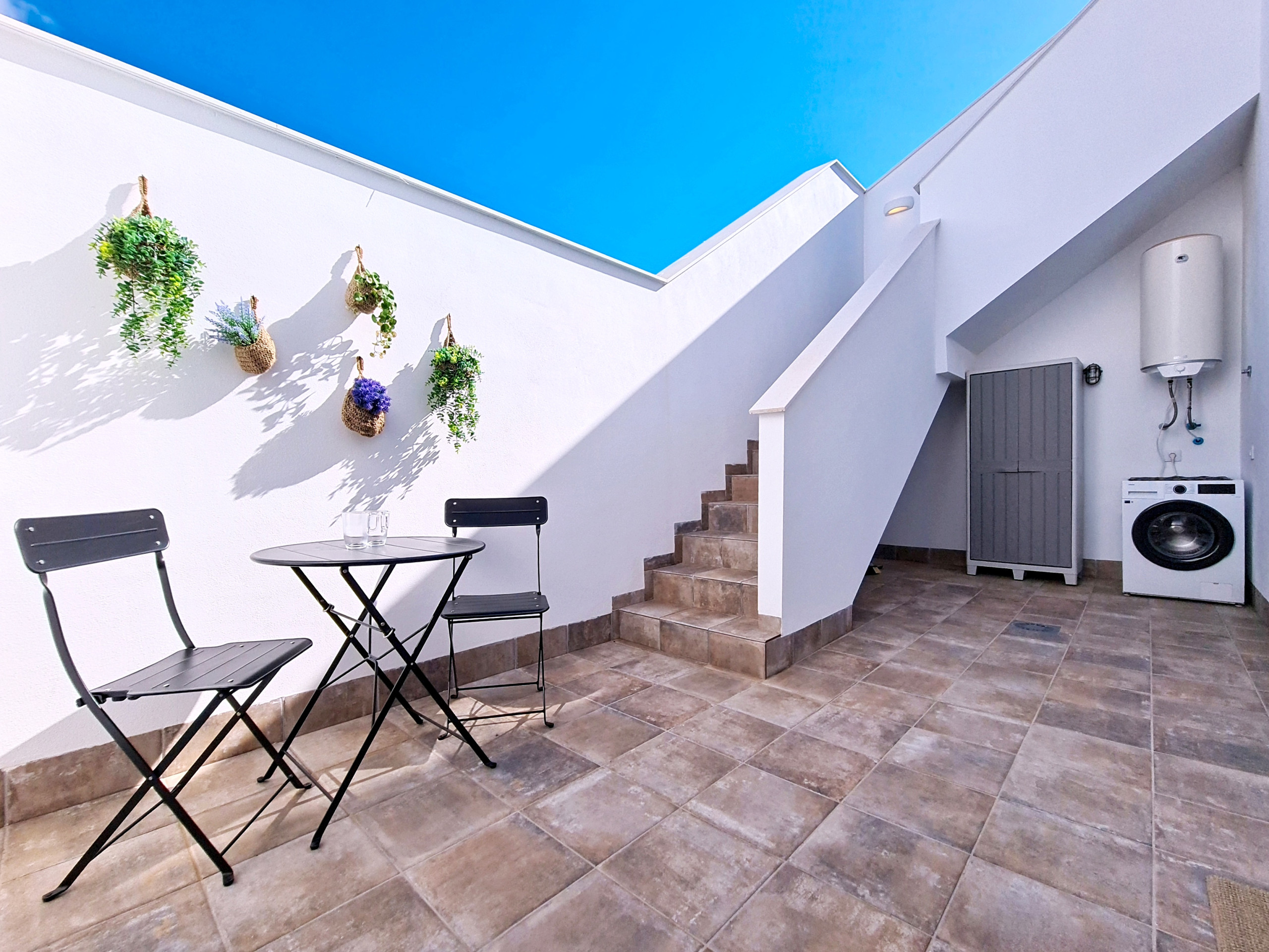 ∙Patio trasero con mesa y sillas, lavadora y escaleras a la terraza de la azotea