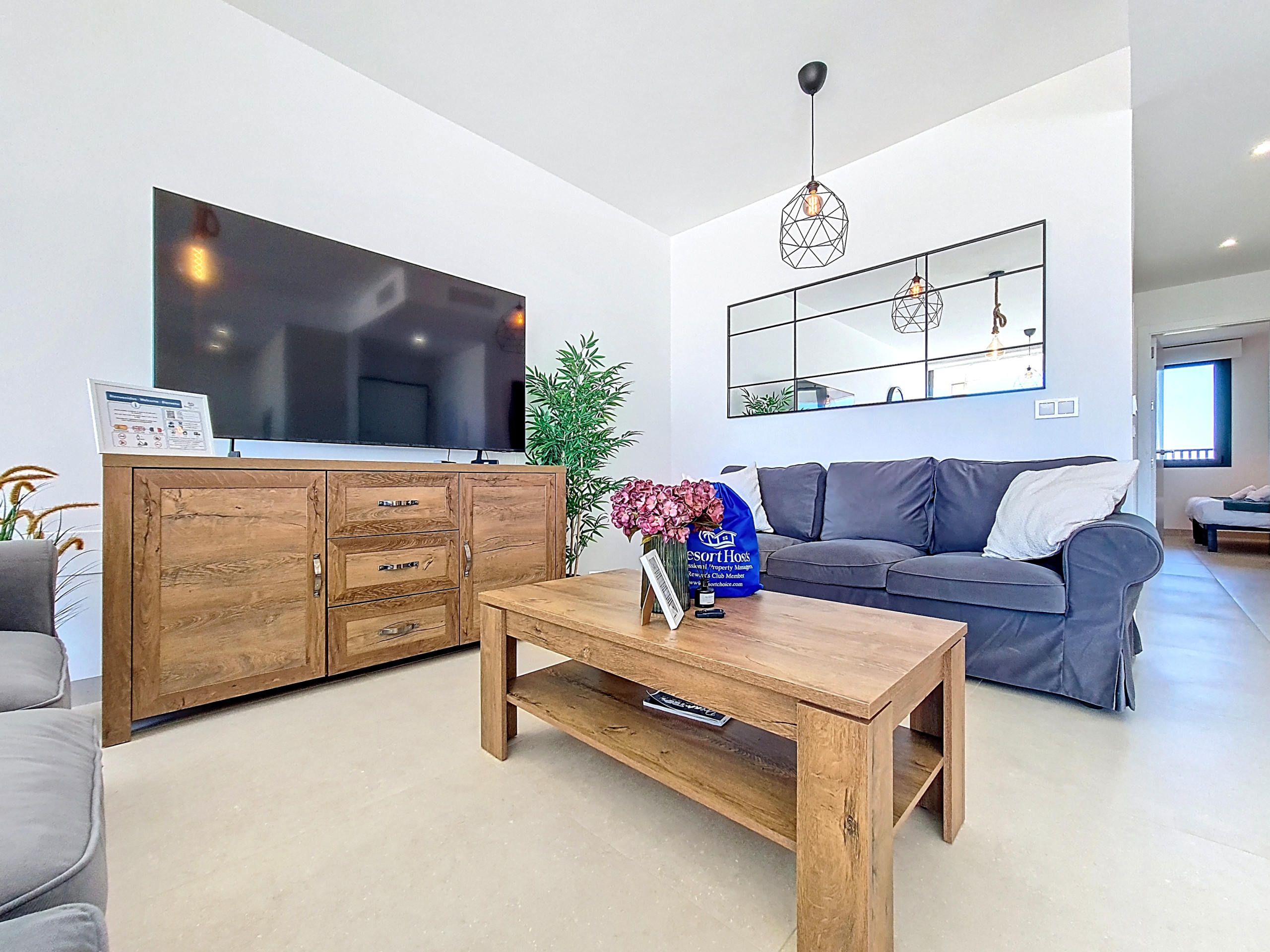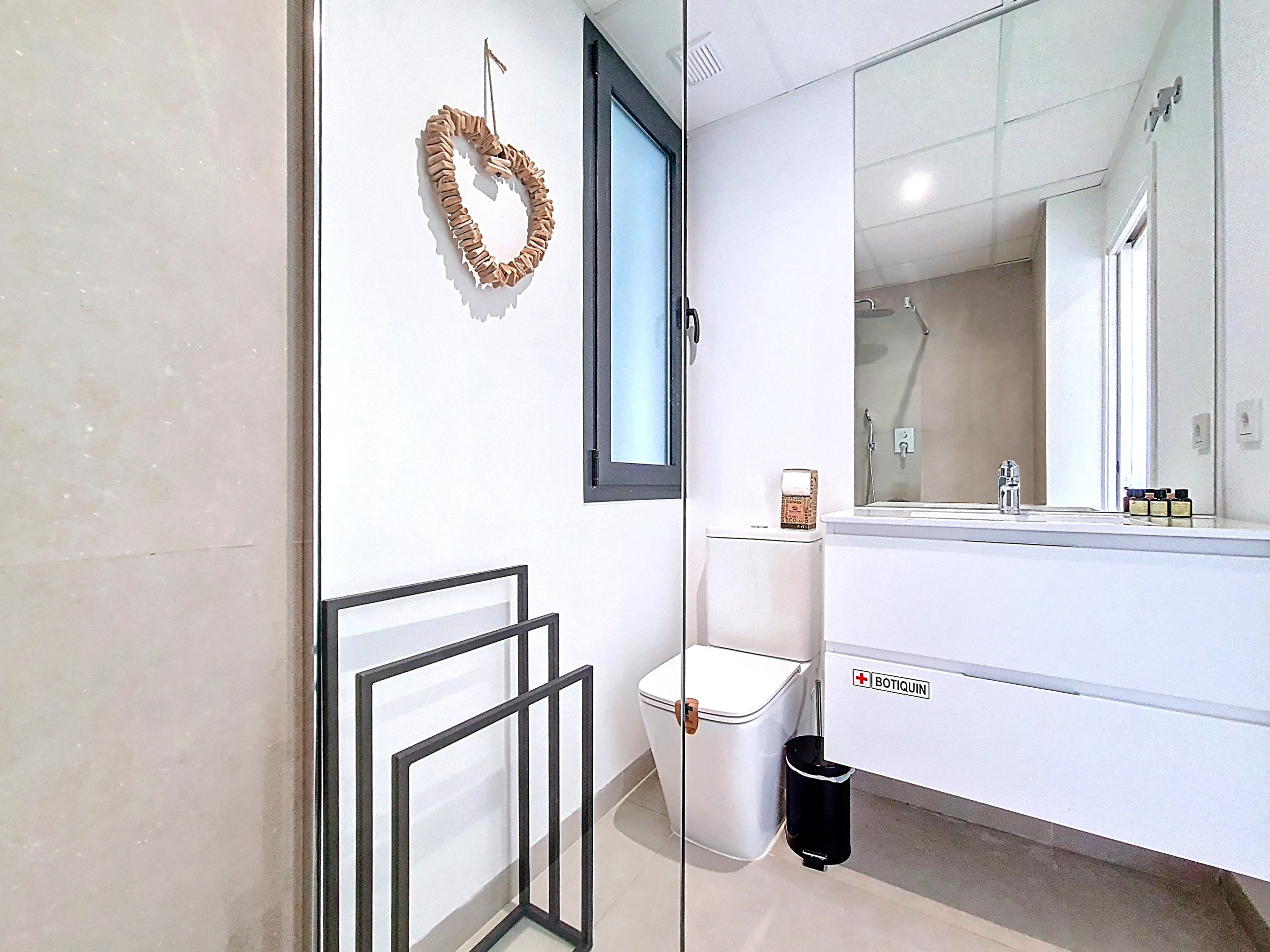 La grande zone de vie ouverte combine la cuisine, la salle à manger et le salon en un seul espace lumineux et convivial, rehaussé par un éclairage magnifique. La cuisine entièrement équipée dispose d'appareils de haute qualité et de nombreux espaces de rangement, tandis que la table à manger et la zone de salon offrent des espaces chaleureux pour les repas et la détente. Le salon comprend également une Smart TV et le Wi-Fi gratuit. Les portes-fenêtres coulissantes s'ouvrent sur un spacieux balcon, meublé de sièges extérieurs et de chaises longues, offrant un endroit parfait pour profiter du soleil.