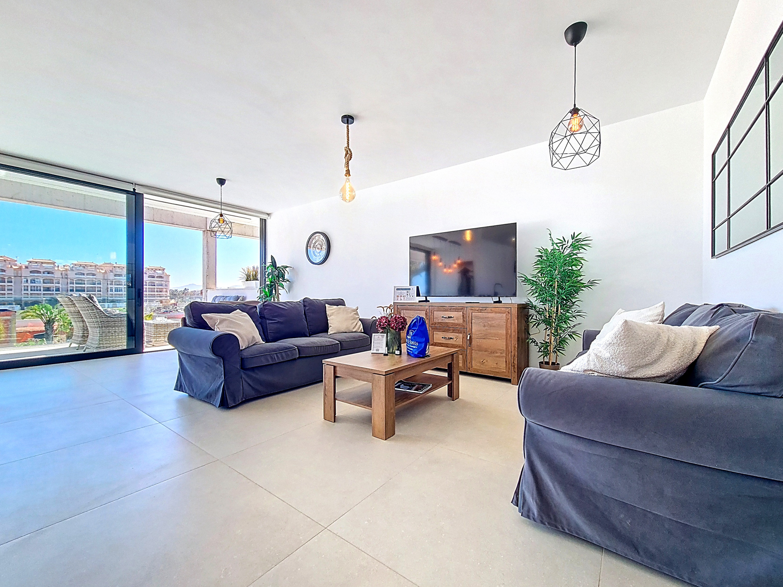 De grandes fenêtres permettent à la lumière naturelle d'inonder les espaces de vie, créant une ambiance lumineuse et aérée. L'appartement donne sur la piscine commune bien entretenue, offrant une belle vue dégagée.