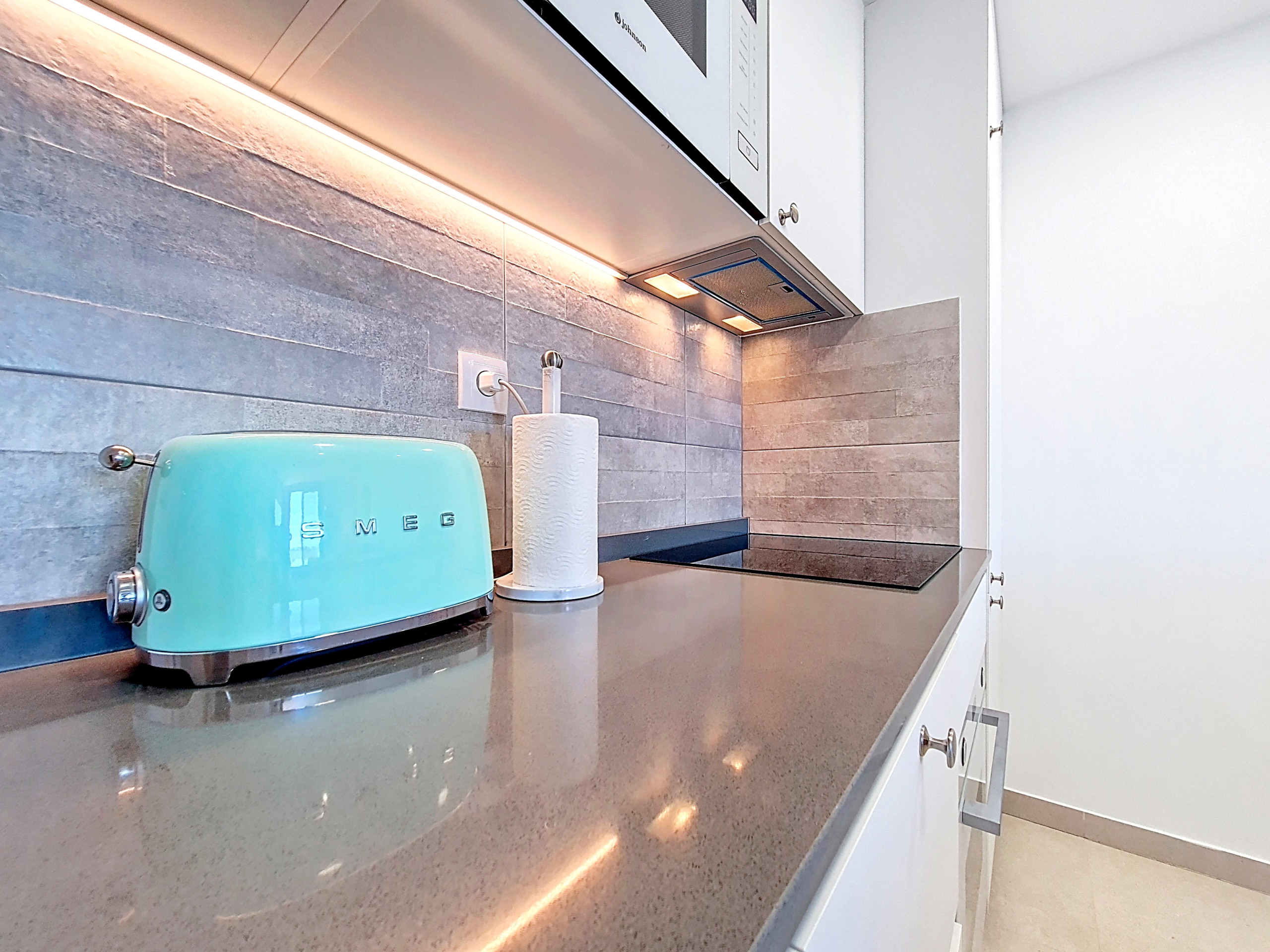 La cuisine entièrement équipée est dotée d'appareils électroménagers modernes et de tout le nécessaire pour un séjour confortable. Un deuxième balcon, plus petit, accessible depuis la cuisine et la chambre principale, ajoute du charme et un espace extérieur, avec une petite table et des chaises.