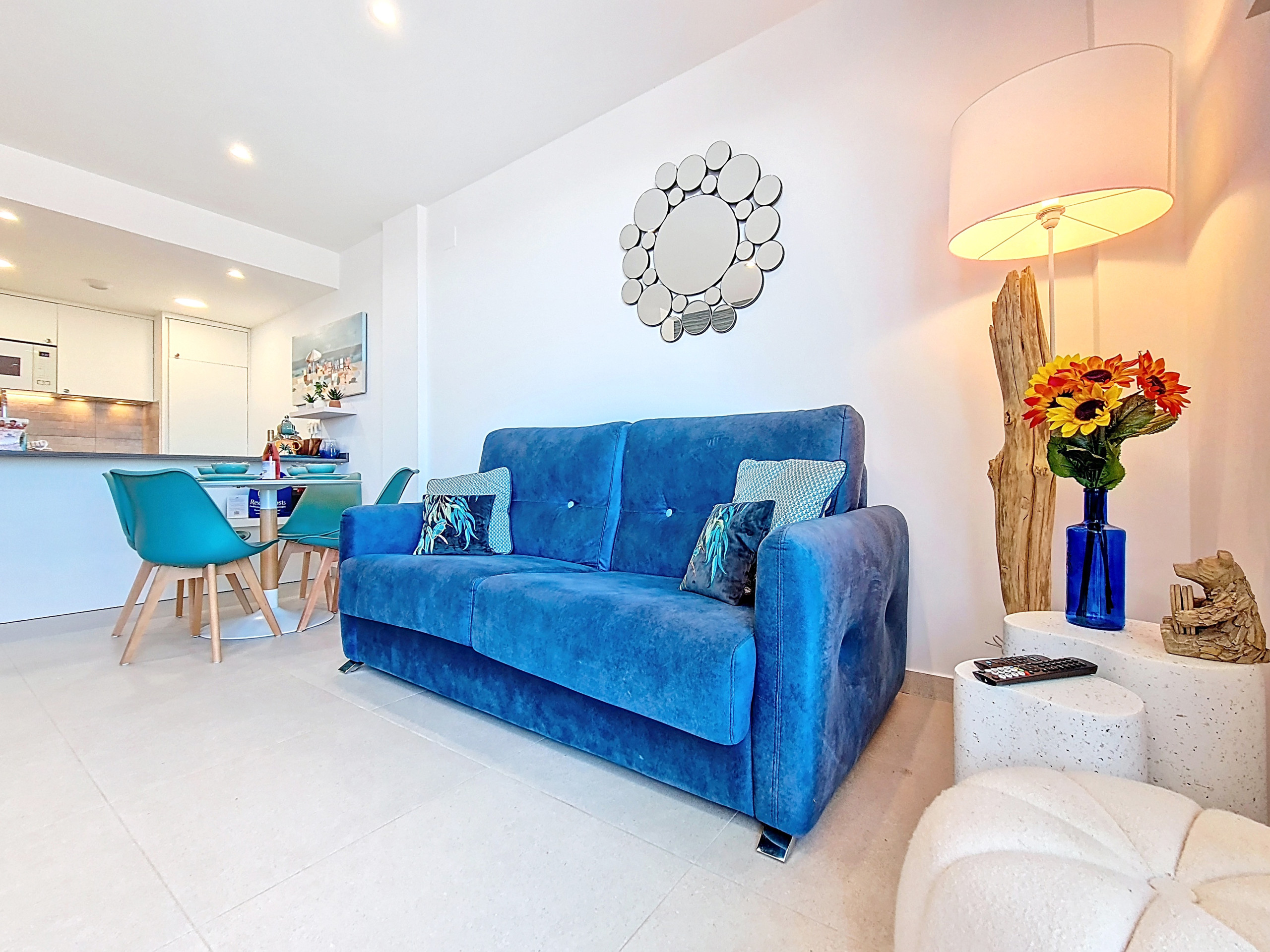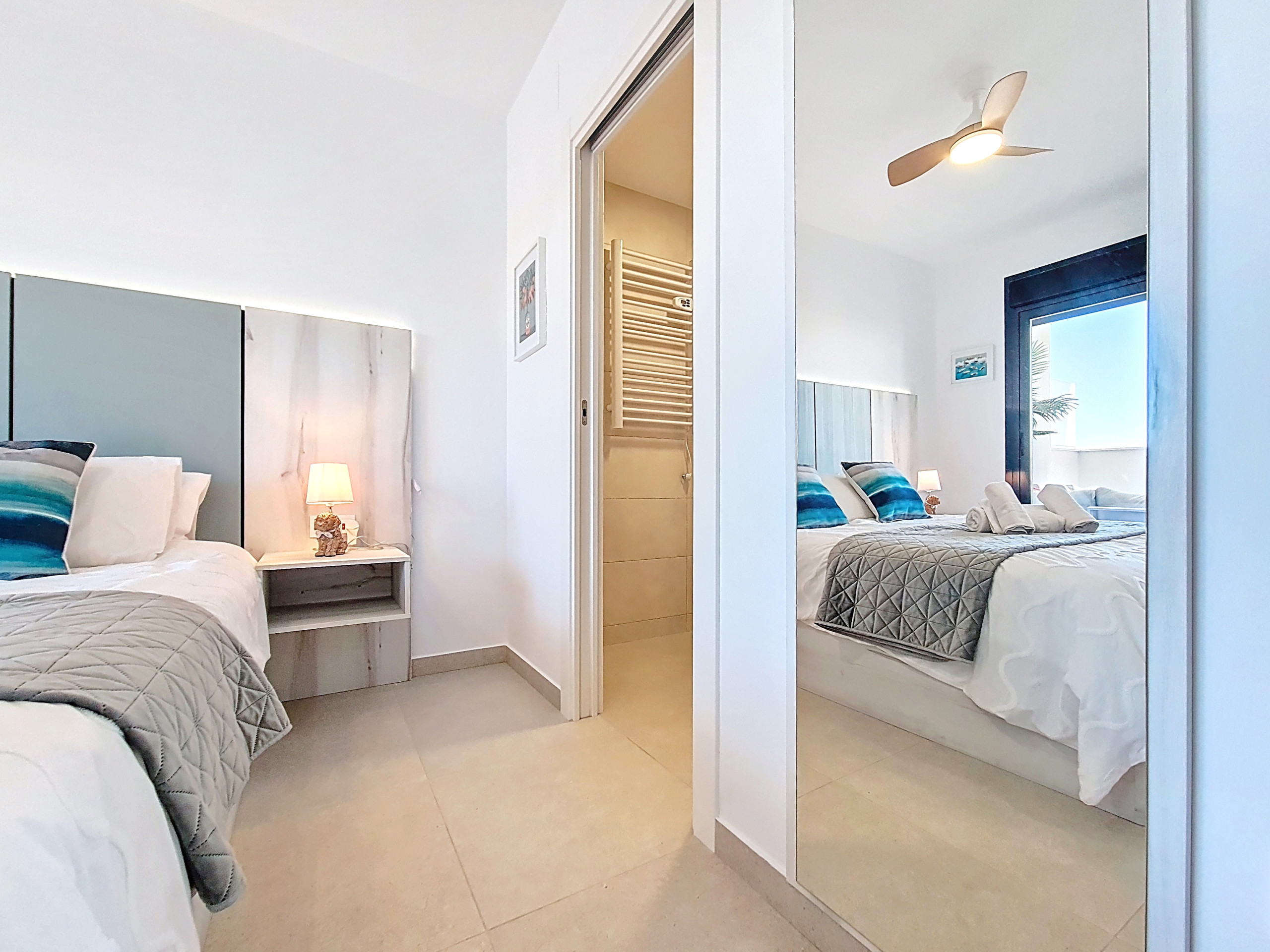 La chambre principale, lumineuse et décorée avec goût, bénéficie d'une salle de bain attenante avec douche à l'italienne et d'un accès au deuxième balcon. La deuxième chambre, tout aussi lumineuse et chaleureuse, est idéale pour les enfants ou les invités. Une élégante salle de bain d'invités, également avec douche à l'italienne, est située entre les deux chambres pour plus de confort. Cet élégant appartement offre des équipements modernes tels que la climatisation, une télévision connectée et le Wi-Fi haut débit, pour rester au frais et connecté pendant votre séjour. Depuis l'appartement, vous avez accès à une piscine commune impeccablement entretenue, avec jacuzzi et bassin pour enfants. Vous trouverez également une petite salle de sport extérieure et une aire de jeux pour enfants. C'est l'endroit idéal pour se rafraîchir ou se détendre sous le soleil méditerranéen en famille ou entre amis.