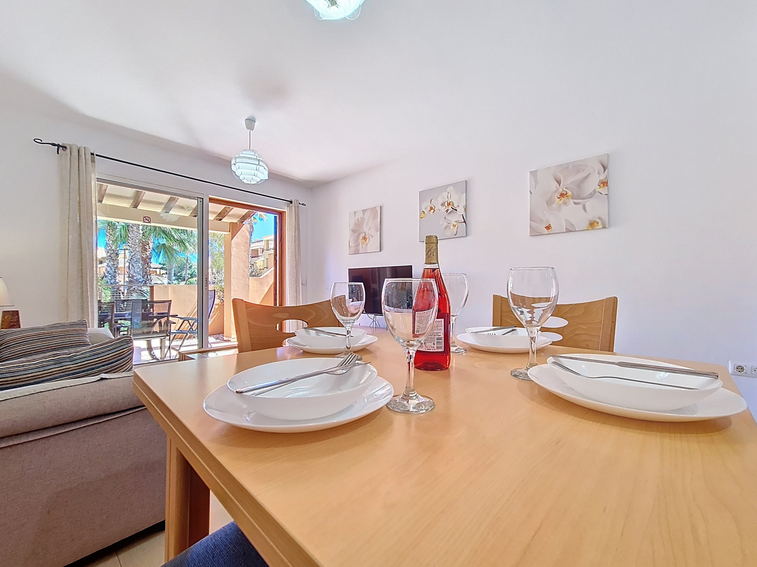 La cuisine ouverte, la salle à manger et le salon sont spacieux et aérés. La cuisine est entièrement équipée de tous les appareils modernes, dont un lave-vaisselle et une buanderie séparée. Le salon et la salle à manger modernes sont spacieux et lumineux avec des portes-fenêtres coulissantes qui s'ouvrent sur le joli patio extérieur, qui est un espace parfait pour prendre un repas en famille ou simplement pour se détendre et profiter du cadre tranquille. Depuis le patio extérieur, vous avez également accès à la grande piscine commune gazonnée, qui est l'endroit idéal pour se détendre et se relaxer.