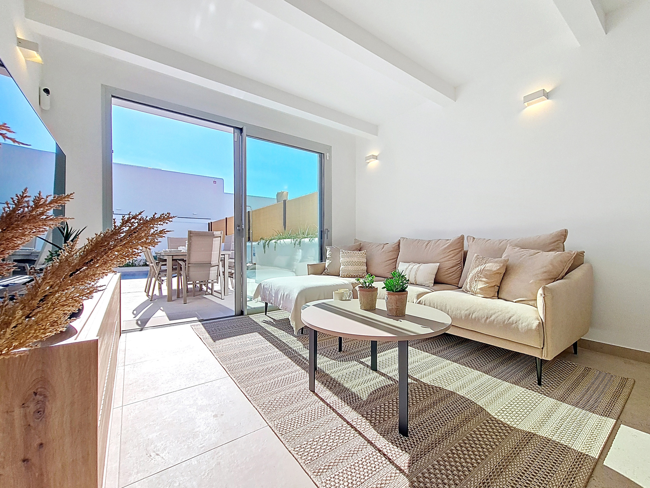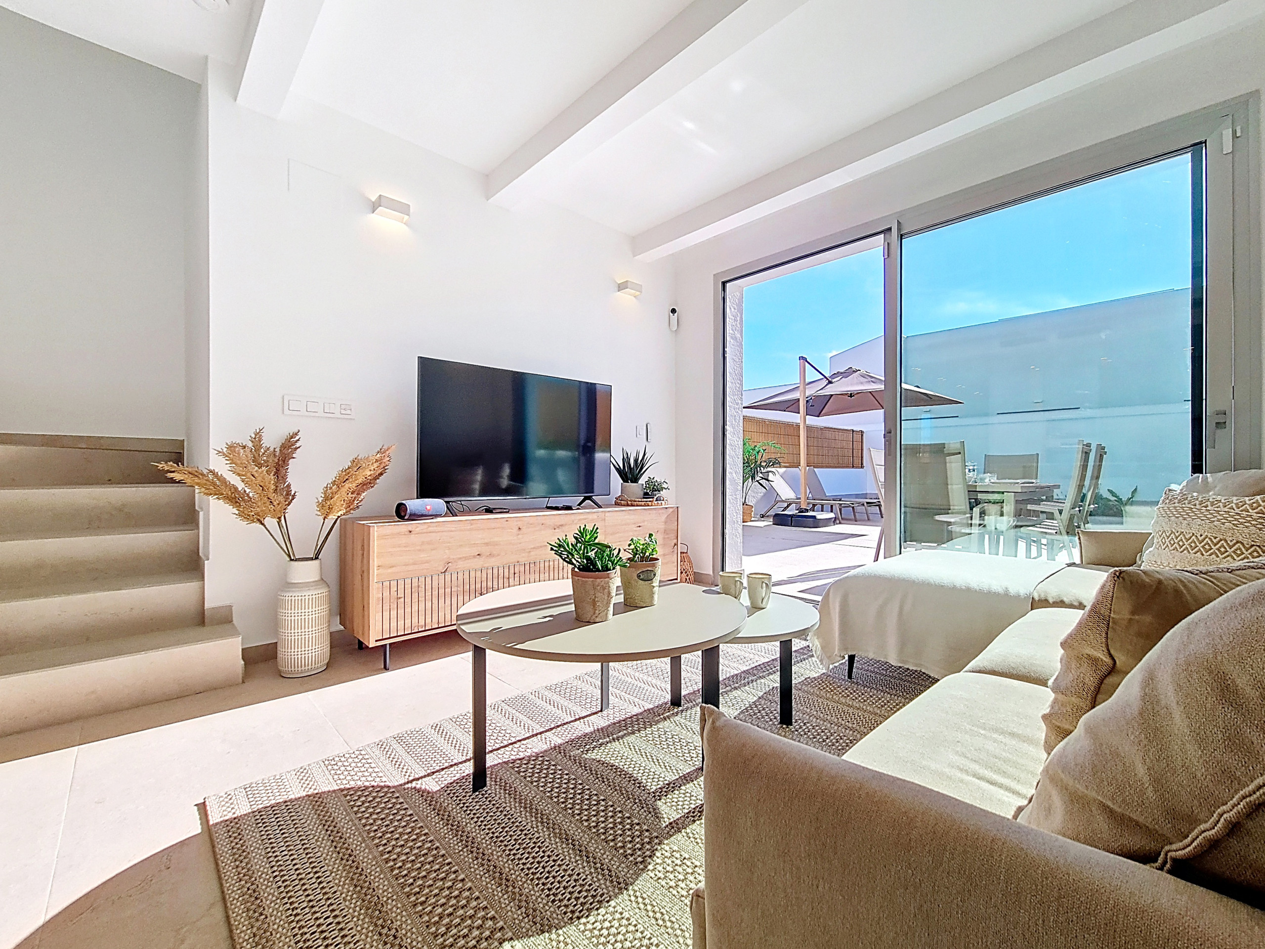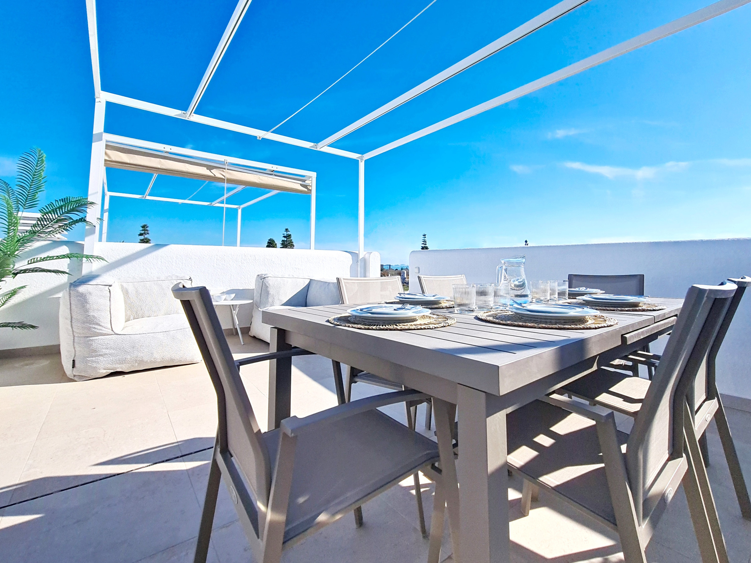 L'un des atouts majeurs de la villa est sa terrasse privée sur le toit, aménagée avec un coin salon confortable, une grande table à manger et un barbecue : un lieu idéal pour se détendre, recevoir des invités ou profiter de longs après-midi paisibles sous le soleil espagnol.