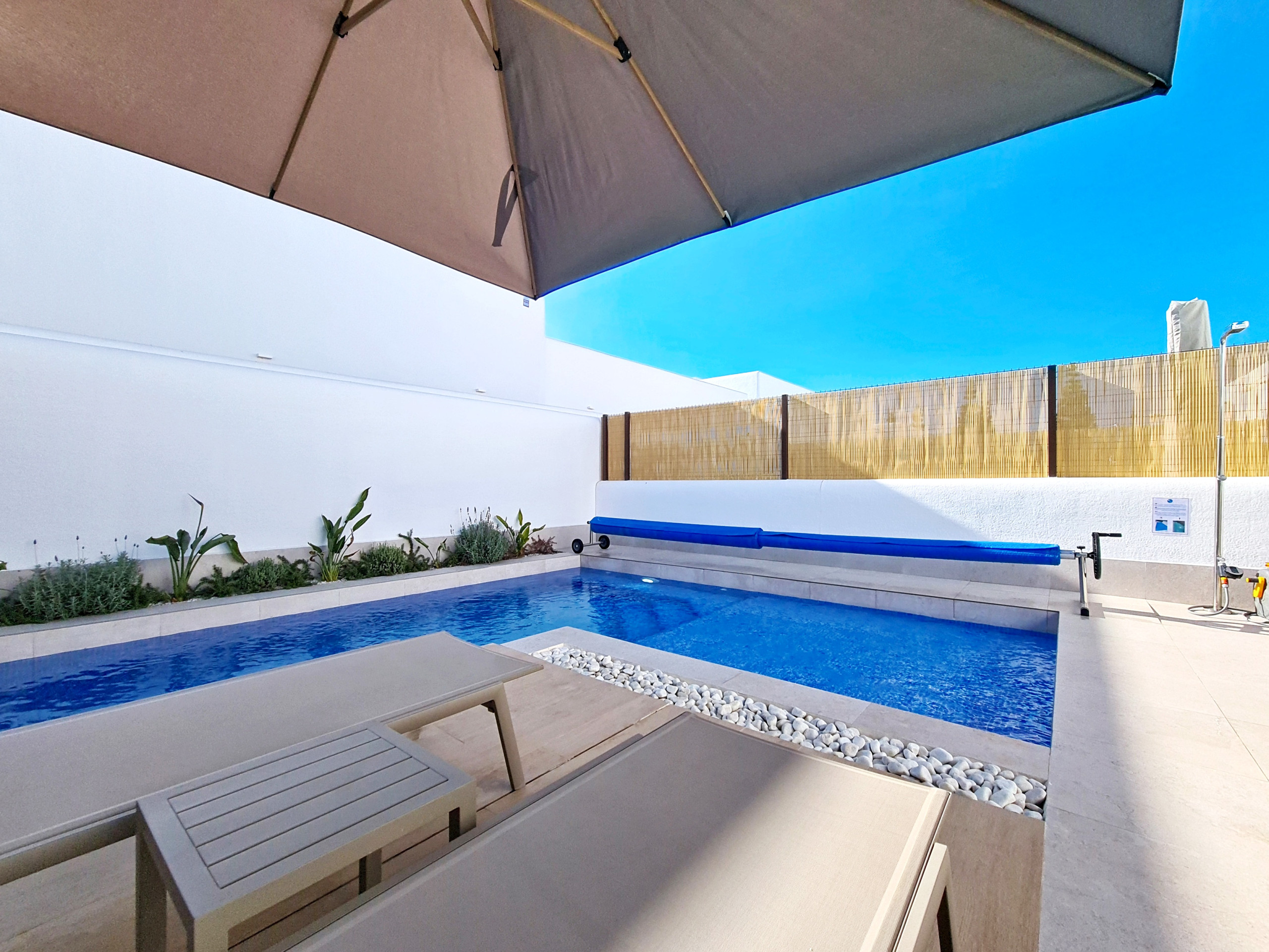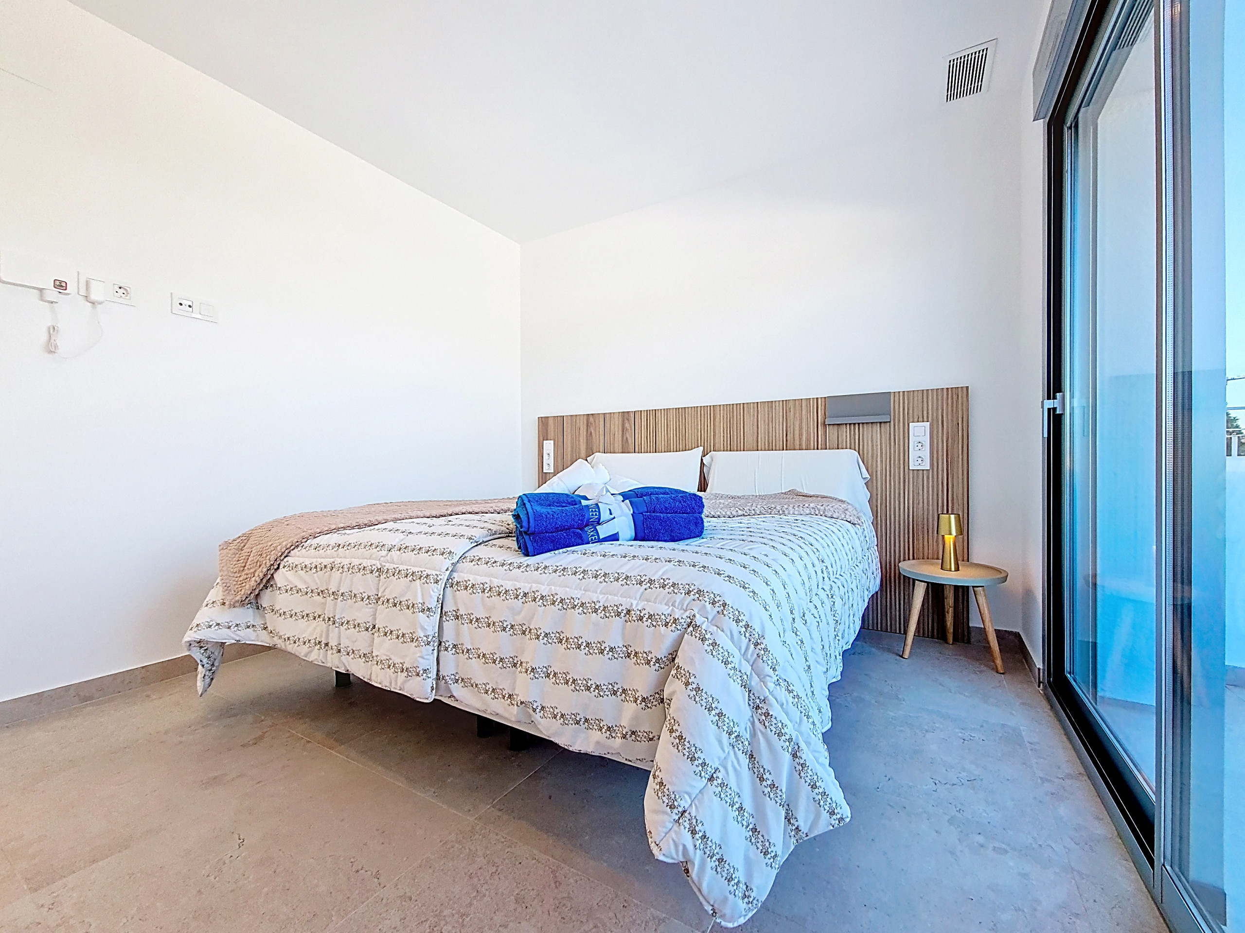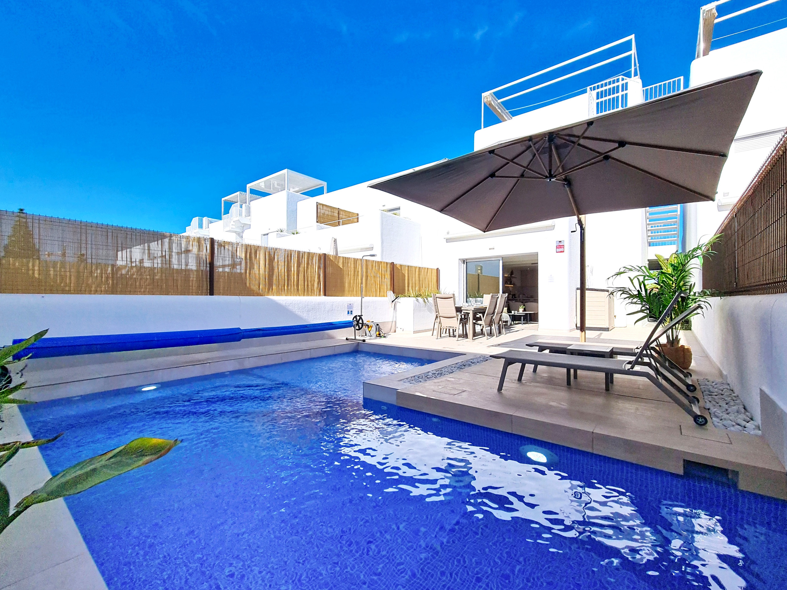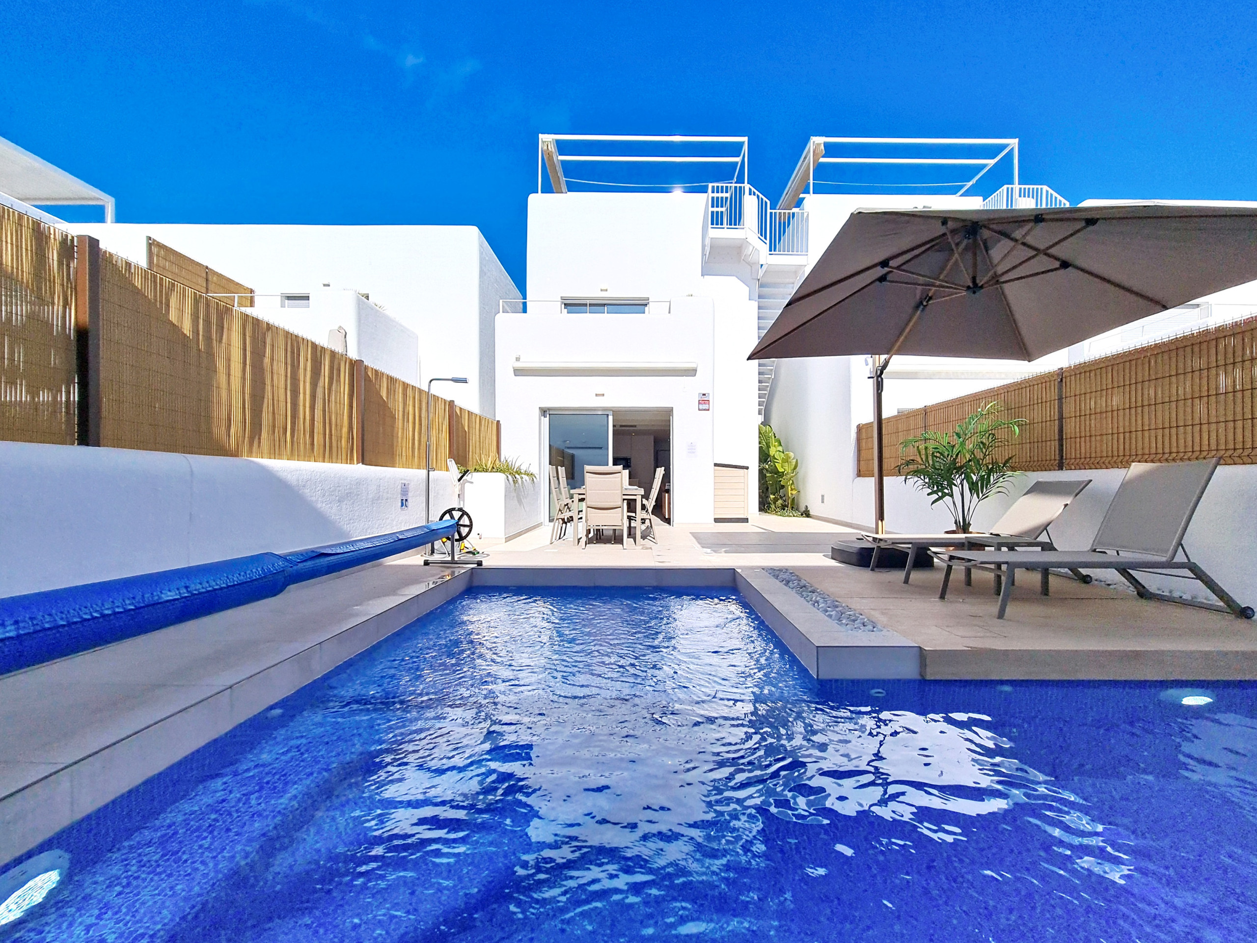 L'un des atouts majeurs de la villa est sa terrasse privée sur le toit, aménagée avec un coin salon confortable, une grande table à manger et un barbecue : un lieu idéal pour se détendre, recevoir des invités ou profiter de longs après-midi paisibles sous le soleil espagnol.