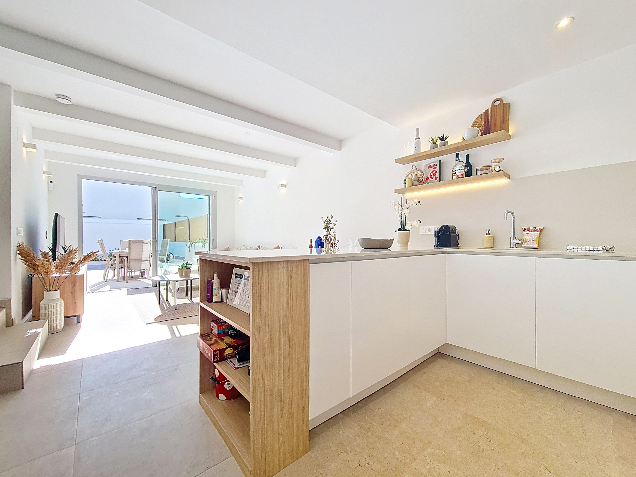 Le rez-de-chaussée présente une disposition ouverte et lumineuse, avec une cuisine élégante et entièrement équipée donnant sur l'espace repas et le salon. Un espace de service sous l'escalier abrite un lave-linge, tandis que le salon confortable avec des sièges douillets et une Smart TV est parfait pour se détendre après une journée au soleil.