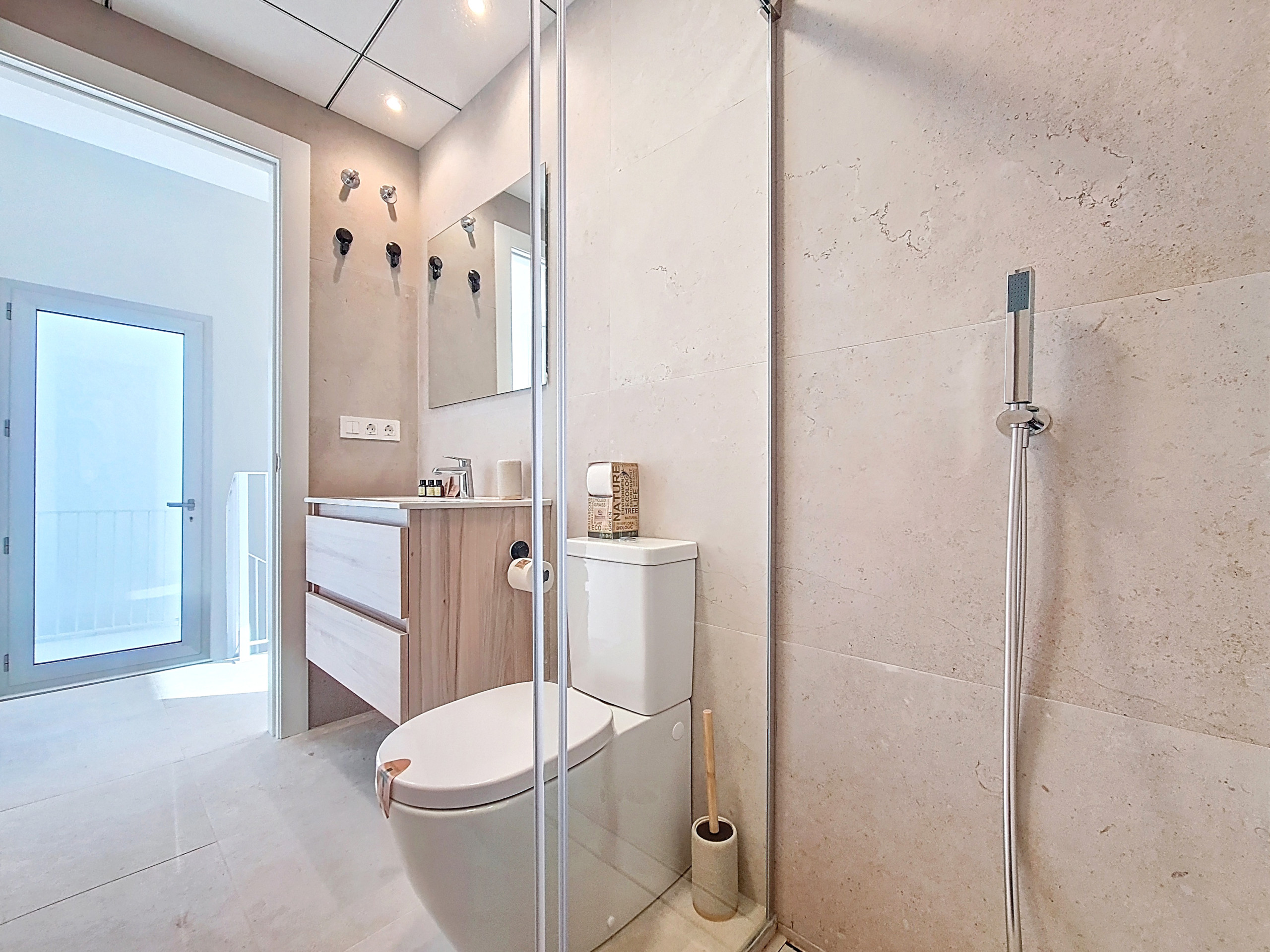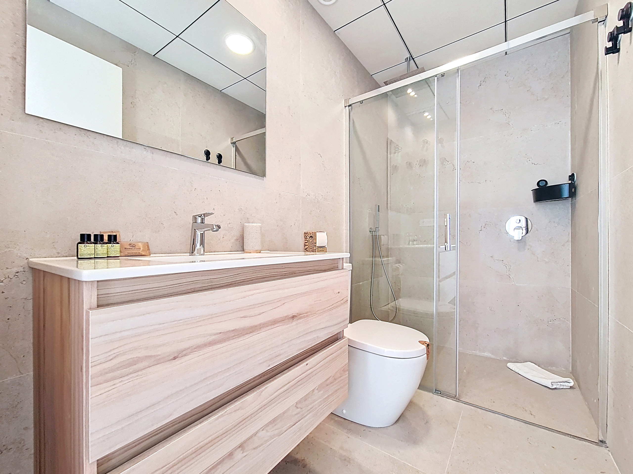 La chambre principale, située au rez-de-chaussée, dispose d'un accès direct à une salle de bains privative moderne avec douche à l'italienne, également accessible depuis le couloir, ce qui est pratique pour les personnes séjournant dans la chambre du rez-de-chaussée. Deux autres chambres sont situées à l'étage et partagent une salle de bains moderne, également équipée d'une douche à l'italienne. Chaque chambre possède sa propre terrasse privée offrant une vue imprenable sur les environs.