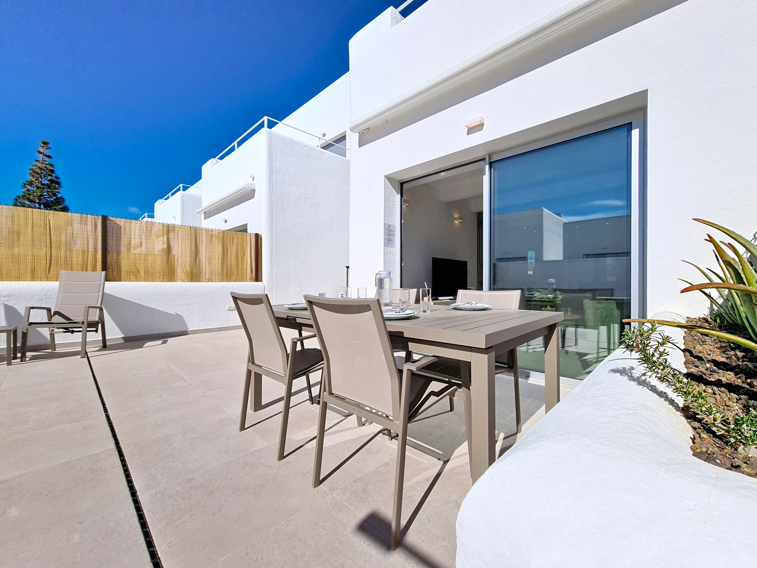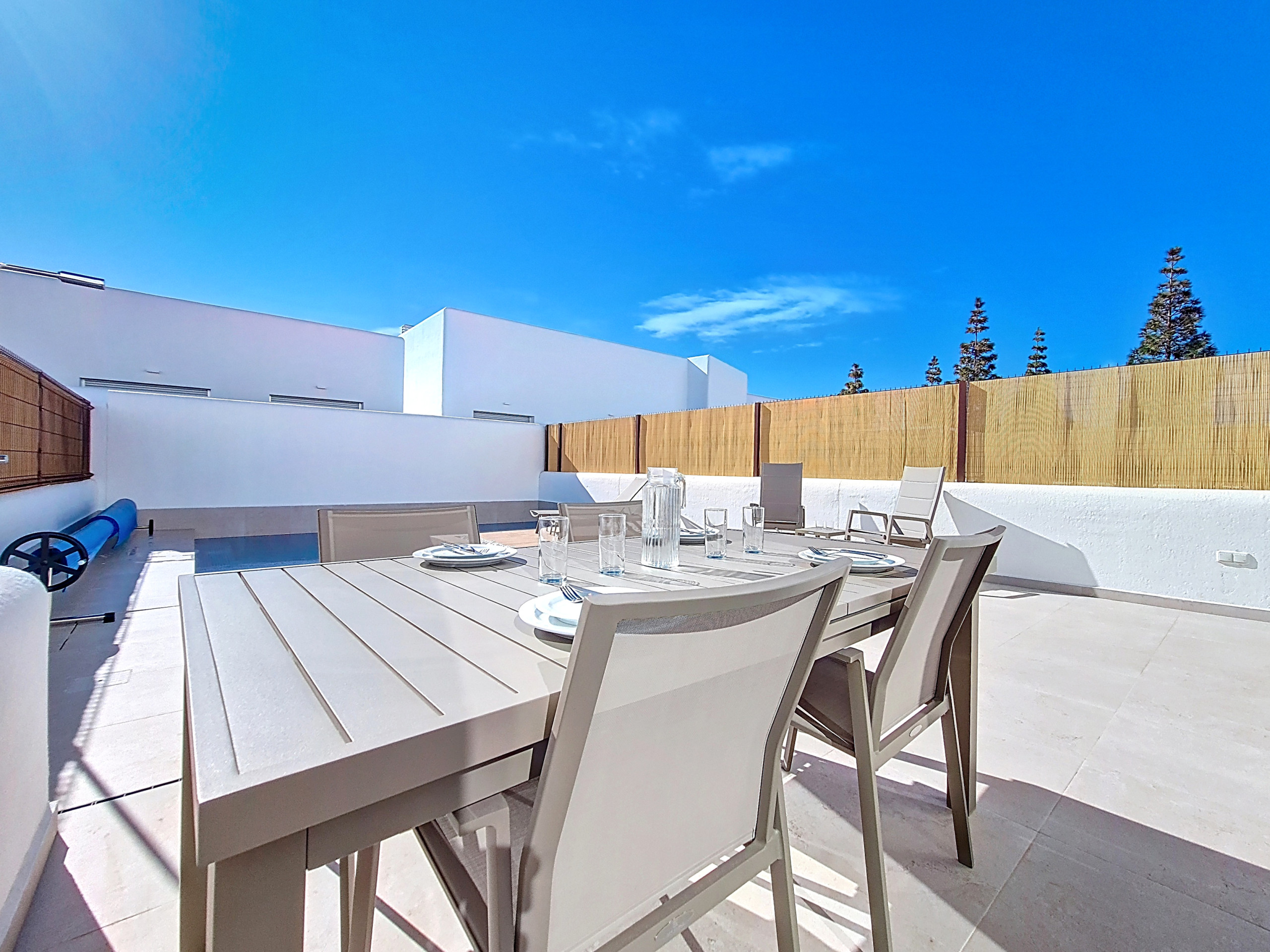 À l'extérieur, la piscine privée en forme de L est située dans un espace de jardin bien conçu, offrant des chaises longues pour se détendre au soleil ainsi qu'une table et des chaises pour profiter des repas en plein air. Cette zone accueillante est idéale pour tout, des après-midis paresseux au bord de la piscine aux soirées conviviales passées à dîner sous le ciel espagnol.