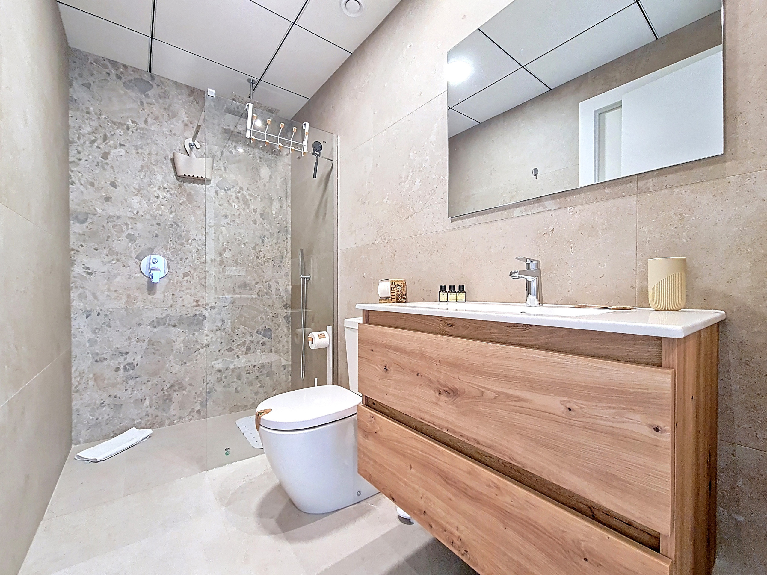 La chambre principale est située au rez-de-chaussée et est adjacente à une salle de bain contemporaine avec une douche à l'italienne, accessible depuis la chambre et le couloir, idéale pour les invités de tous âges. À l'étage, deux autres chambres partagent une salle de bain centrale élégante avec une douche à l'italienne, accessible via des portes coulissantes séparées depuis chaque chambre. Les deux chambres à l'étage bénéficient également de leur propre balcon privé, chacun meublé d'une petite table et de chaises, parfait pour un café du matin ou un moment de tranquillité en extérieur.