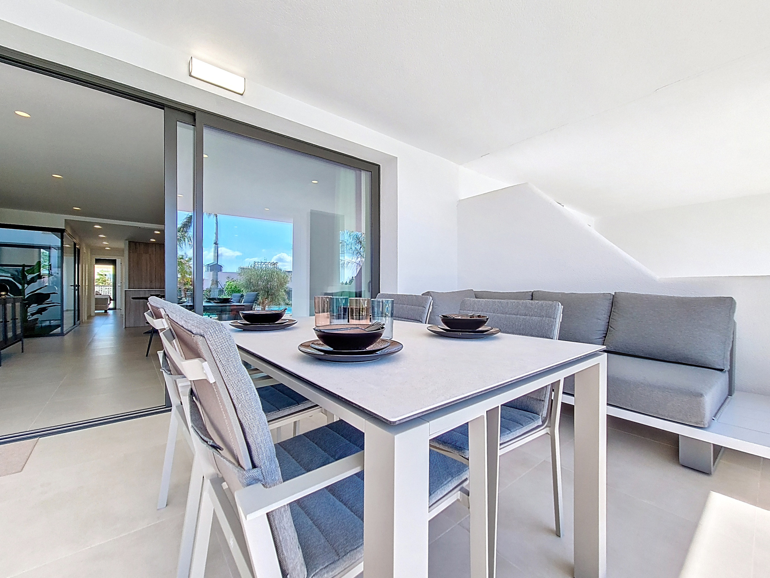 De comfortabele woonkamer heeft schuifdeuren die uitkomen op de kleine maar charmante patio. Deze privé-buitenruimte is een geweldige plek om te ontspannen, er staat een moderne tafel en stoelen waar comfortabel vier personen aan kunnen zitten. Het is een geweldige plek om te zitten en te genieten van de mediterrane zon of om 's avonds te ontspannen met een drankje. Het appartement ligt op slechts twee minuten lopen van het prachtige strand waar u op uw gemak kunt genieten van zon, zee en zand.