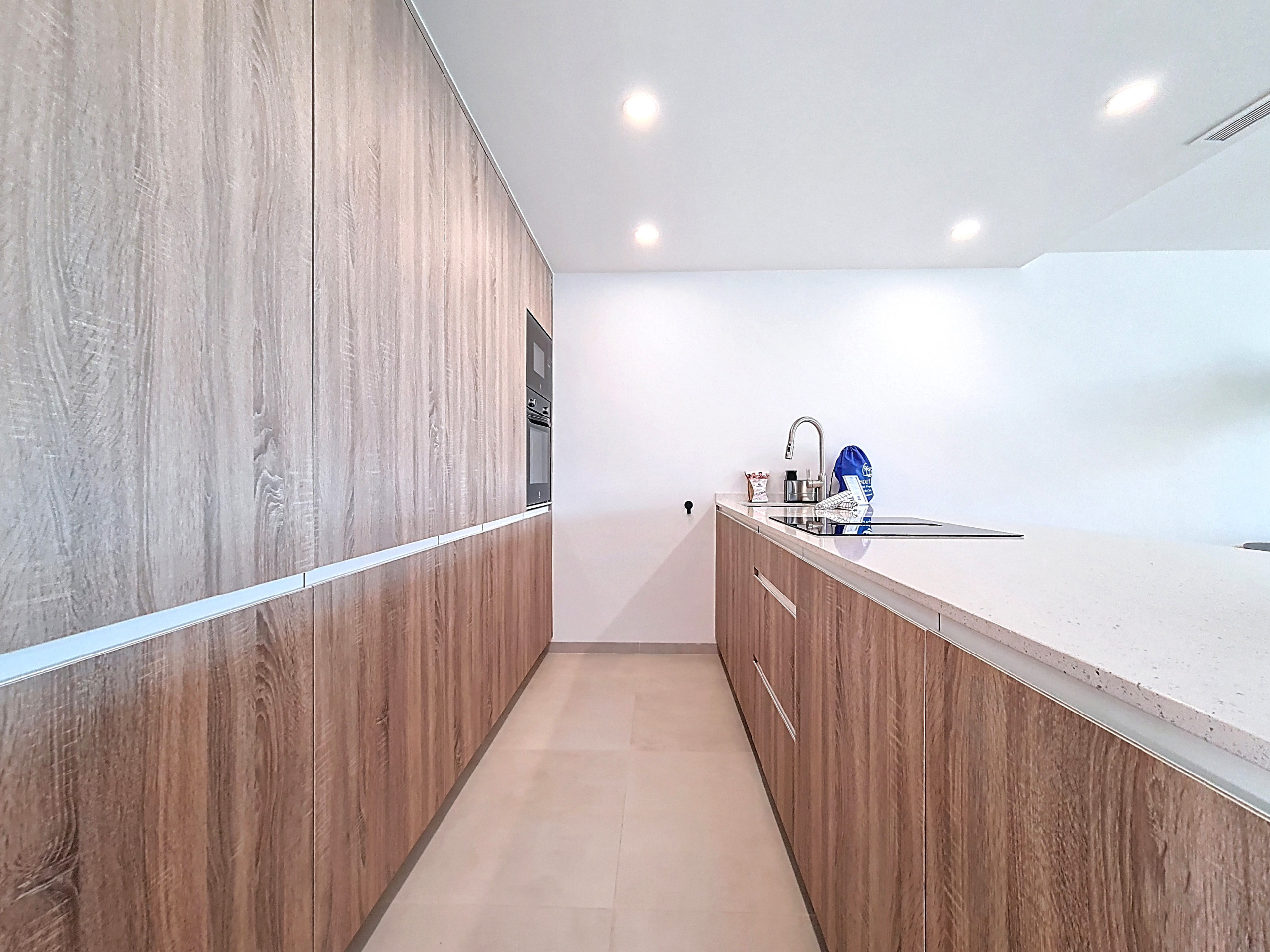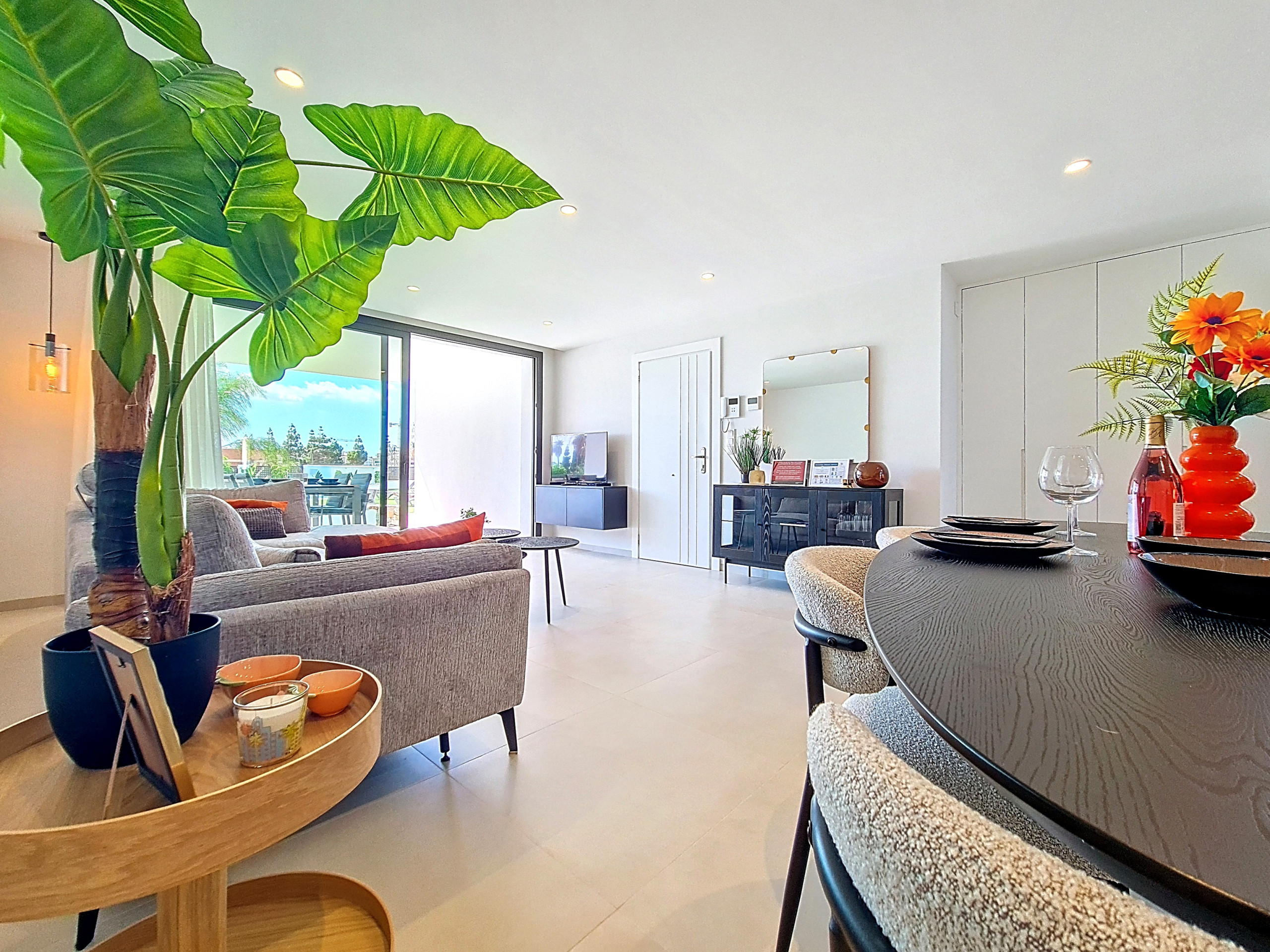 Dit appartement biedt een gastvrije en huiselijke sfeer, waardoor het de perfecte plek is om te ontspannen na een dag verkennen of luieren op het strand. De open woonruimte is licht en luchtig, met een gezellige loungehoek met comfortabele zitplaatsen, een flatscreen-tv en wifi. Het ontwerp van het appartement maakt optimaal gebruik van de ruimte en creëert een gevoel van openheid, terwijl de schuifdeuren die de keuken en de eetkamer scheiden flexibiliteit en privacy bieden wanneer nodig.