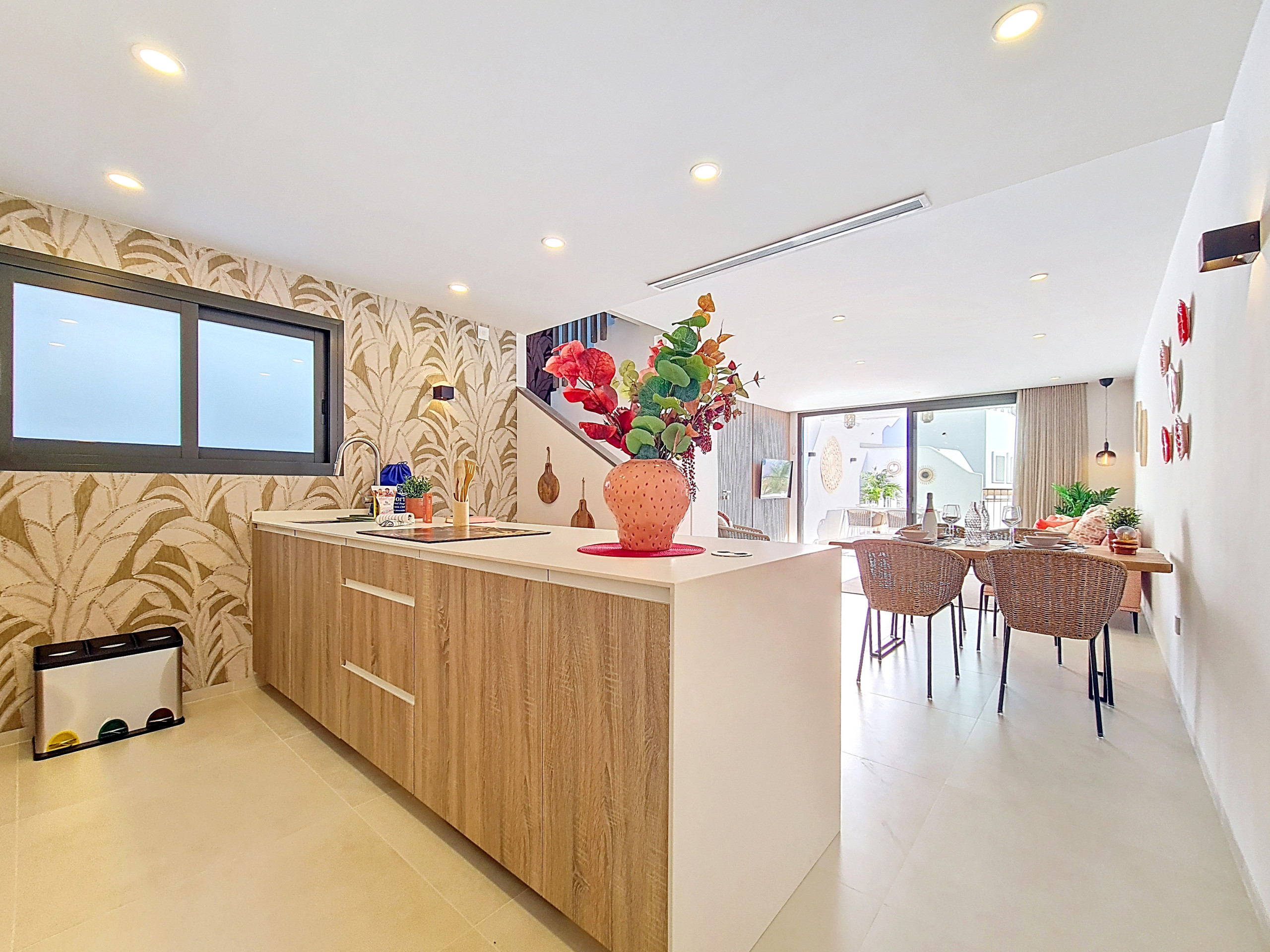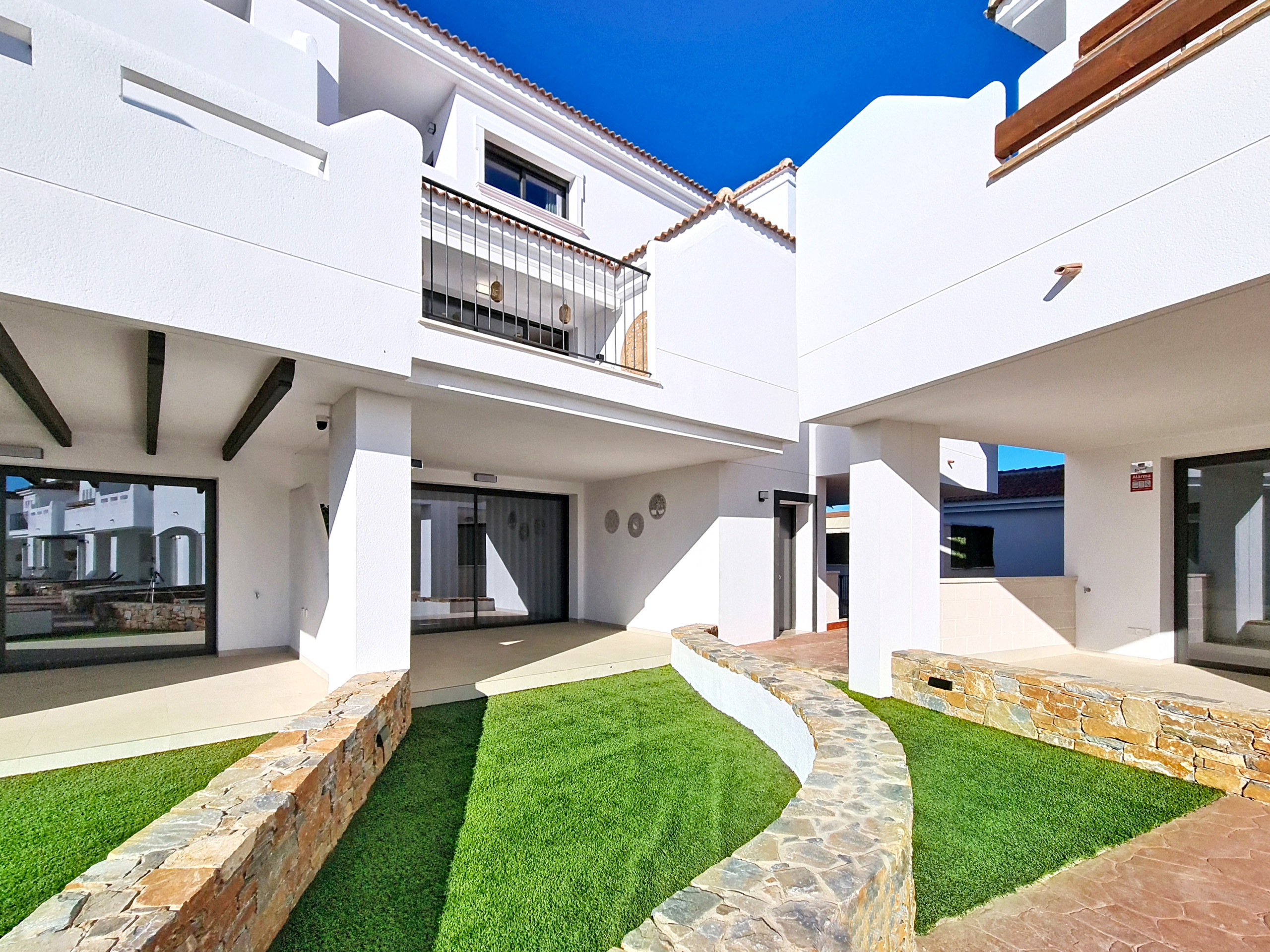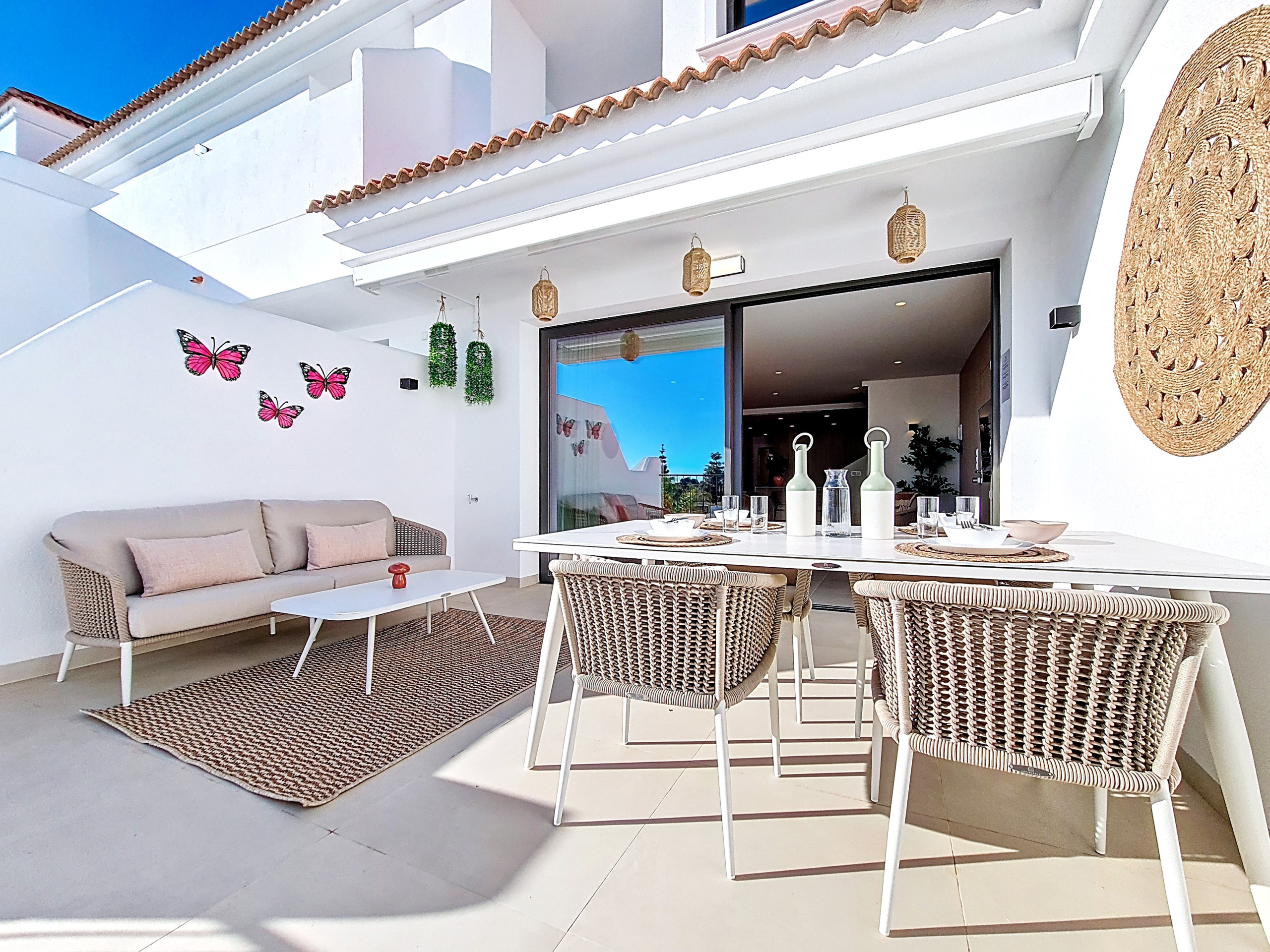 De comfortabele woonkamer heeft schuifdeuren die uitkomen op de kleine maar charmante patio. Deze privé-buitenruimte is een geweldige plek om te ontspannen, er staat een moderne tafel en stoelen waar comfortabel vier personen aan kunnen zitten. Het is een geweldige plek om te zitten en te genieten van de mediterrane zon of om 's avonds te ontspannen met een drankje. Het appartement ligt op slechts twee minuten lopen van het prachtige strand waar u op uw gemak kunt genieten van zon, zee en zand.