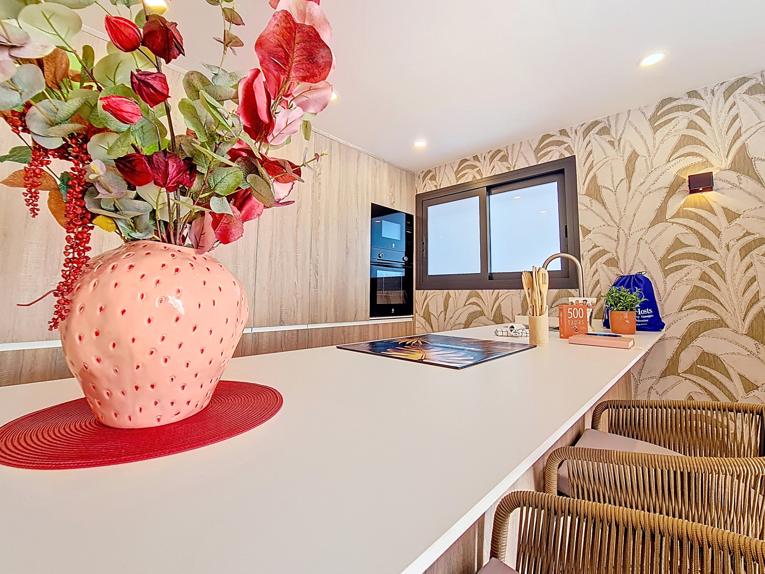 Dit appartement biedt een gastvrije en huiselijke sfeer, waardoor het de perfecte plek is om te ontspannen na een dag verkennen of luieren op het strand. De open woonruimte is licht en luchtig, met een gezellige loungehoek met comfortabele zitplaatsen, een flatscreen-tv en wifi. Het ontwerp van het appartement maakt optimaal gebruik van de ruimte en creëert een gevoel van openheid, terwijl de schuifdeuren die de keuken en de eetkamer scheiden flexibiliteit en privacy bieden wanneer nodig.
