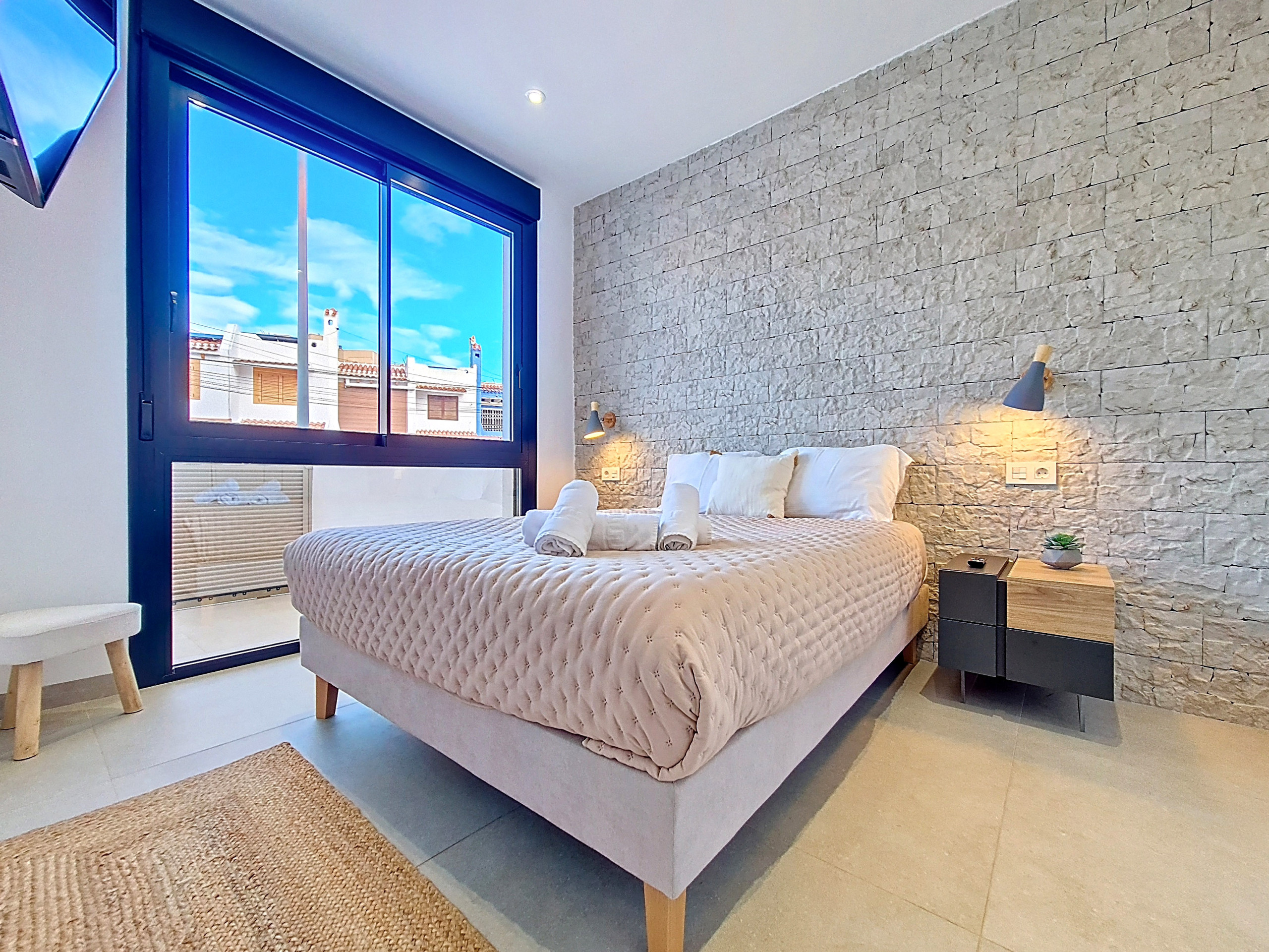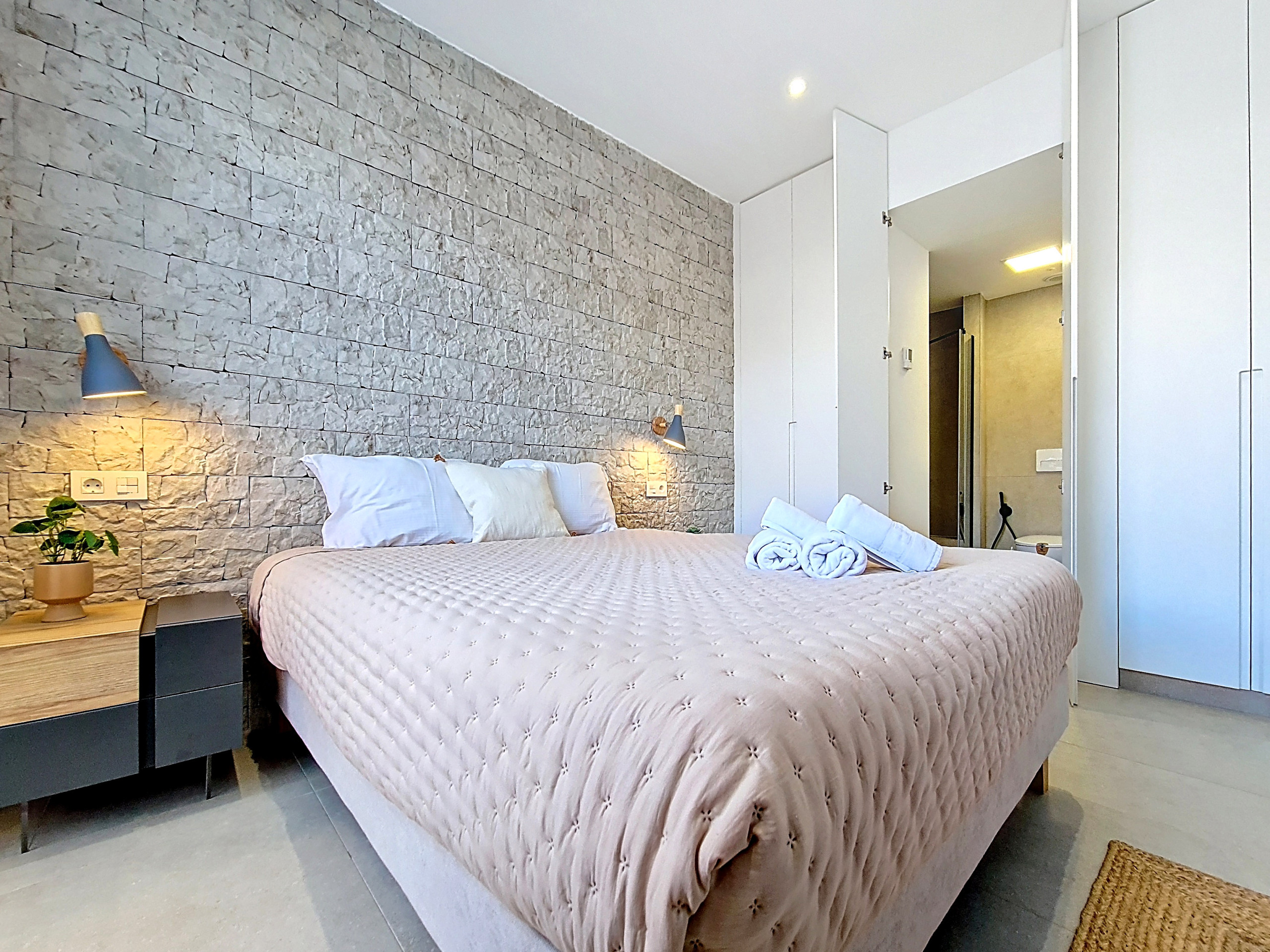 De hoofdslaapkamer is modern en stijlvol, met een volledig weggewerkte en-suite badkamer die naadloos is geïntegreerd in de kledingkast. De badkamer is voorzien van een inloopdouche, wat zorgt voor een schone en opgeruimde ruimte. De tweede slaapkamer is eveneens fraai ingericht en biedt voldoende opbergruimte. Beide slaapkamers zijn voorzien van een televisie.