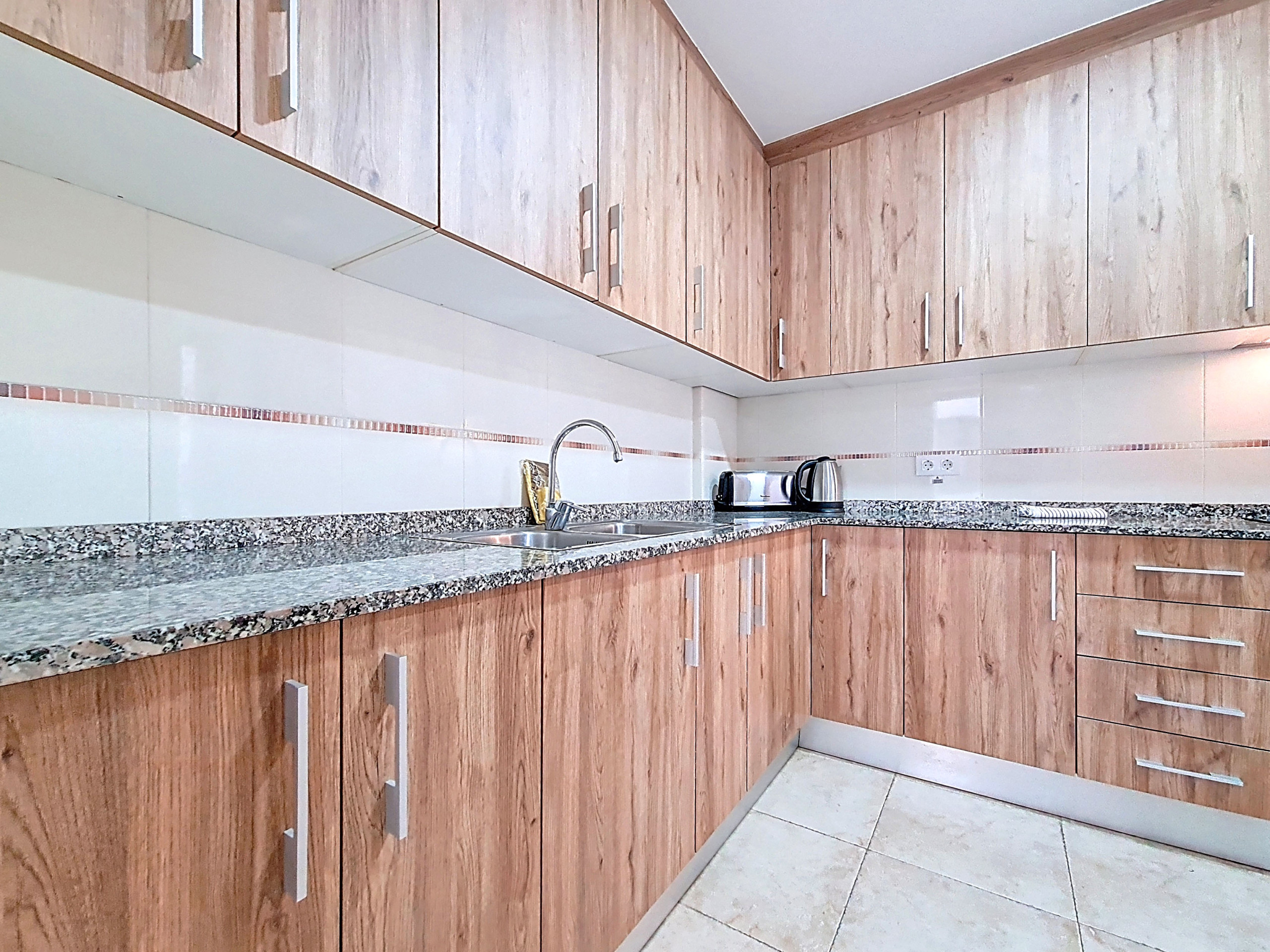 Een grote aparte keuken biedt alles wat nodig is voor een comfortabel verblijf, inclusief een magnetron en wasmachine, samen met voldoende opslag- en voorbereidingsruimte. Vanuit de keuken is er toegang tot een kleine, afgesloten buitenruimte.